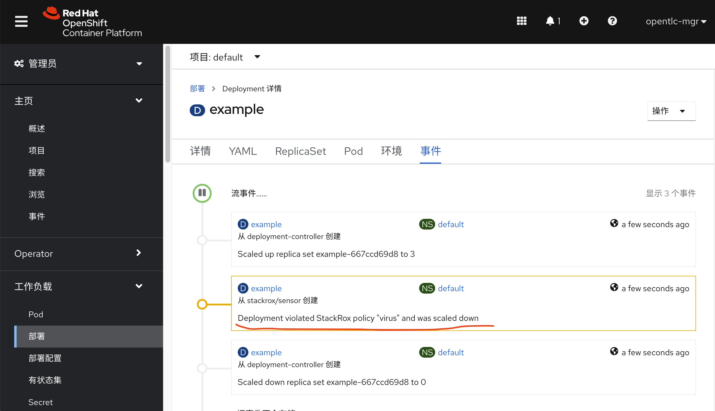 这里是配置生效以后(要有点下发的时间,如果集群比较繁忙的话),ACS阻止有漏洞的镜像运行的效果。