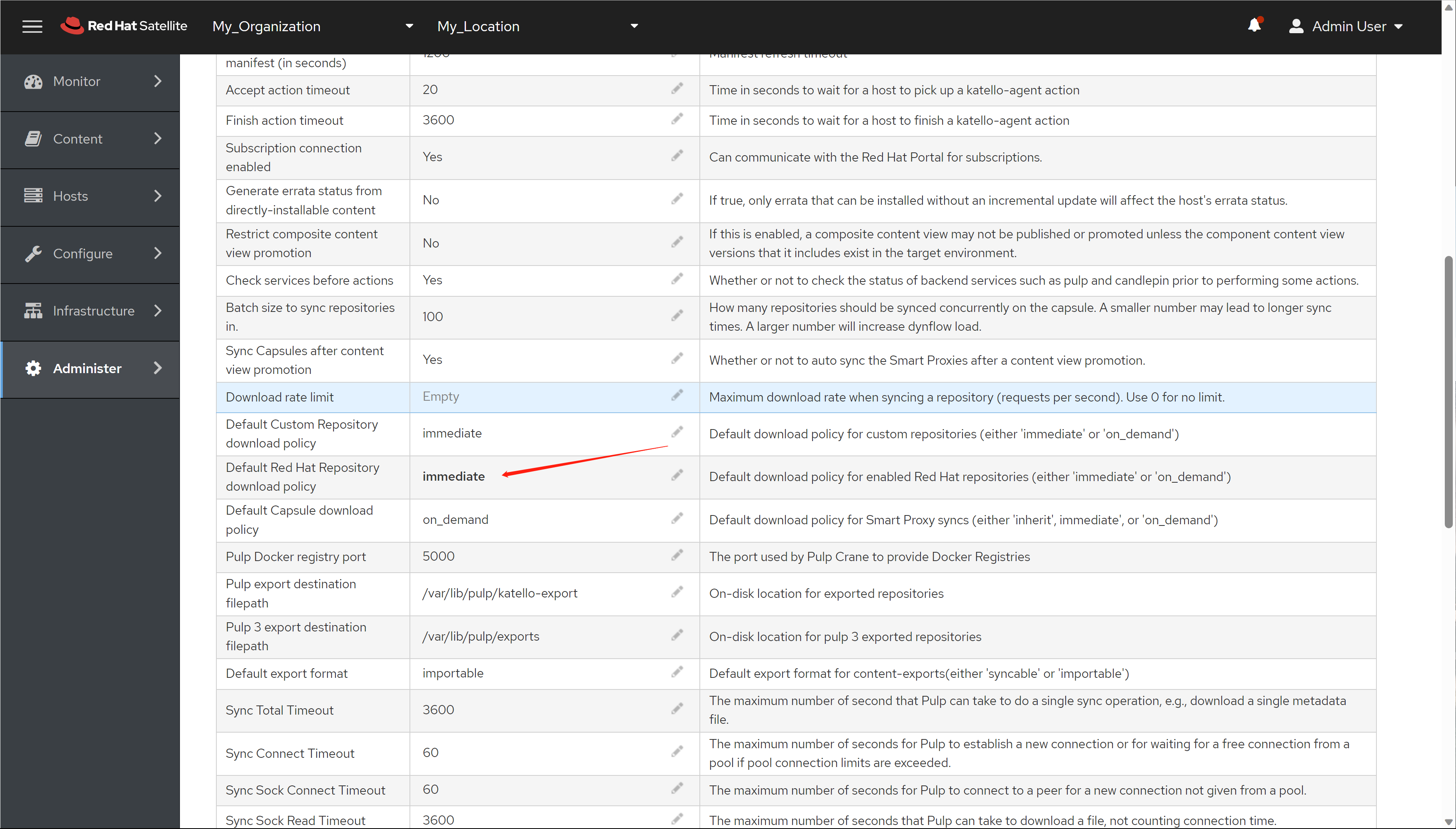我们实验的目的,就是配置一个yum repo 镜像源出来,但是默认satellite使用的是on demand 的方式来下载 rpm,我们希望让他一气呵成,主动提前的下载好,那么需要做一个配置。