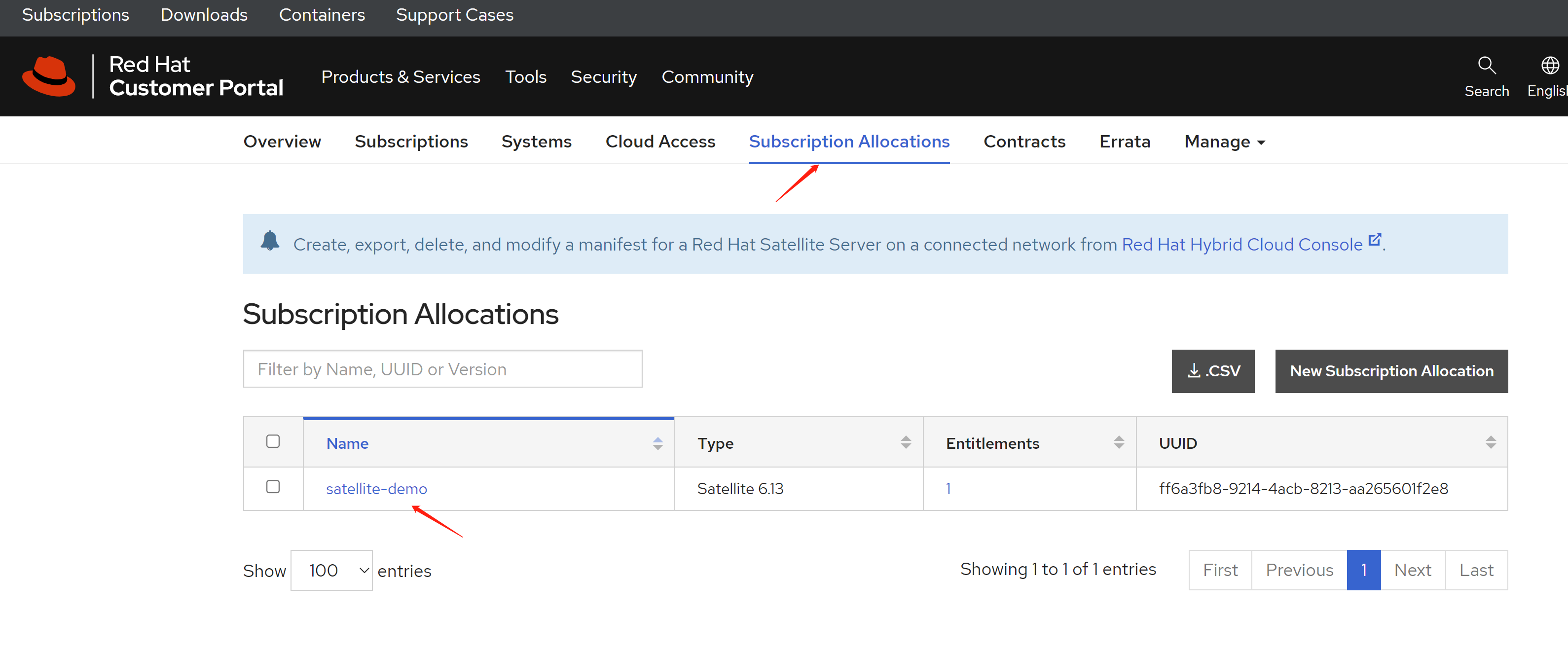 首先,我们要去红帽官网,创建一个订阅分配,如果我们有100个订阅,都要用到satellite上,那么就分配100个来。我们做实验,就分配1个,后面好实验超用,还有添加数量的场景。