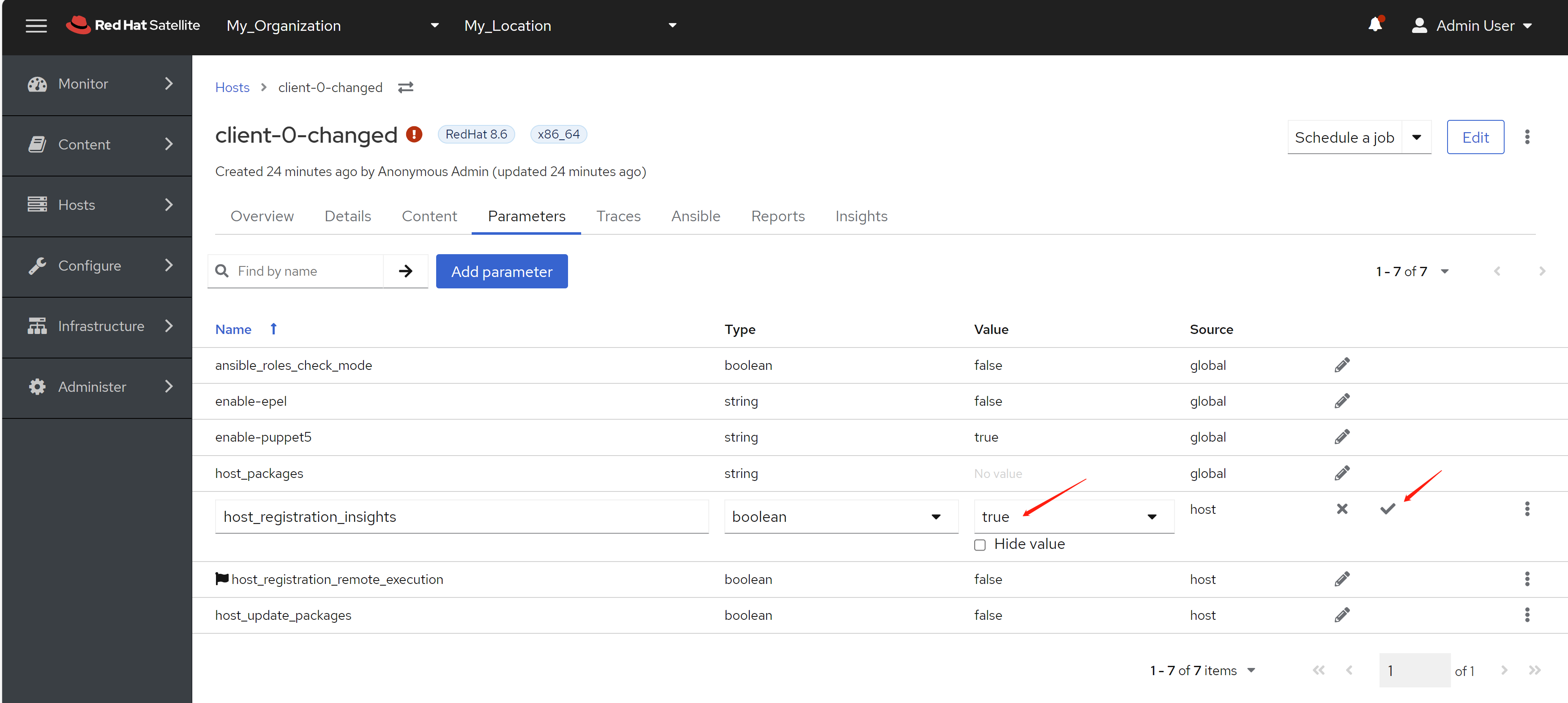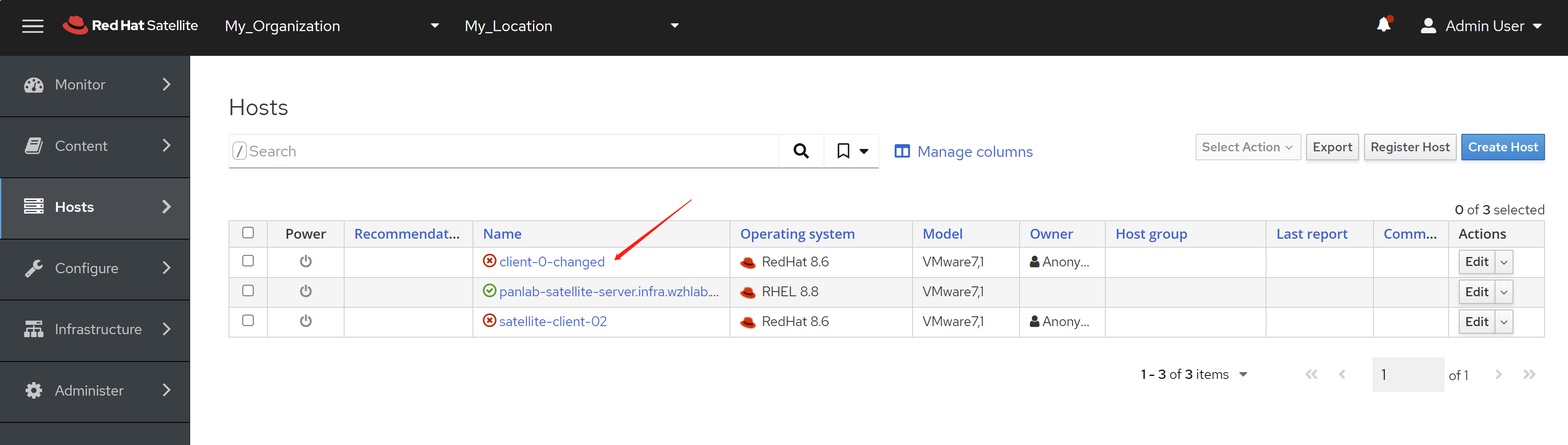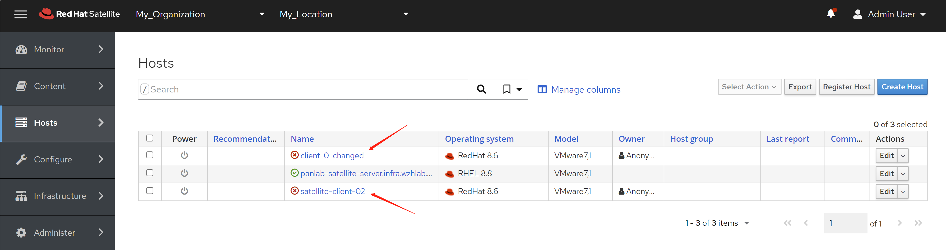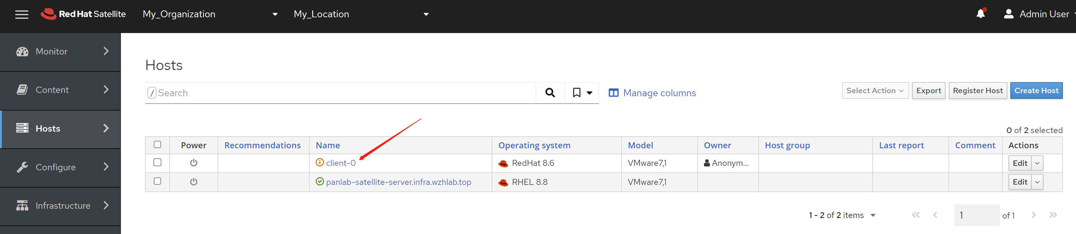# The DMI UUID of this host (8DF84D56-895F-6163-962B-30EF44BDE122) matches other registered hosts: satellite-client-02 (HTTP error code 422: Unprocessable Entity)好了,我们看到了结论,satellite发现,已经有一个相同的uuid主机存在,不能再注册了。我们能做的,就是先在satellite里面,把现在已经存在的这个主机给删掉。