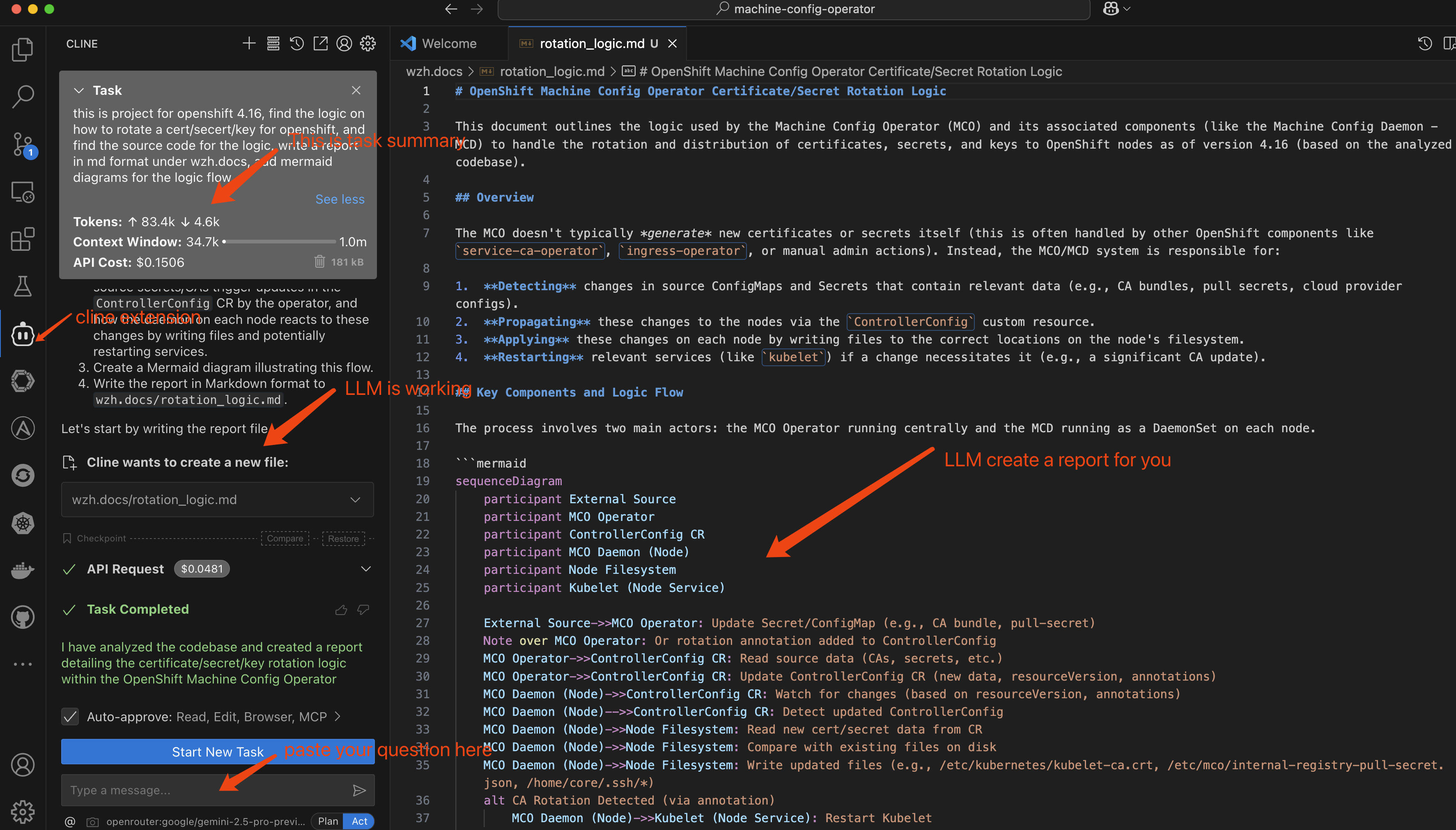 this is project for openshift 4.16, find the logic on how to rotate a cert/secert/key for openshift, and find the source code for the logic, write a report in md format under wzh.docs, add mermaid diagrams for the logic flow.The AI will analyze the codebase, search for logic related to certificate rotation, and generate a Markdown report including Mermaid diagrams (to visualize the logic flow).