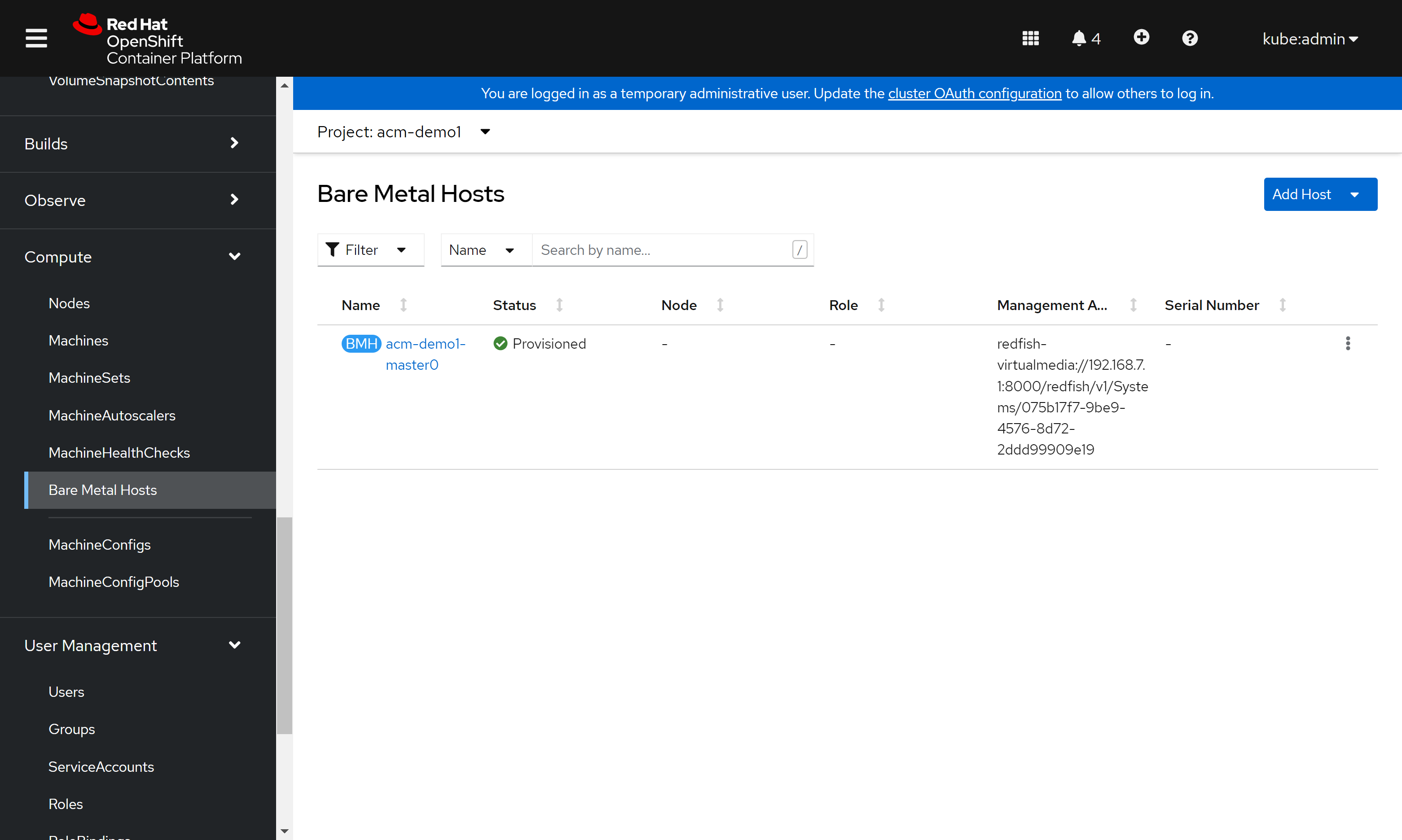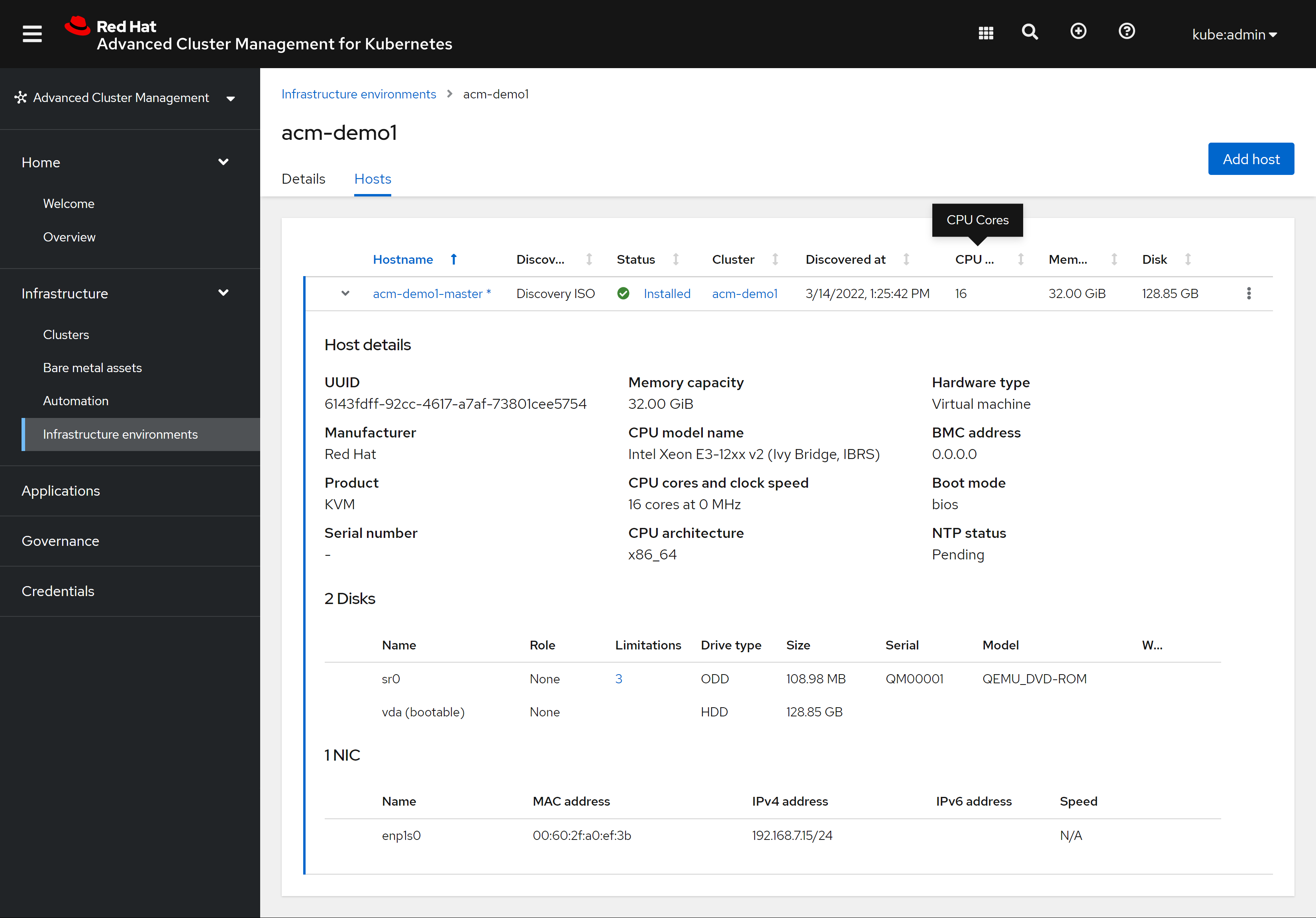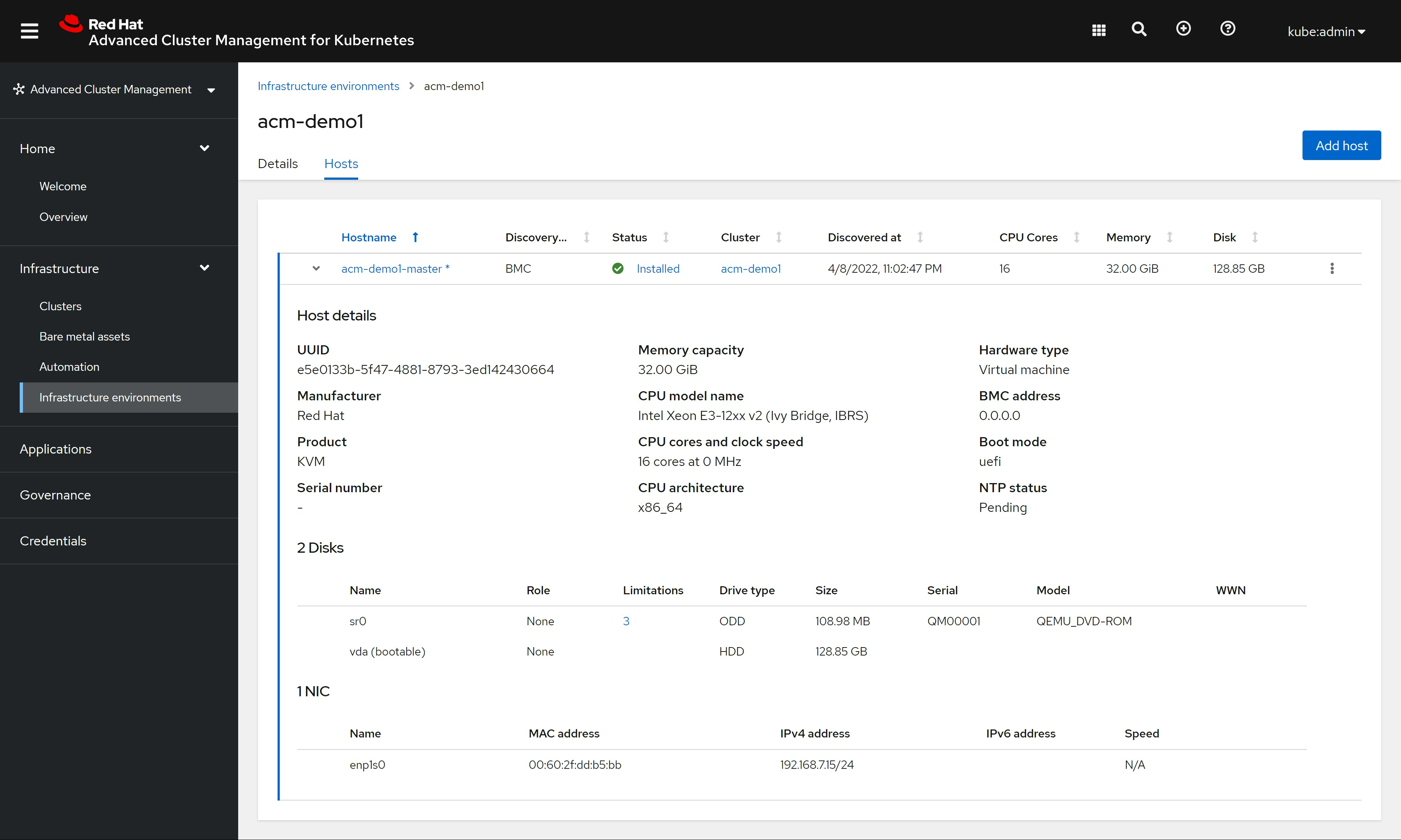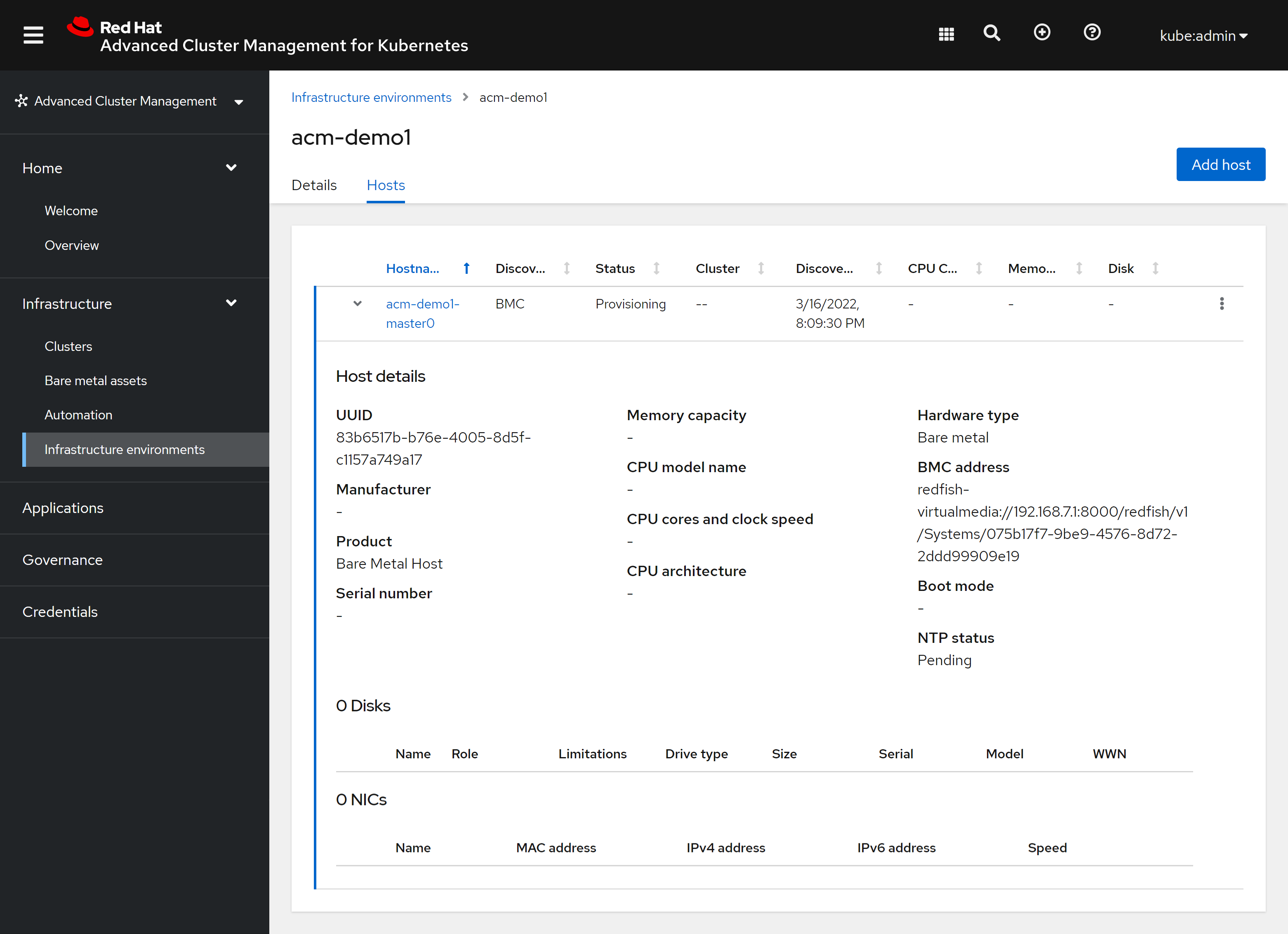 # oc delete -f /data/install/acm.demo.bmh.master.yaml我们回到ACM的界面中,能从基础架构中,看到我们新创建的HOST了,能看到ACM正在通过redfish配置这个kvm