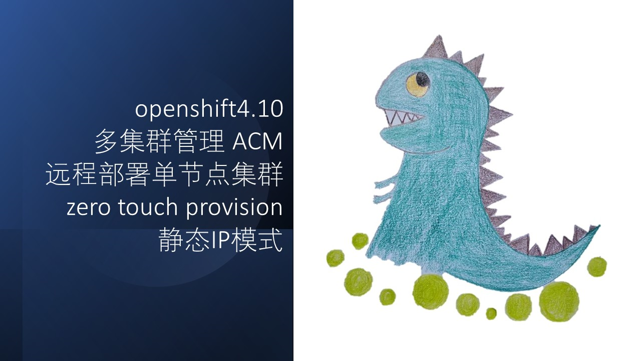 本文介绍,在openshift4.10上,装ACM组件以后,如何通过zero touch provision的方式,来部署一个单节点openshift4.10的集群(SNO),在部署的过程中,我们模拟离线的网络环境,并且禁止DHCP,只用静态IP。