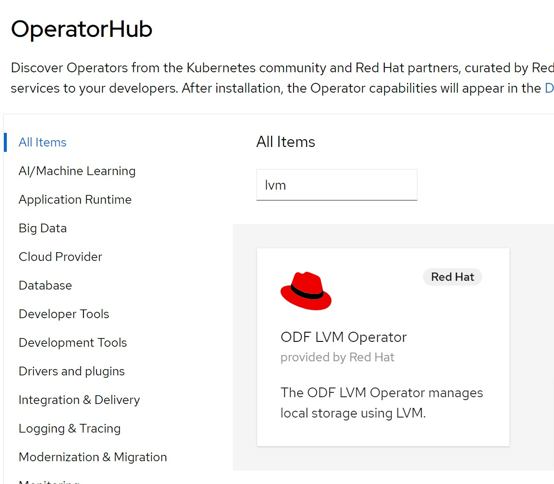 we need local storage, and we are single node openshift, so we use lvm operator, find the operator from operator hub and install :