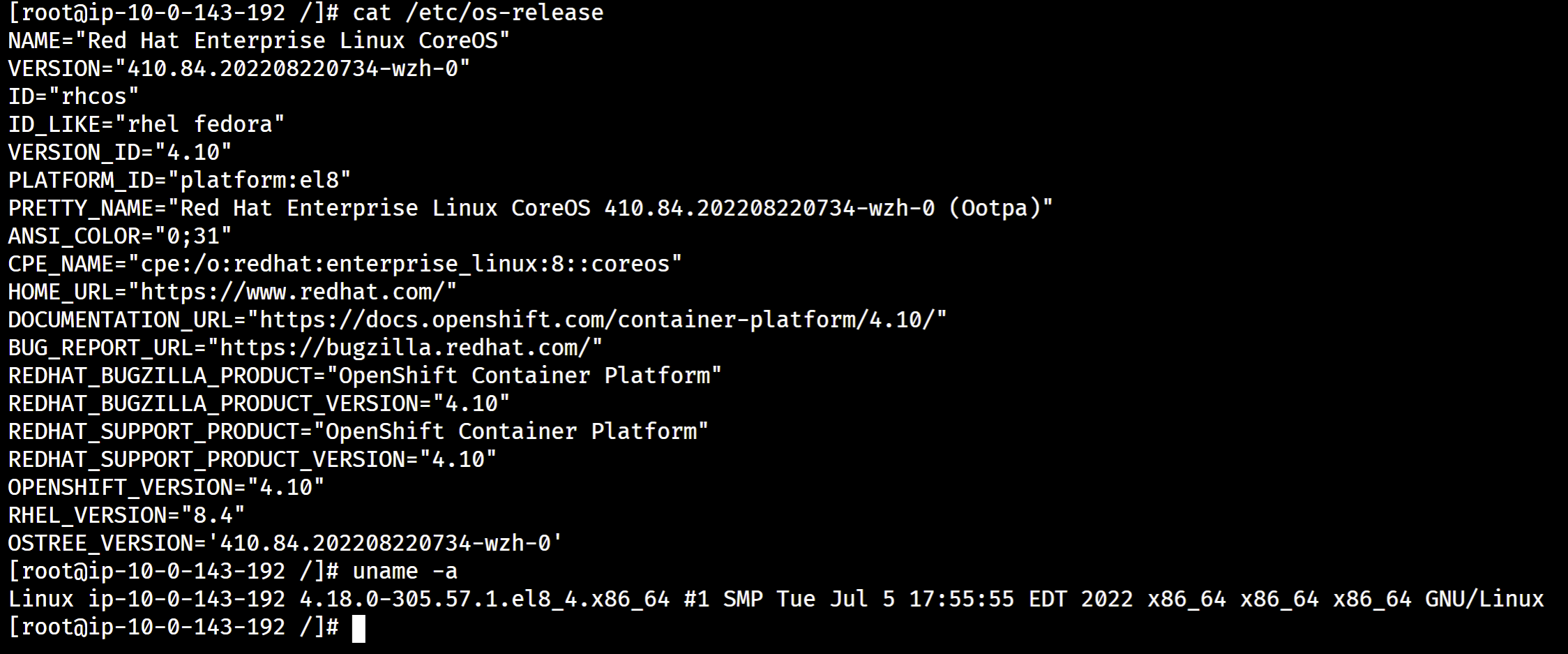 # PRETTY_NAME="Red Hat Enterprise Linux CoreOS 410.84.202208220734-wzh-0 (Ootpa)"
