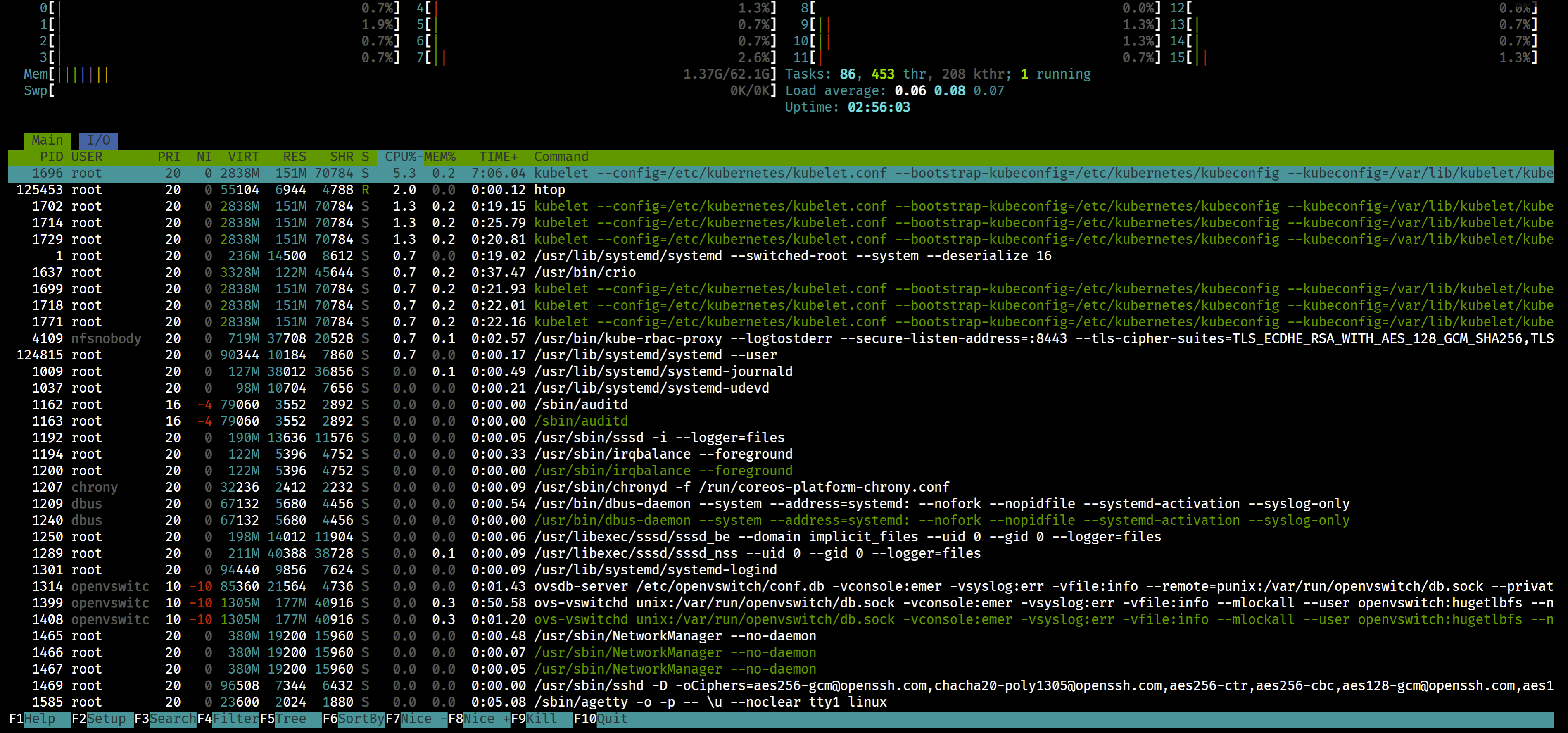 这里是在 rhcos 上直接运行 htop 的界面: