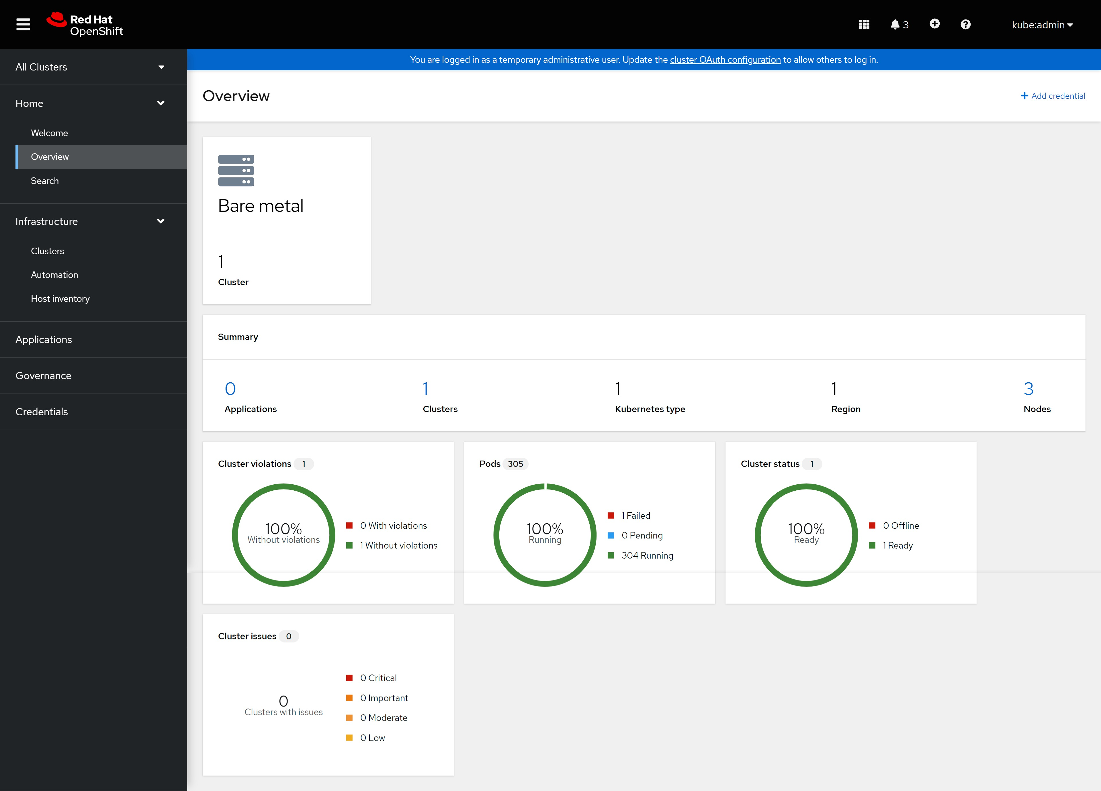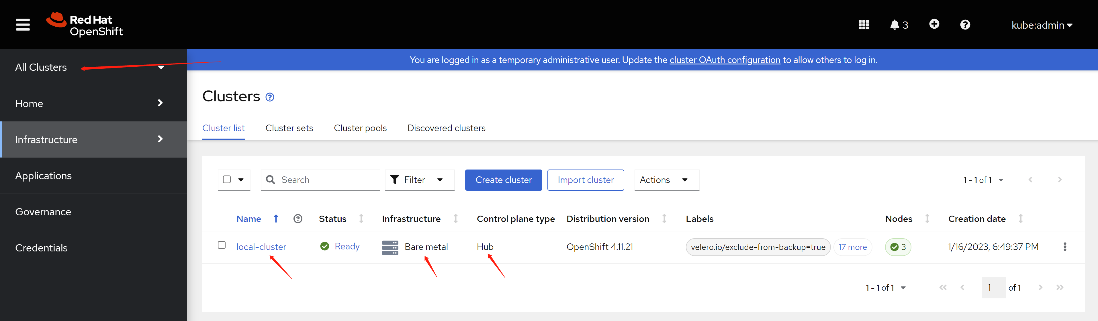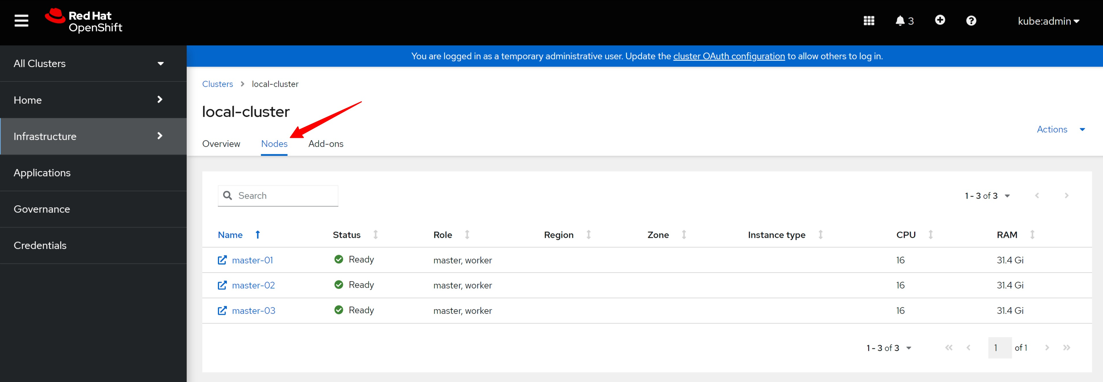 According to the installation process of the factory, we have installed openshift in 3 node IPI mode, which is an ipi compact cluster. We use this cluster as a hub cluster, and ACM components must be installed in it.