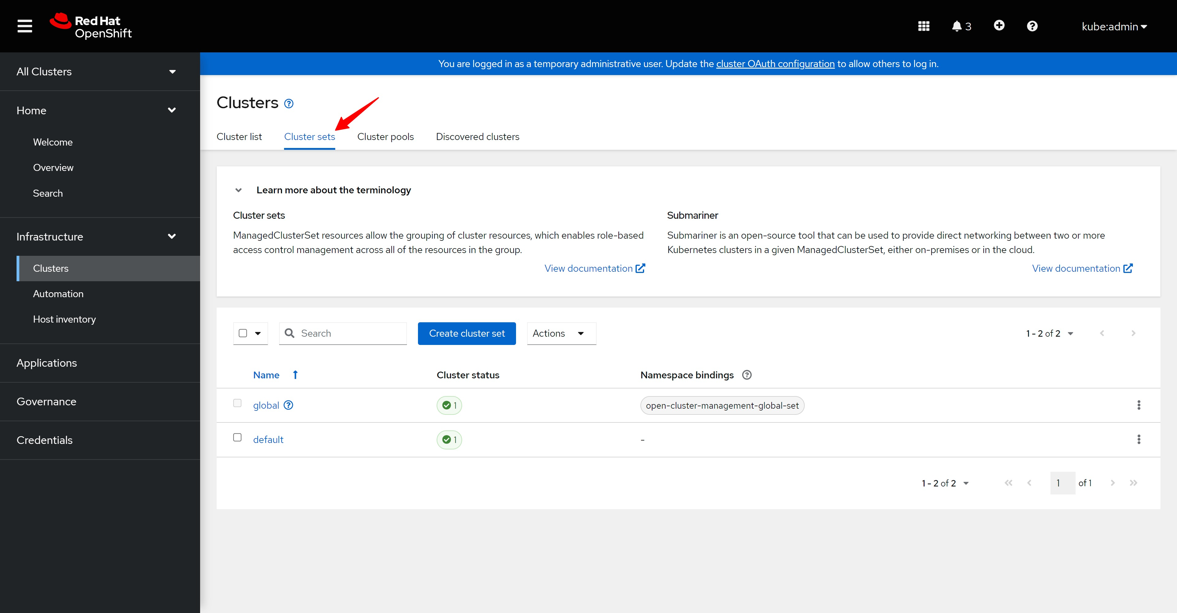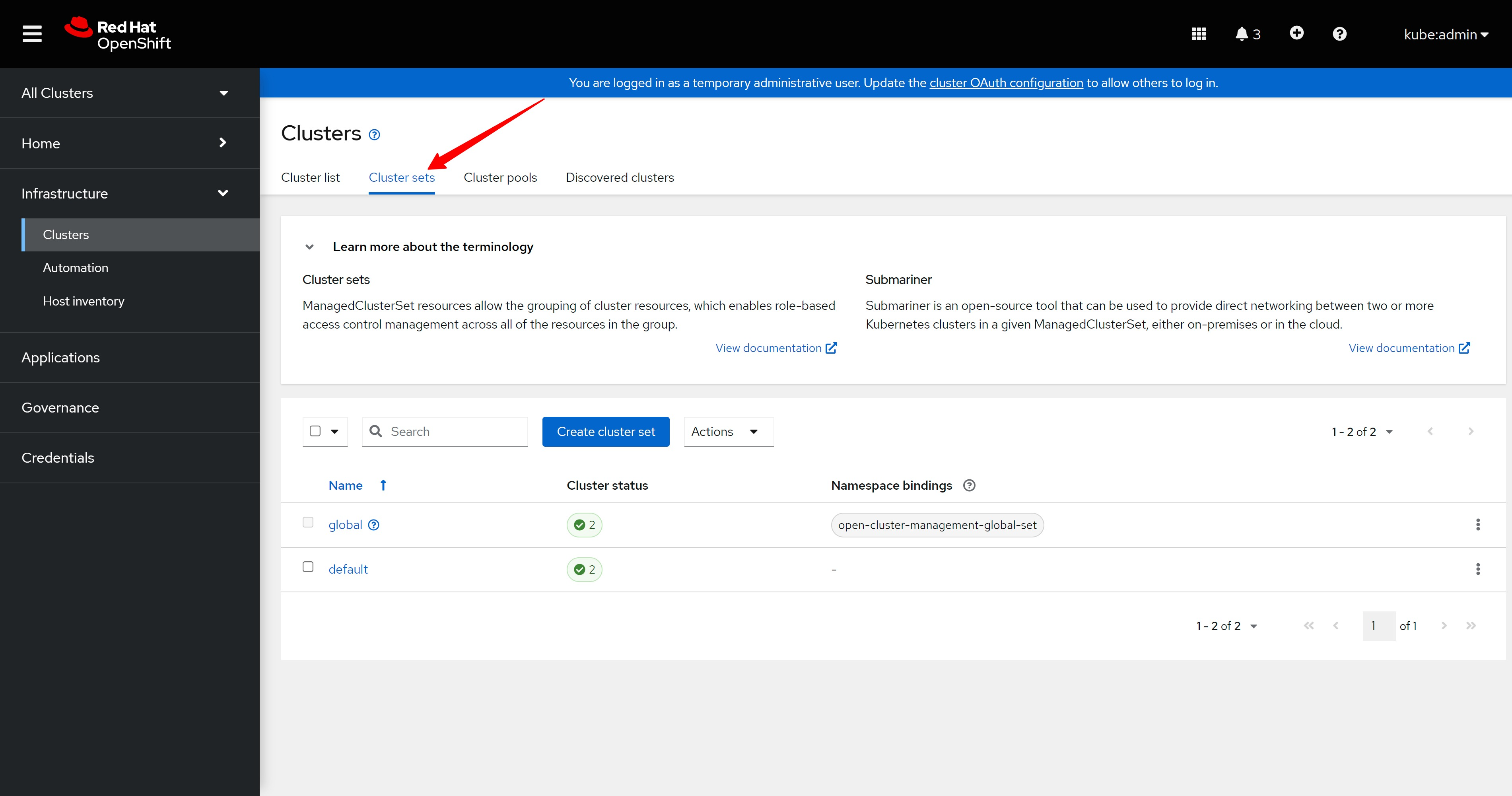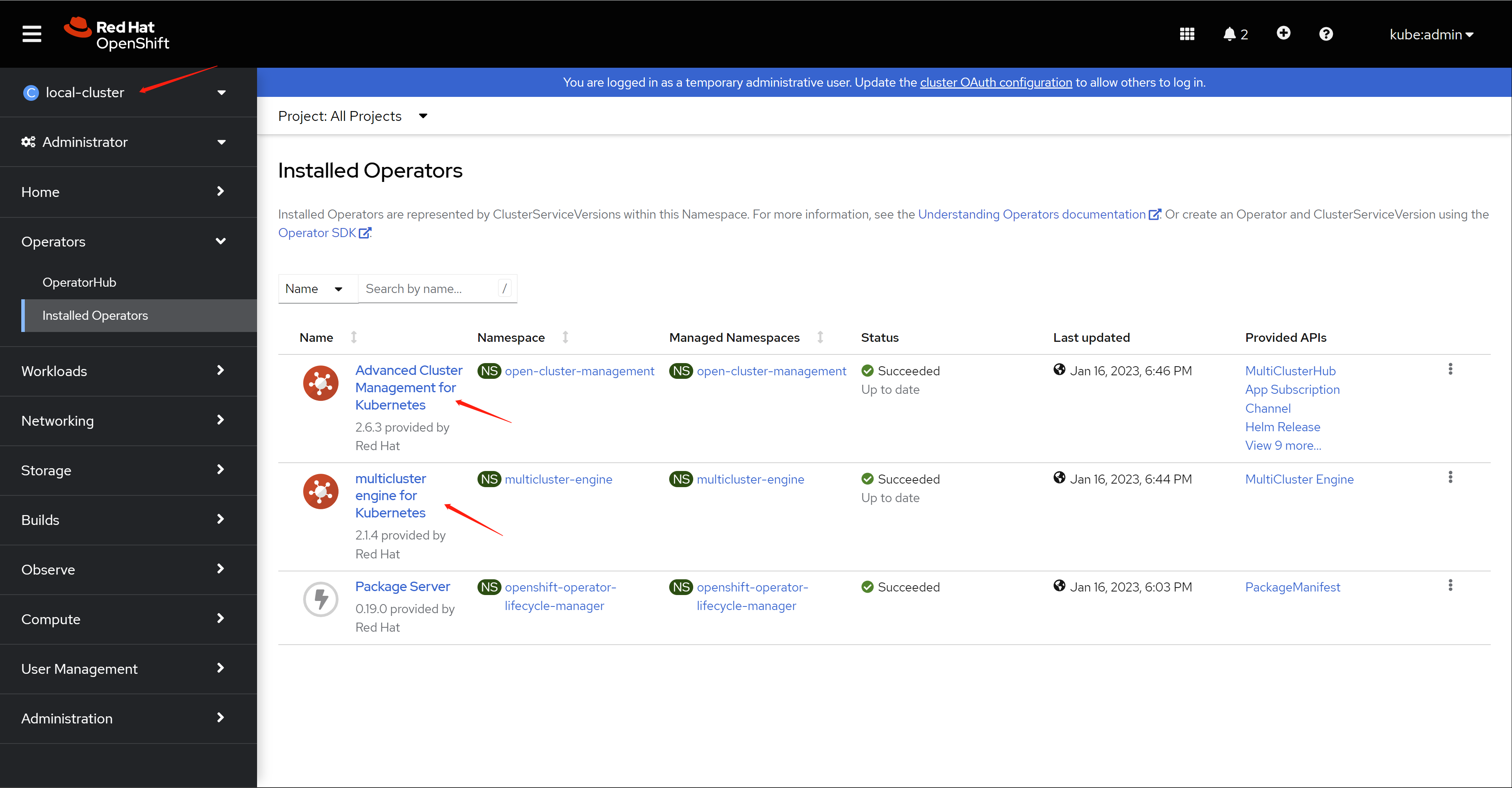 According to the installation process of the factory, we have installed openshift in 3 node IPI mode, which is an ipi compact cluster. We use this cluster as a hub cluster, and ACM components must be installed in it.