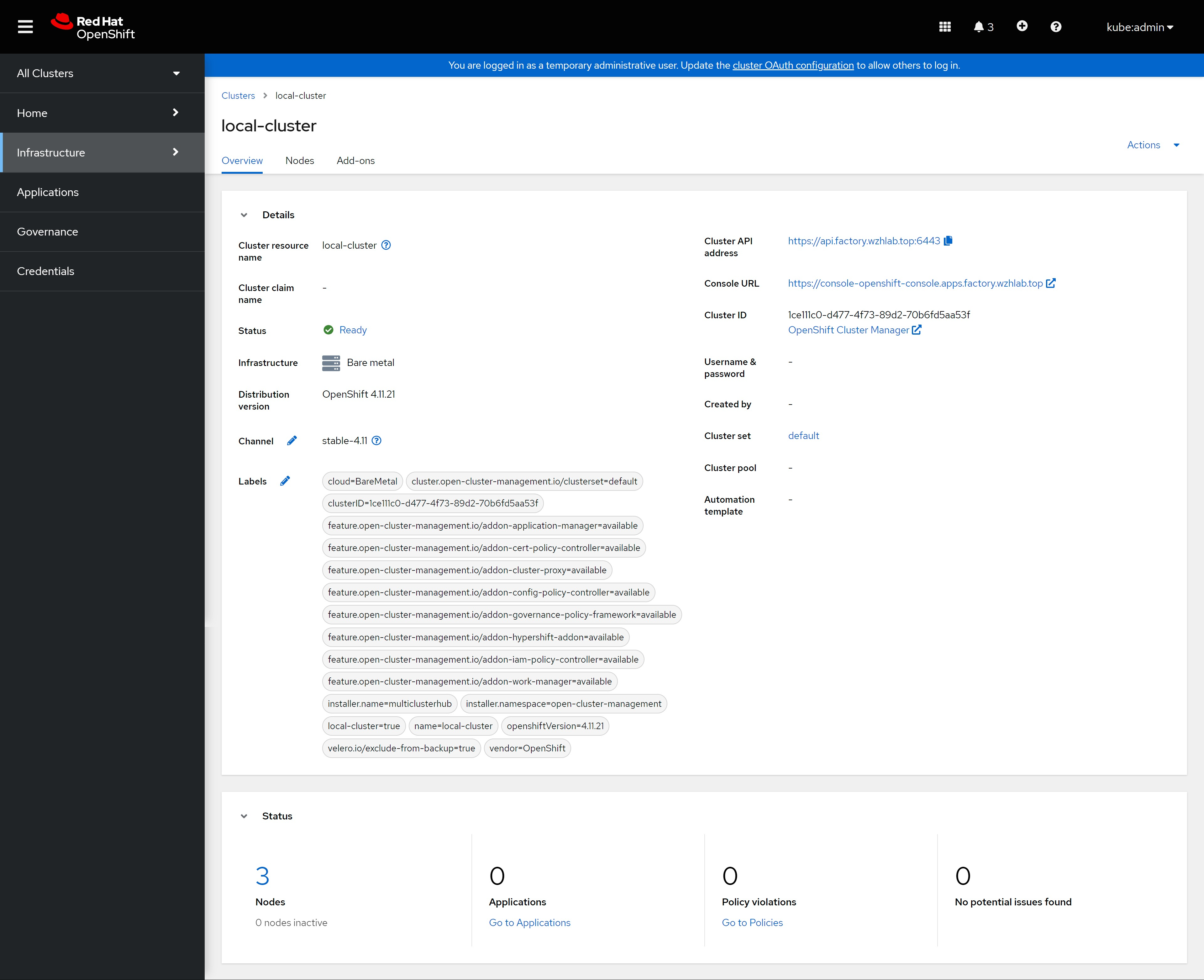 根据factory的安装过程,我们弄了一个 3 node IPI 模式安装的 openshift, 是一个 ipi 的 compact cluster. 我们把这个集群作为hub集群,里面要装ACM组件。