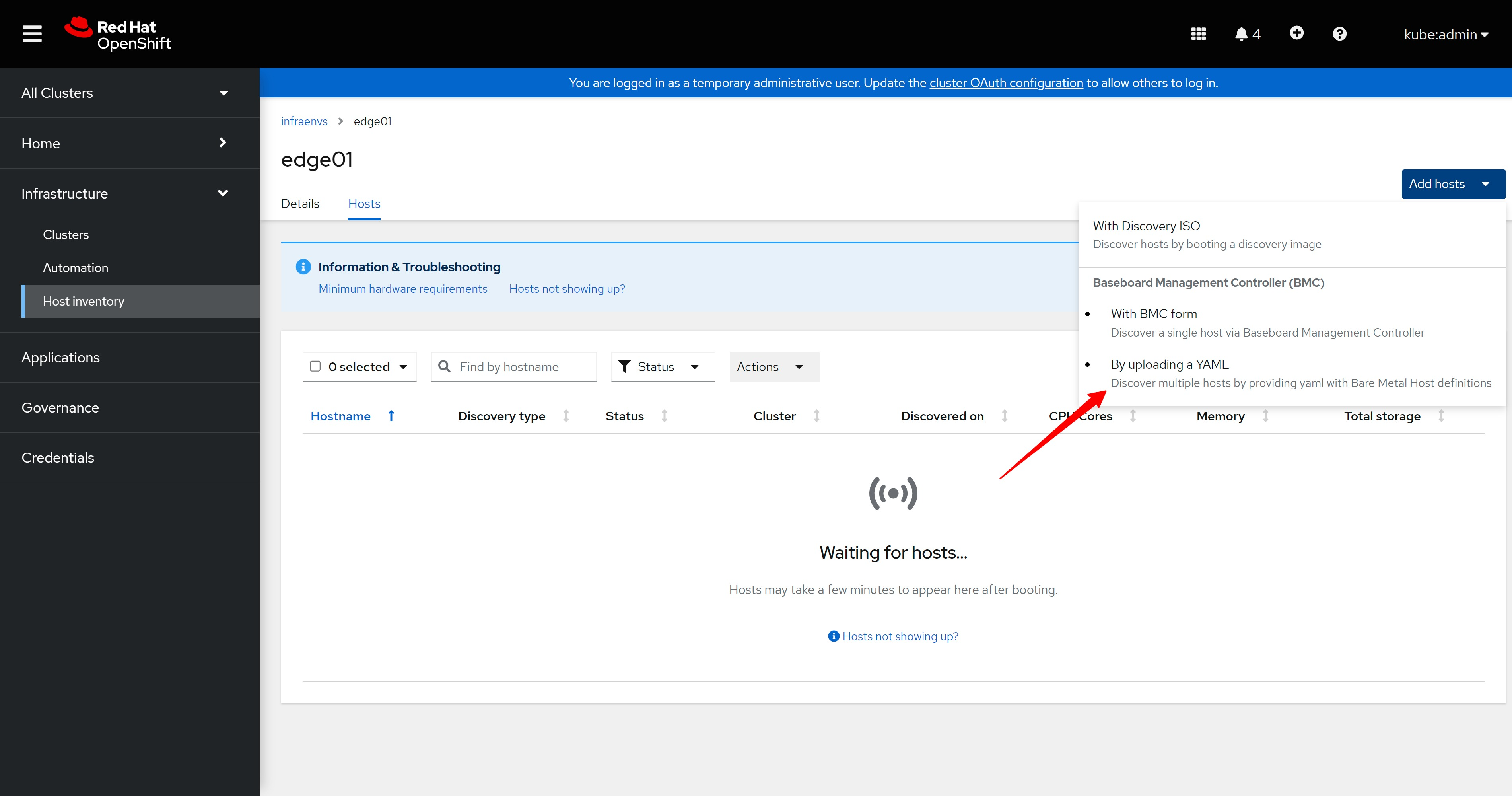 In this experiment, the whole process is as follows: 1. Install the ACM component on openshift4. 2. Configure cluster, infra env and other configurations on ACM. 3. MCE starts kvm through network redfish protocol 4. Kvm automatically starts the cluster installation, but due to the limitation of kvm+redfish, the restart during the installation process requires manually stopping kvm, configuring it to start from the hard disk, and then manually starting kvm. 5. The cluster installation is complete, save the cluster login information