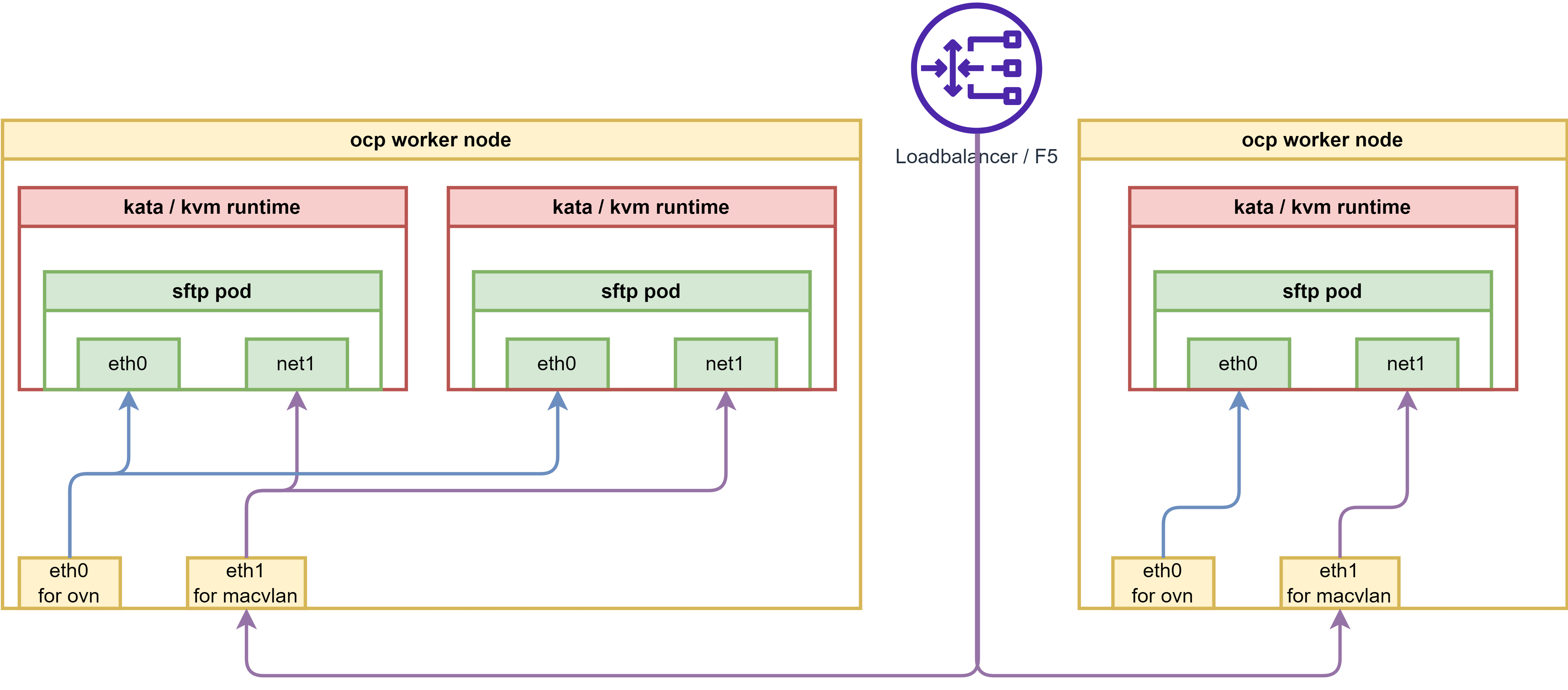 By using kata, pod will run in a mini kvm/qemu on rhcos, which will improve the security. We can use kata to run the sftp pod, and expose it to the internet.