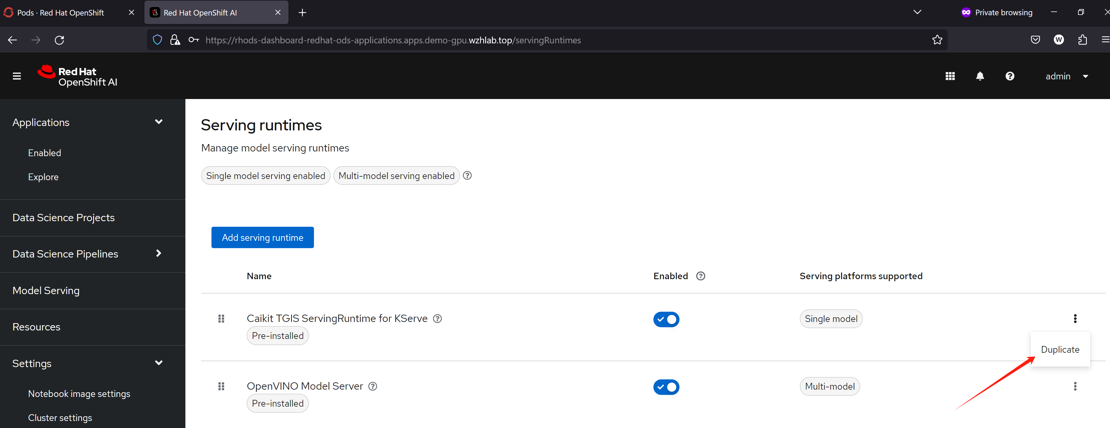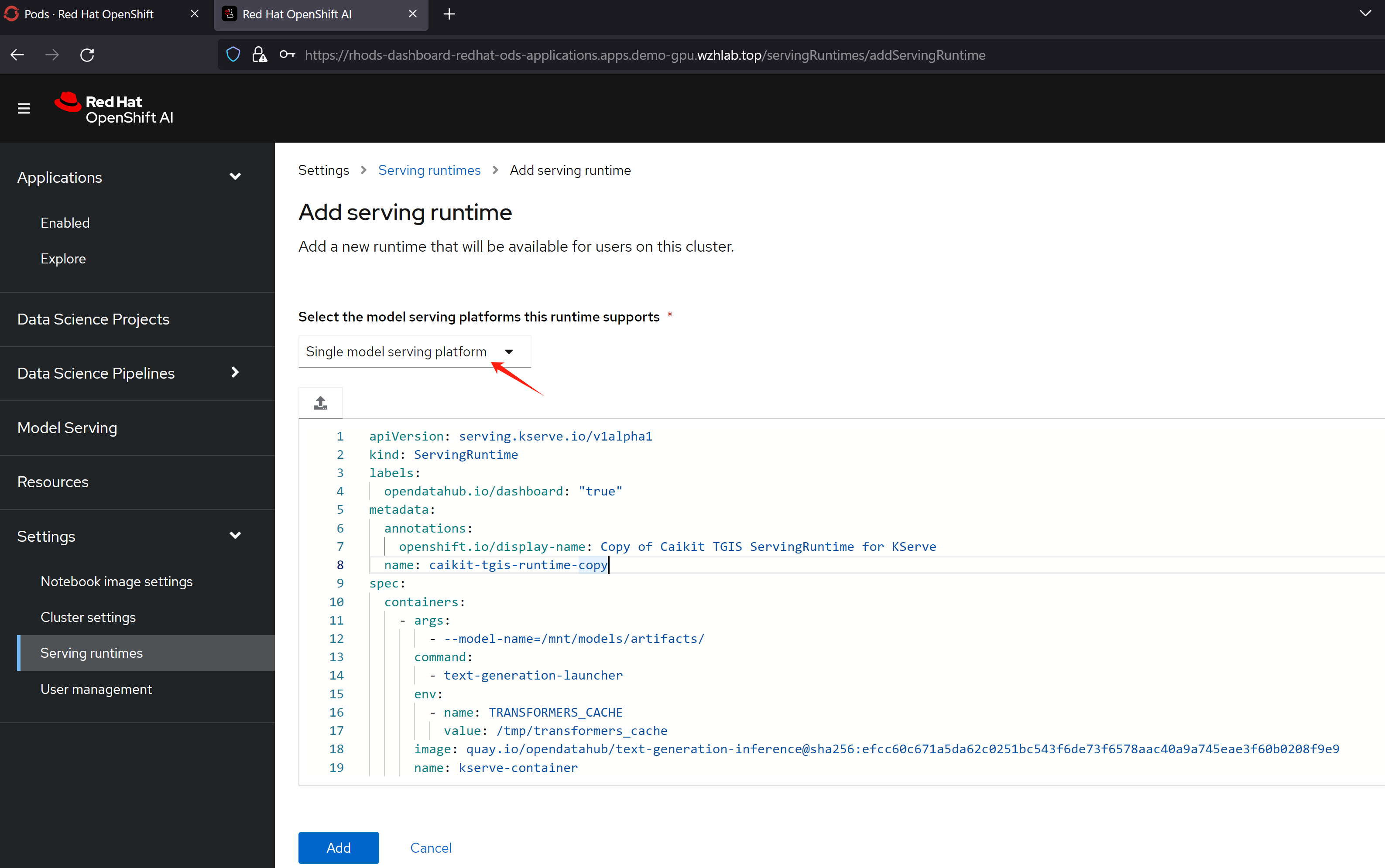 openshift ai默认带的serving runtime,用的是caikit-tgis, 对外接口是grpc模式, url path也和普通的openai api不一样,我们就需要自定义一个新的ServingRuntime,来承载LLM,对外保留openai API接口。