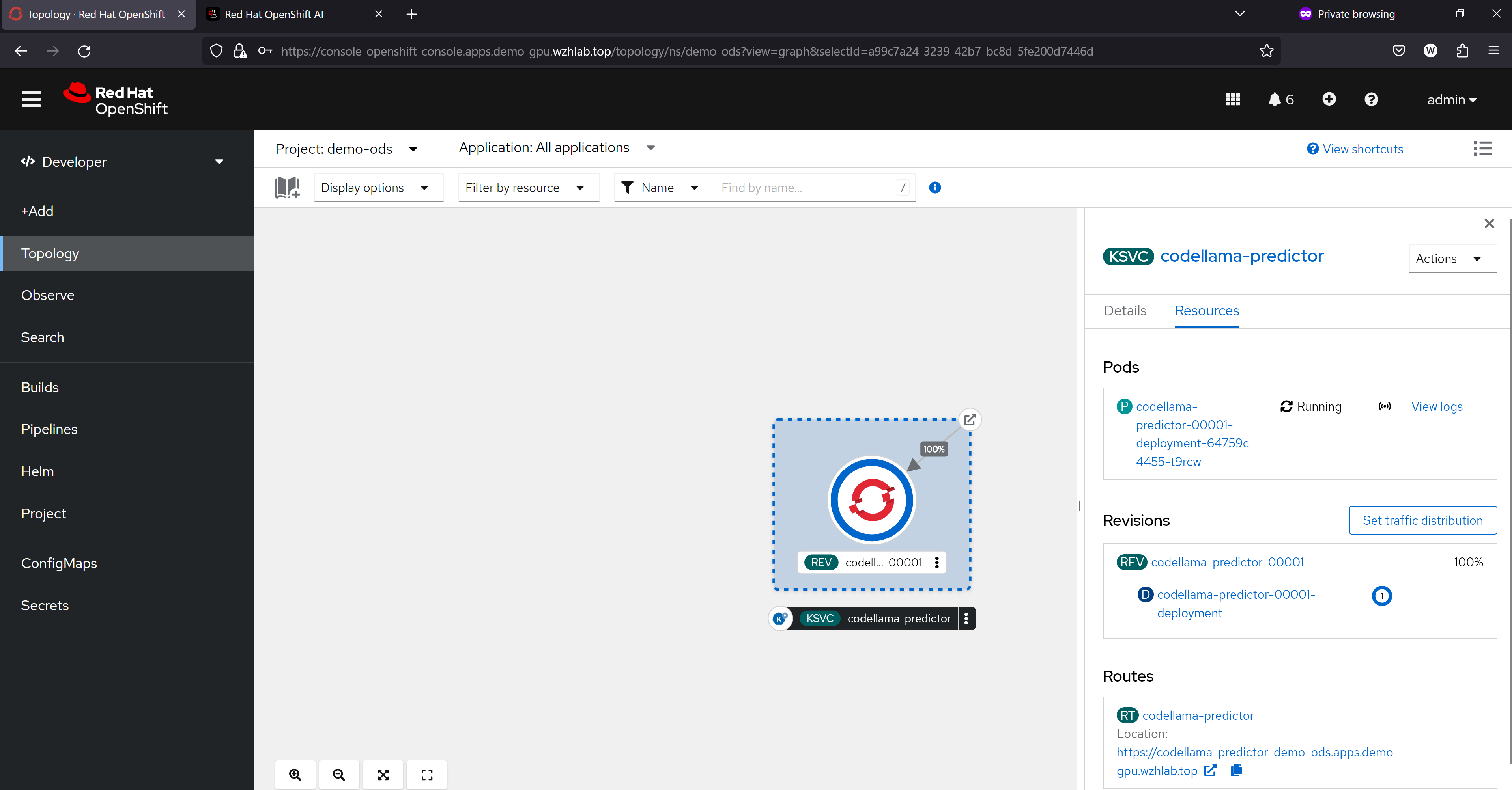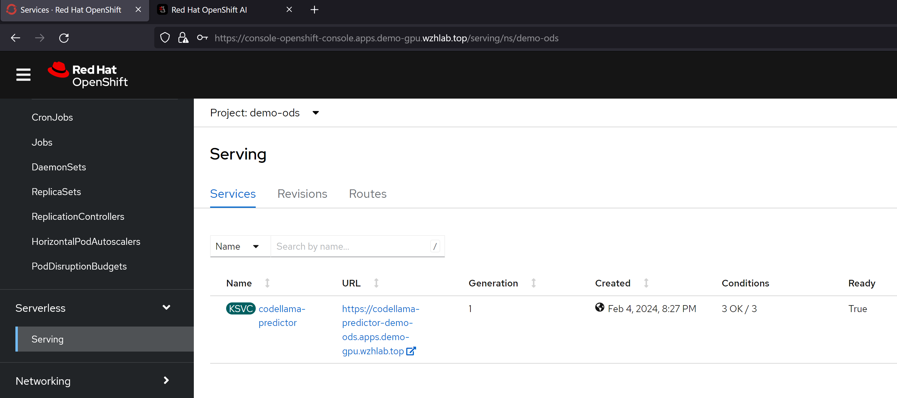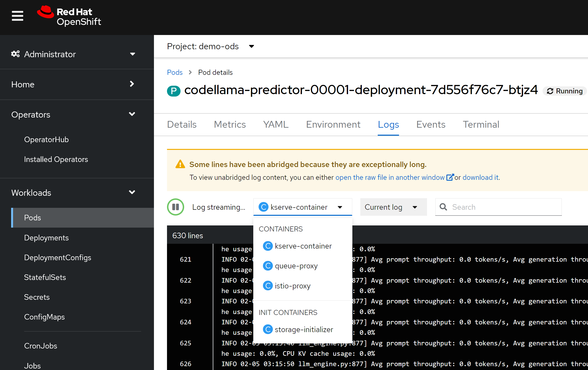 我们可以通过pod里面的container看到,ocp ai因为集成了knative,所以里面有多个sidecar proxy,这个是knative的特色,在LLM场景下面,由于流量不大,这种架构性能损耗就可以不用考虑,而这个架构带来的部署和管理的灵活性,就能大大的发挥出来了。