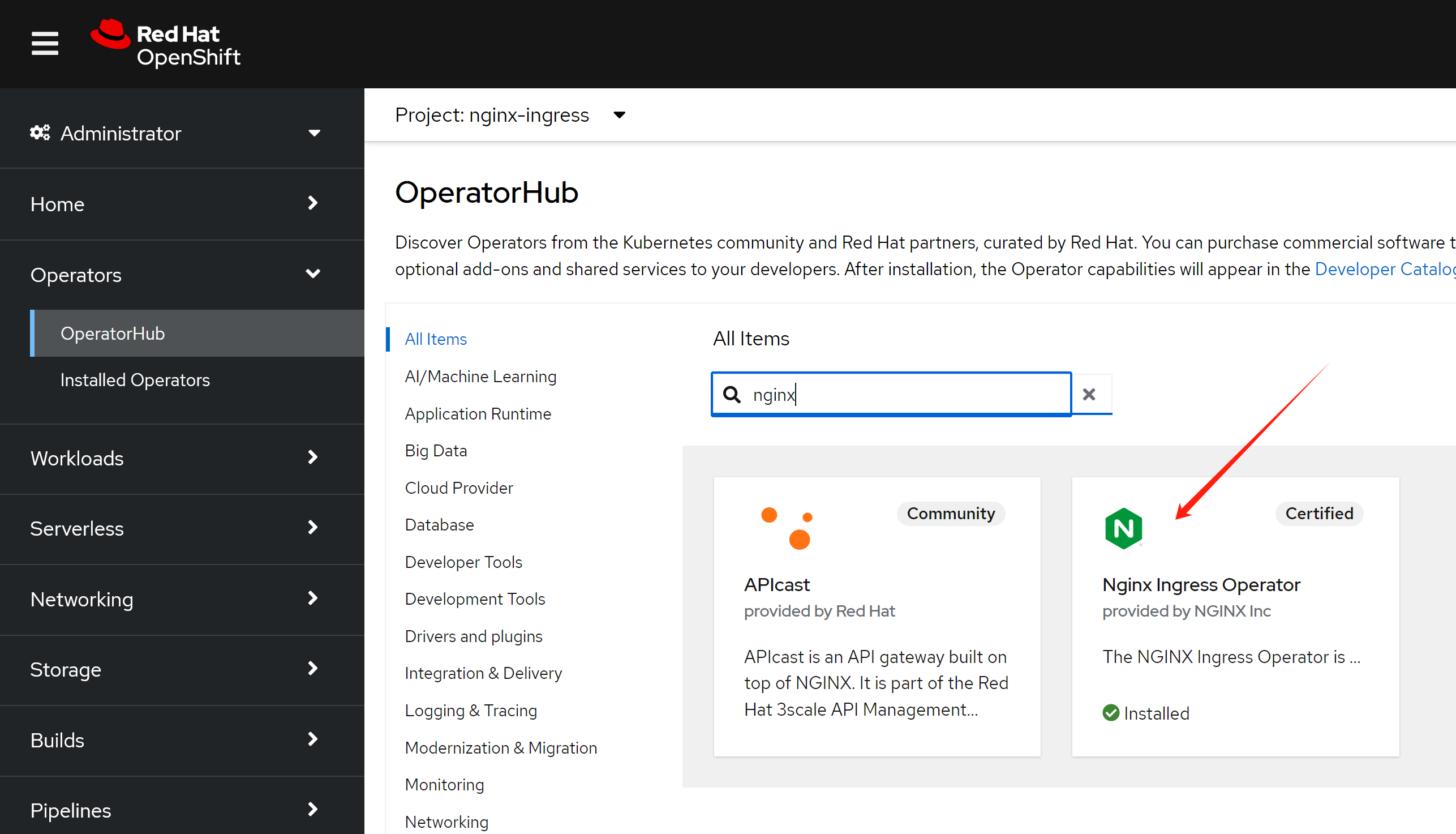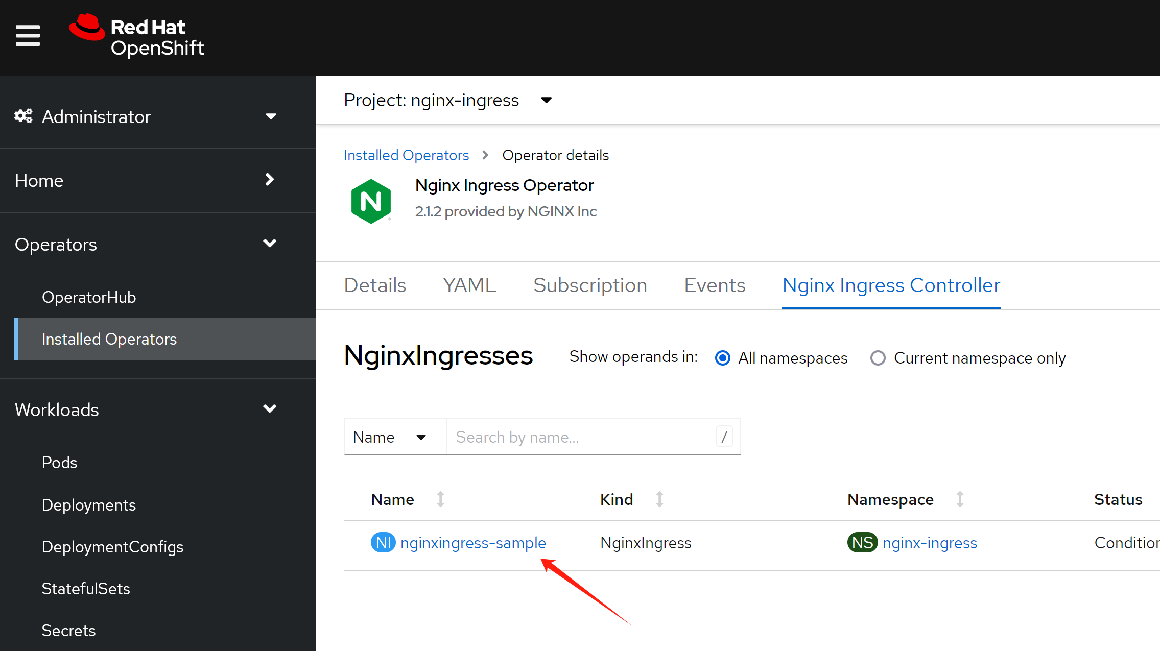 在openshift上,除了默认的router/haproxy,还有其他的方案可以作为ingress。比如openshift认证过的nginx operator,我们今天就来试试。