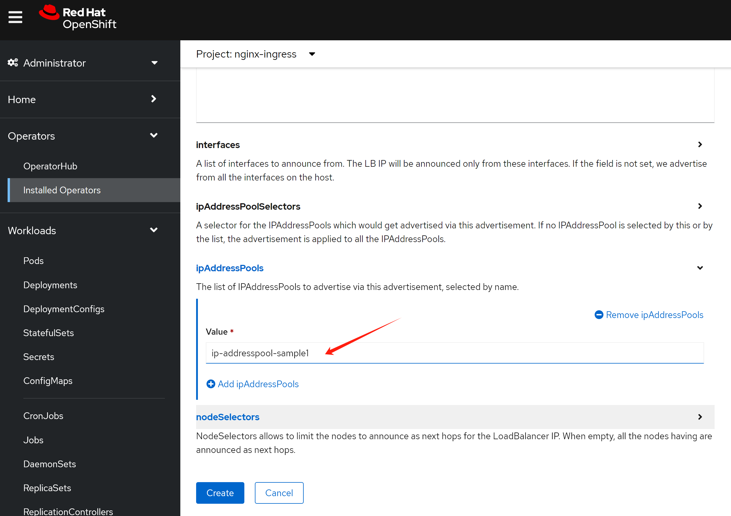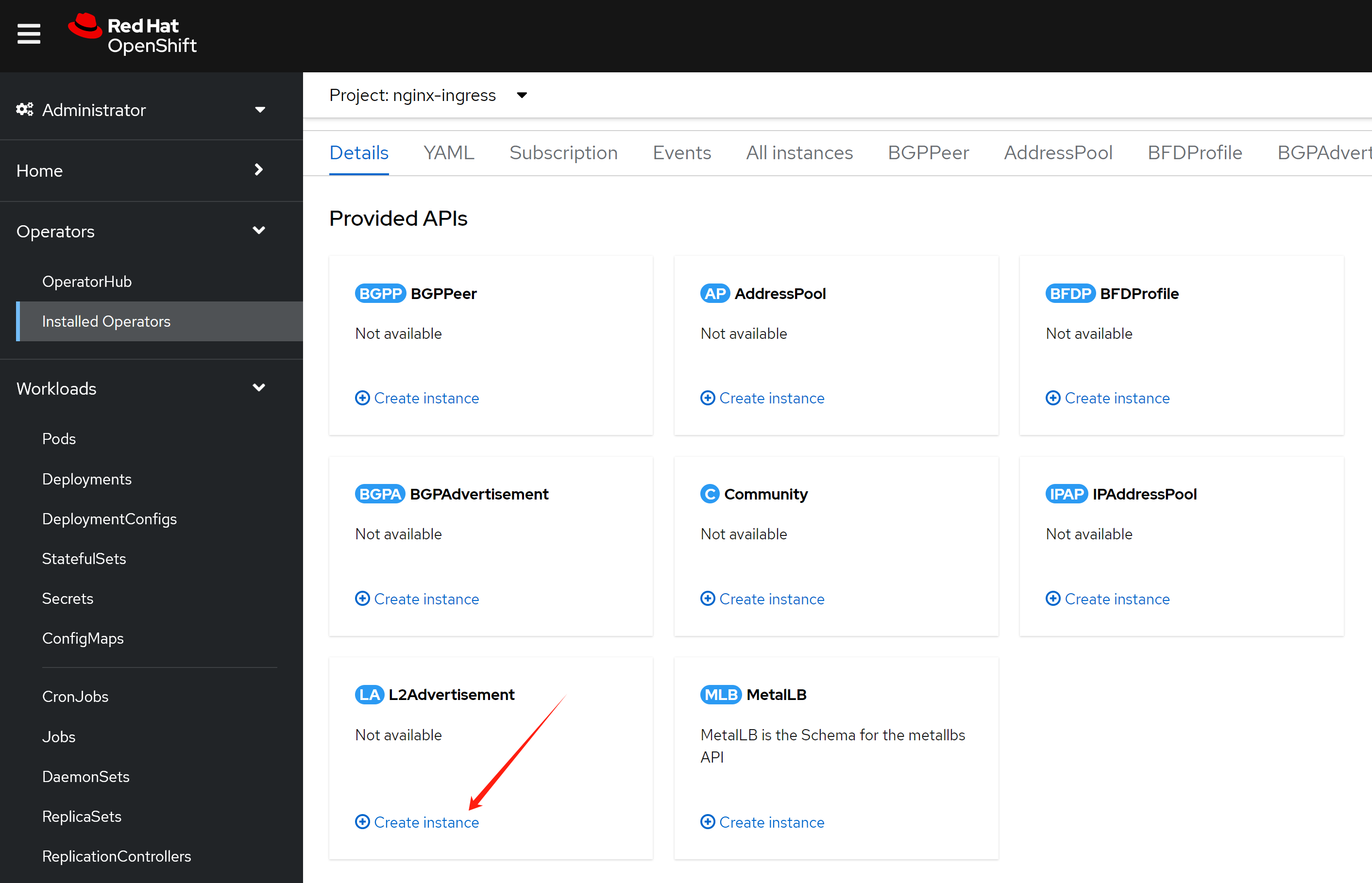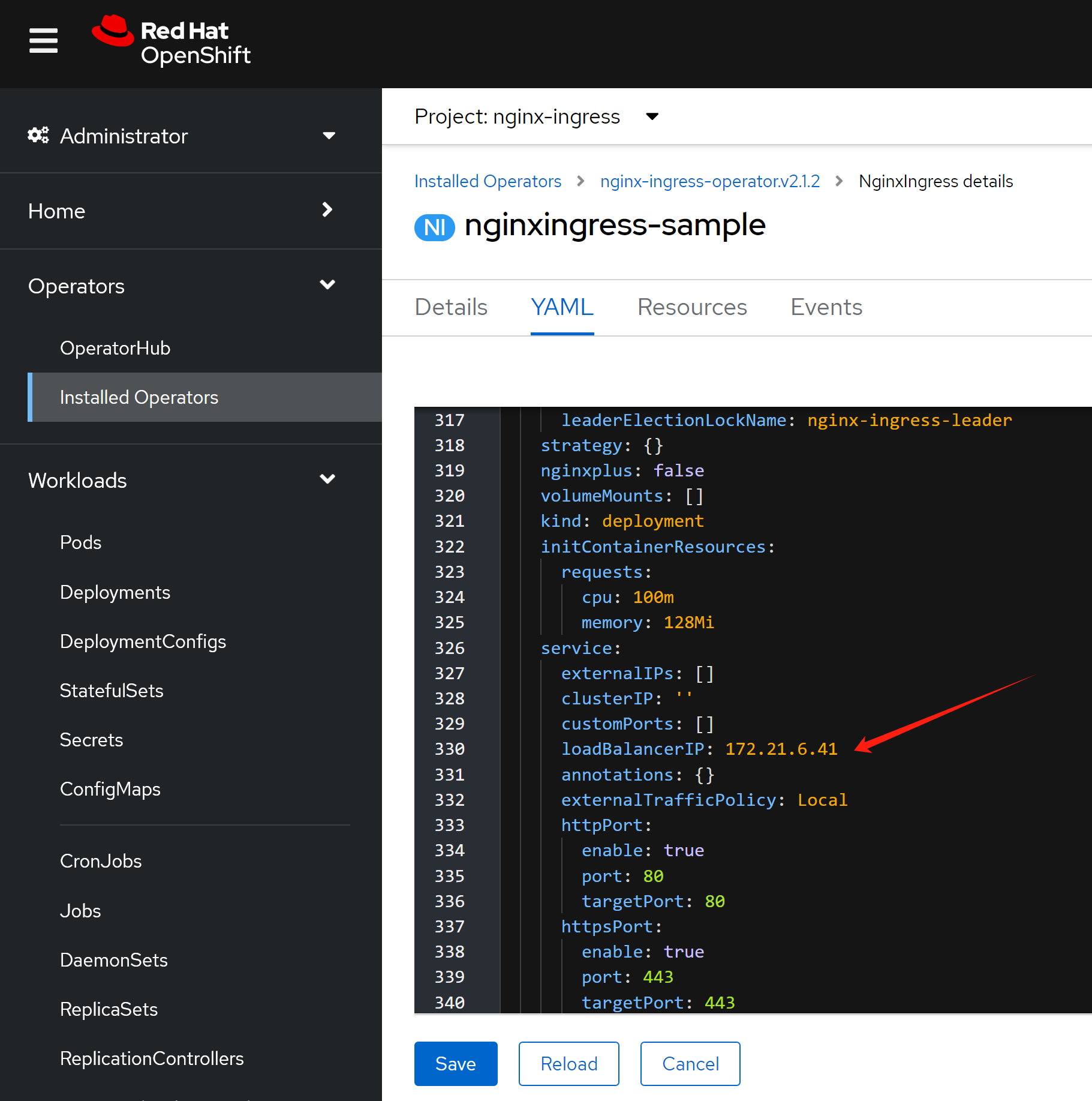 # nginxingress-sample-nginx-ingress-controller LoadBalancer 172.22.145.65 <pending> 80:32758/TCP,443:31566/TCP 55m到这里,我们知道了,openshift/k8s 上面的nginx operator,需要依赖外部的load balancer来导入流量,如果是云服务的话,会自动对接,但是我们是baremetal的场景,那么就必须搞一个metalLB来充当这个load balancer了