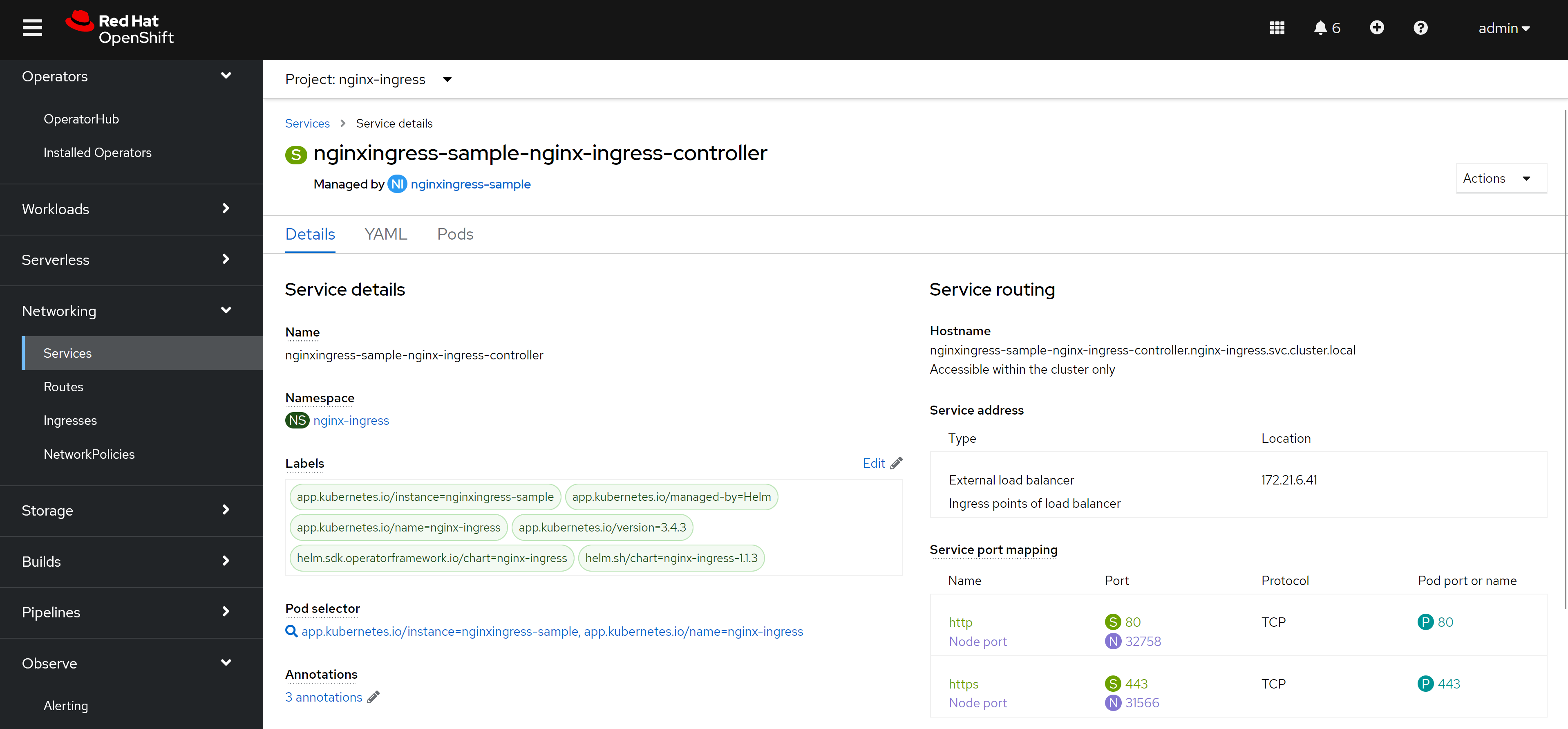 # nginx-ingress nginxingress-sample-nginx-ingress-controller 10.133.0.21:443,10.133.0.21:80 6h55m