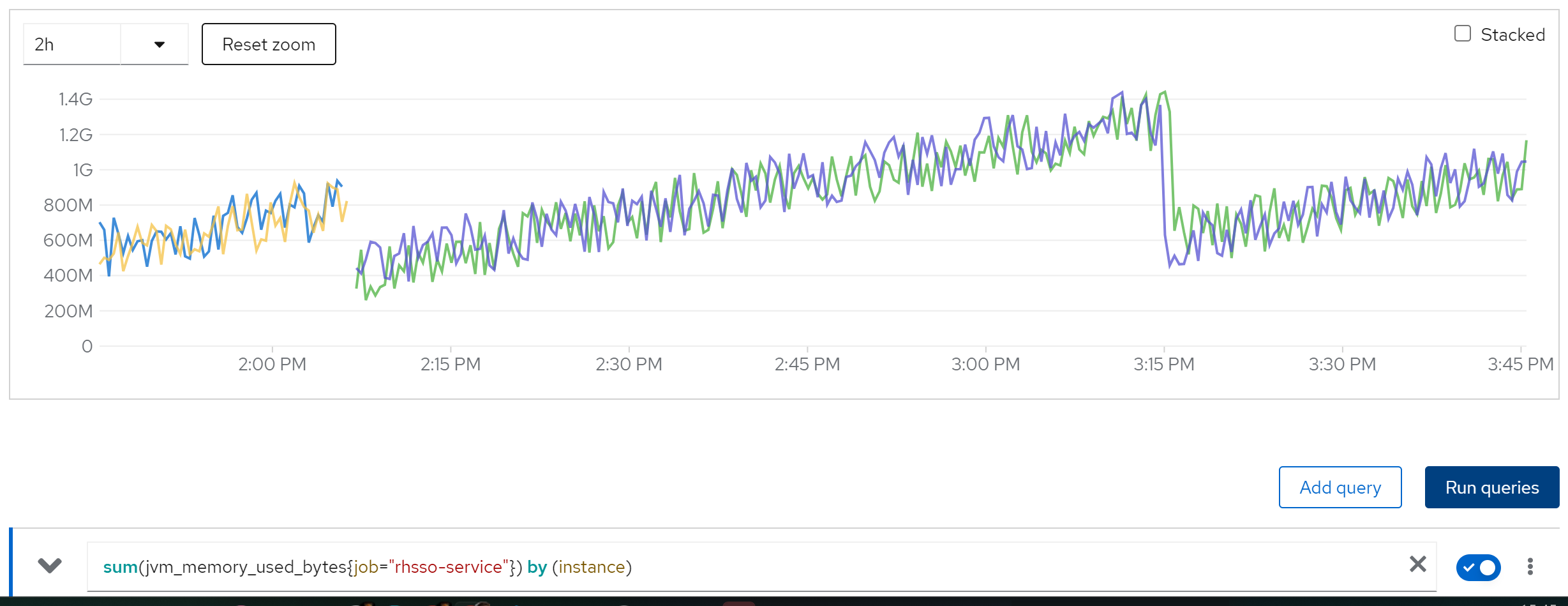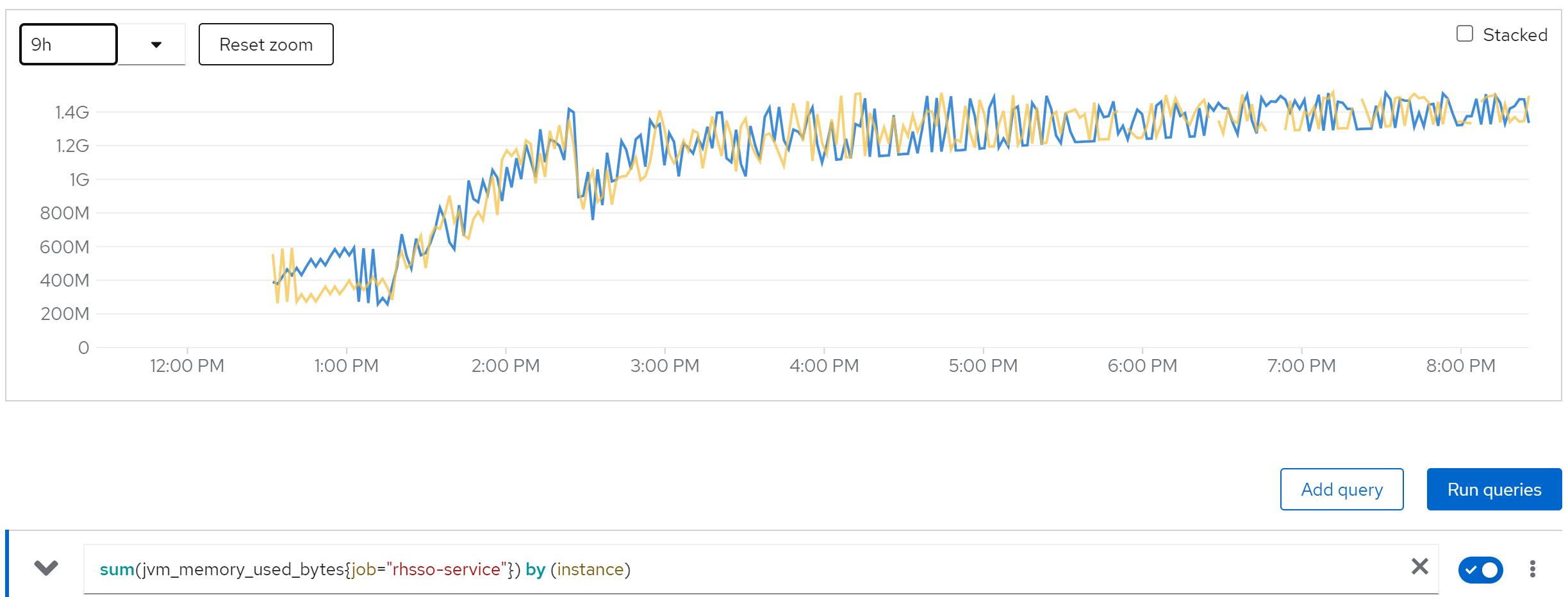 sum(jvm_memory_used_bytes{job=“rhsso-service”}) by (instance)