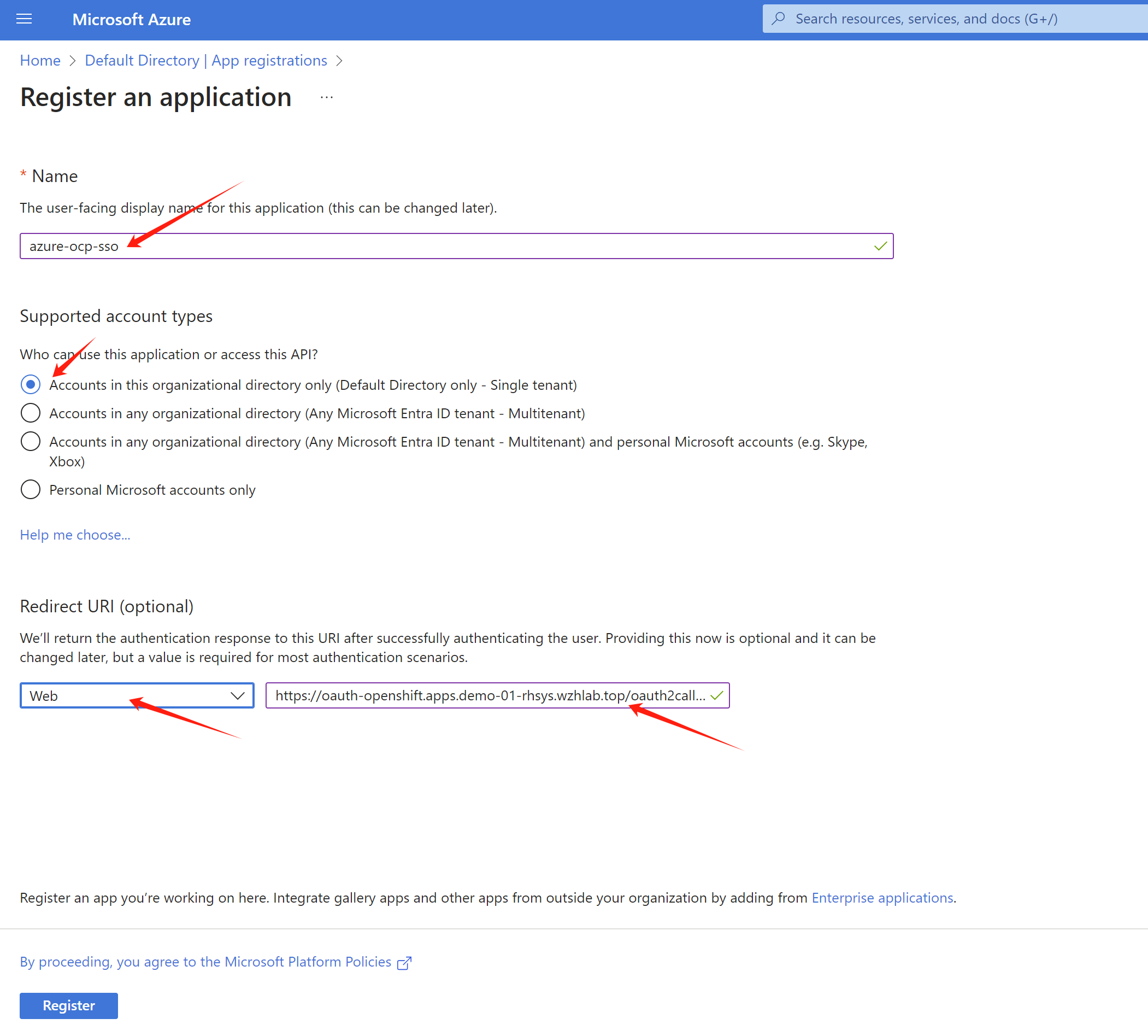 # oauth-openshift oauth-openshift.apps.demo-01-rhsys.wzhlab.top oauth-openshift 6443 passthrough/Redirect NoneSo the redirect url is https://oauth-openshift.apps.demo-01-rhsys.wzhlab.top/oauth2callback/azure-ocp-sso . Now we can create the app registration in Azure portal.