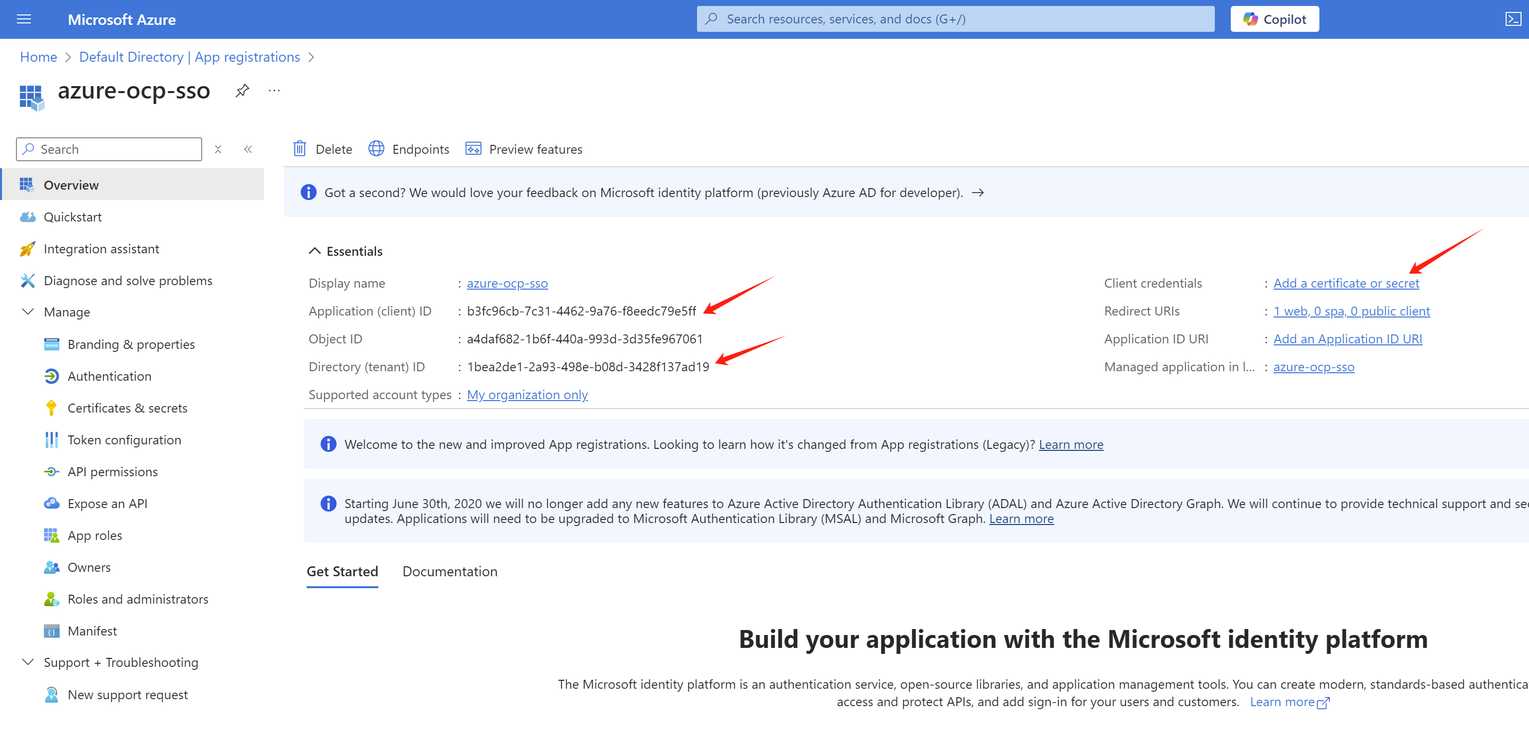 After the app registration is created, we can get the tenant id and client id from the Overview page. Write it down for later use.