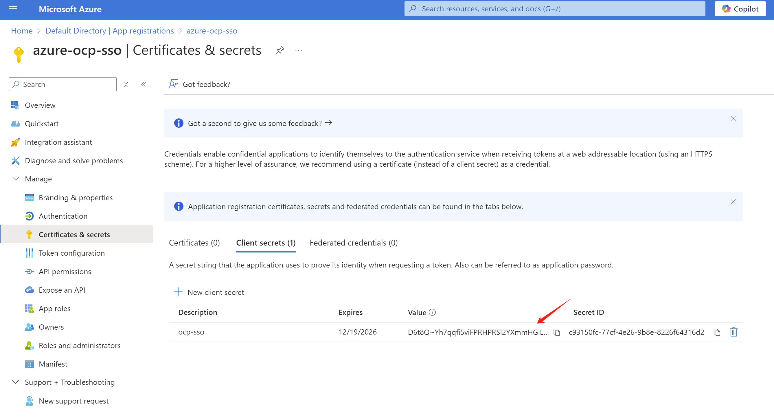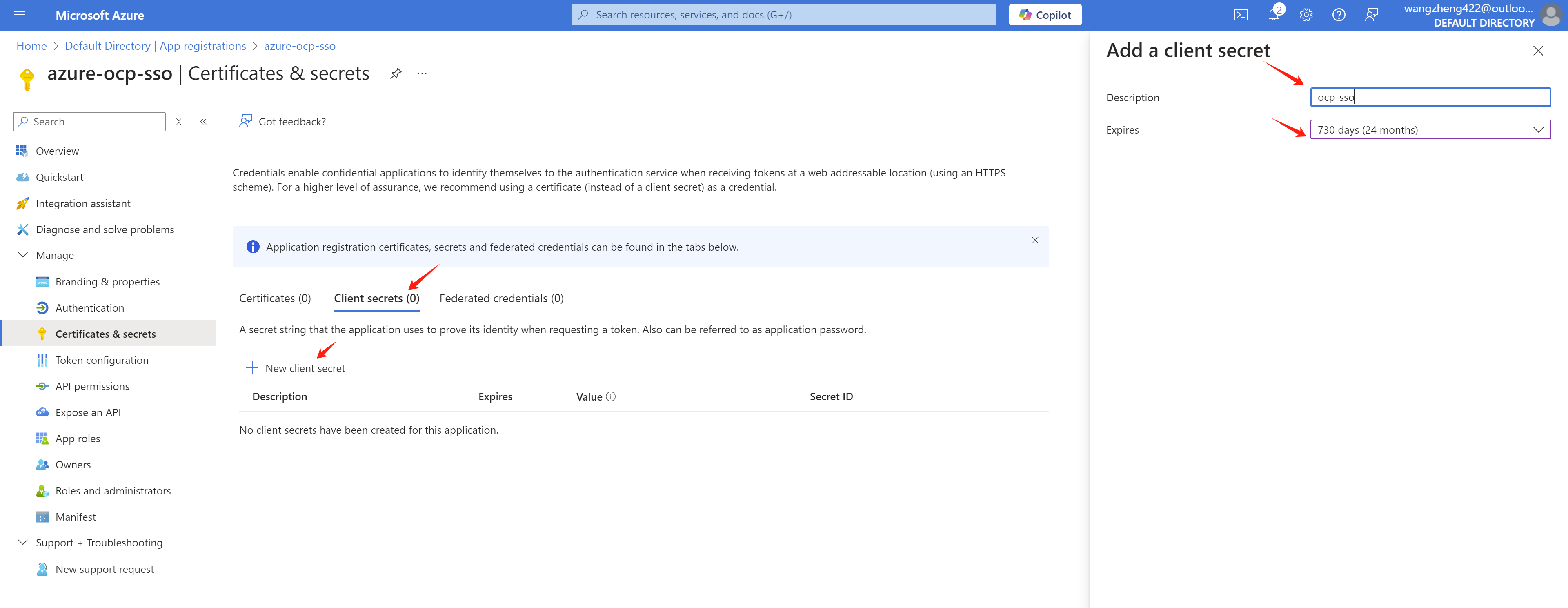 And create a client secret in the Certificates & secrets page.
