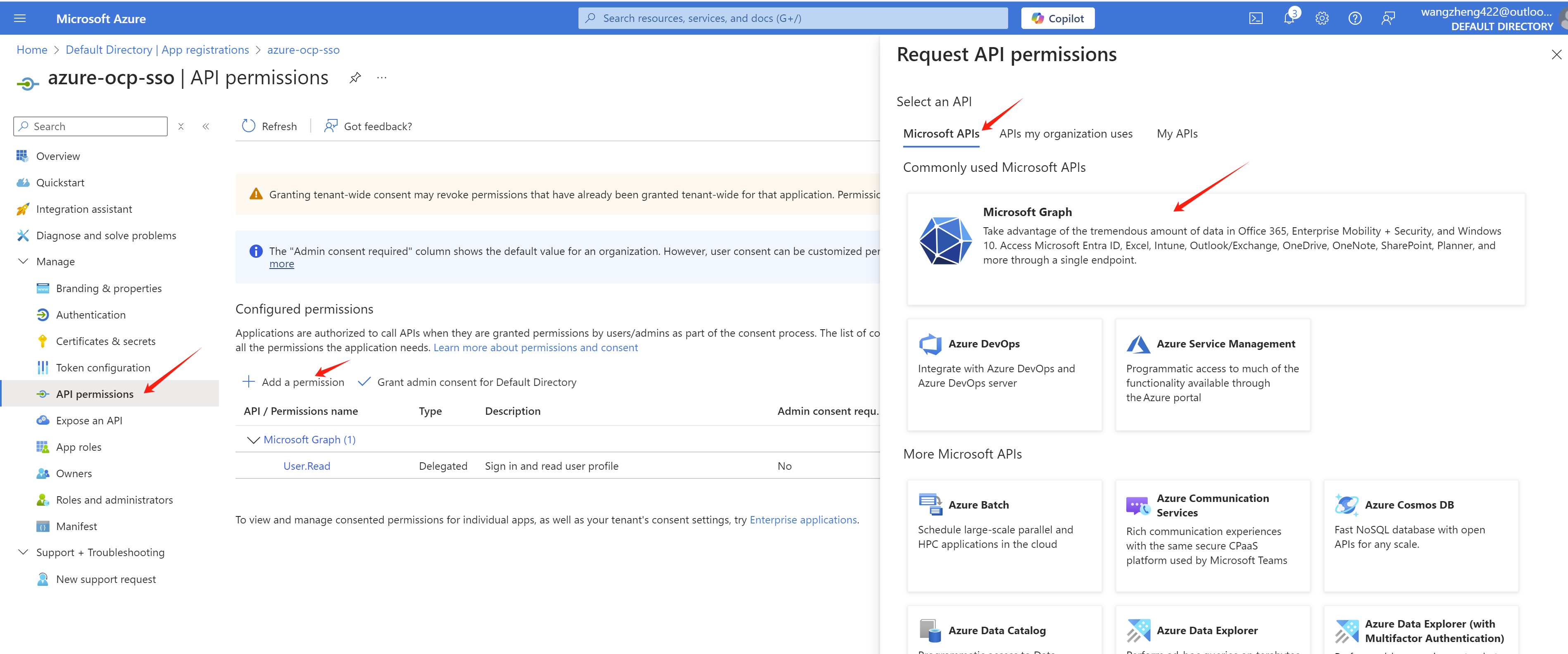 Now, we need go add some permissions to the app registration. Go to API permissions page, click Add a permission.