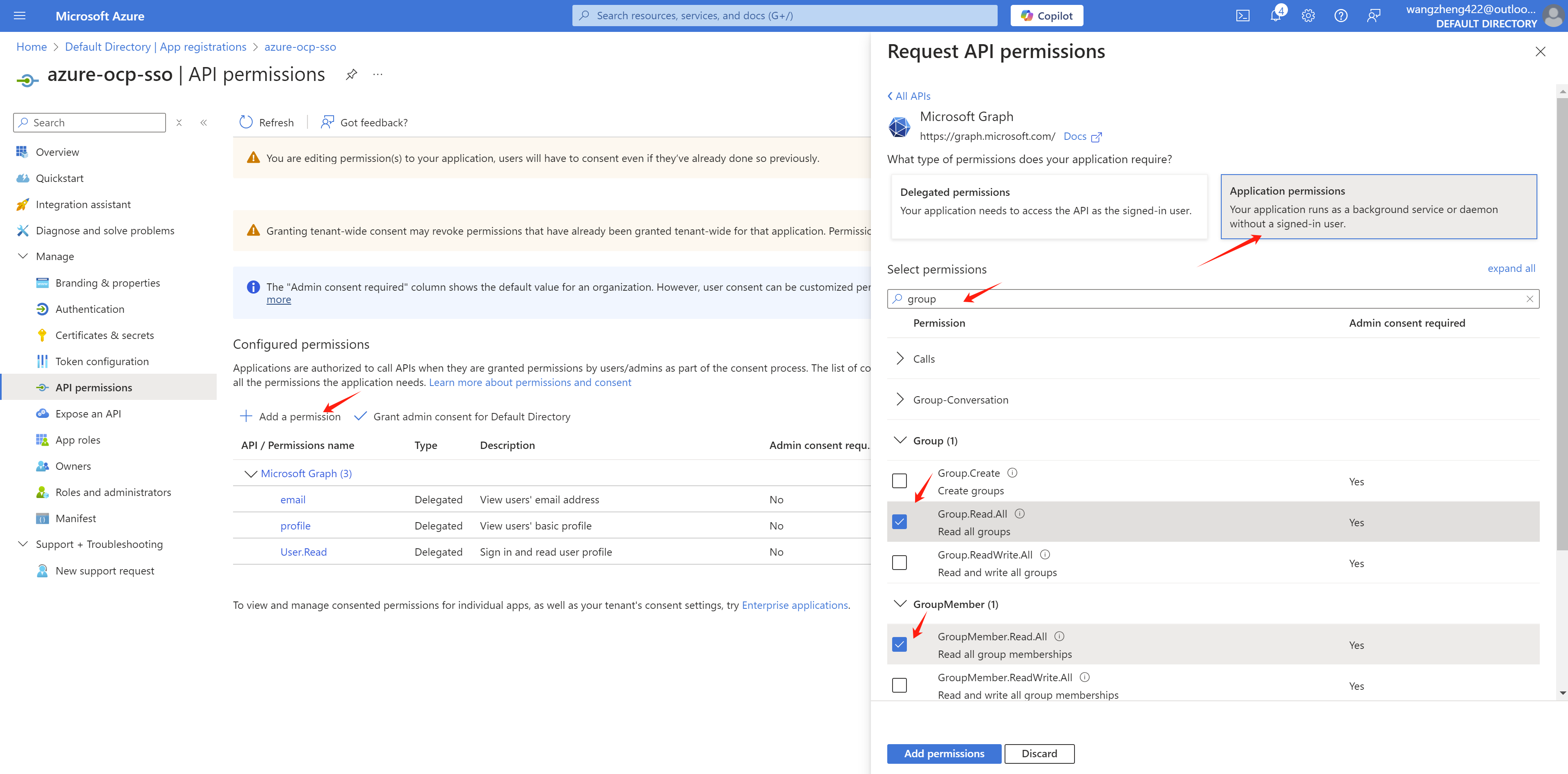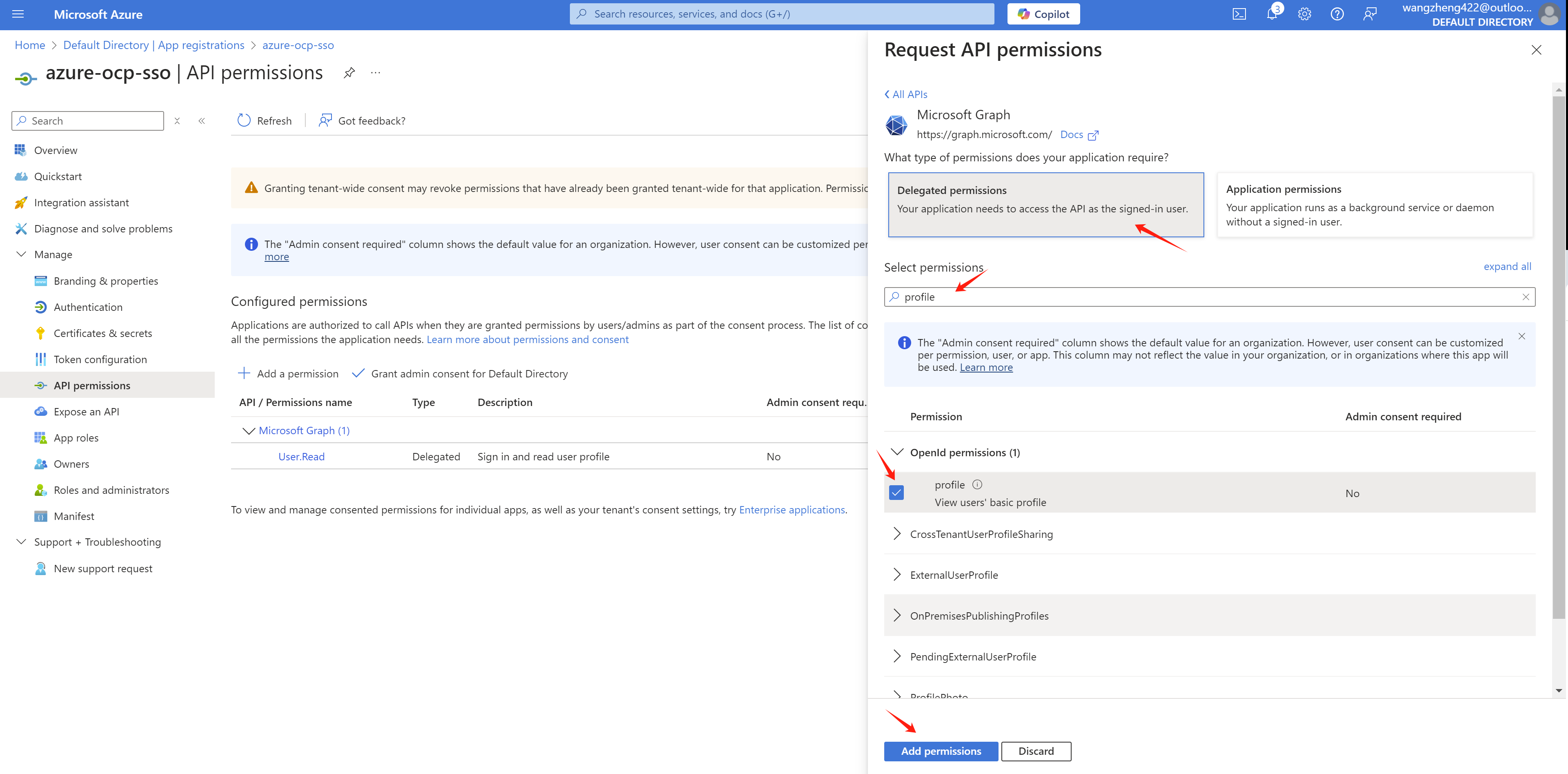 Add profile and email permissions with Delegated permissions.