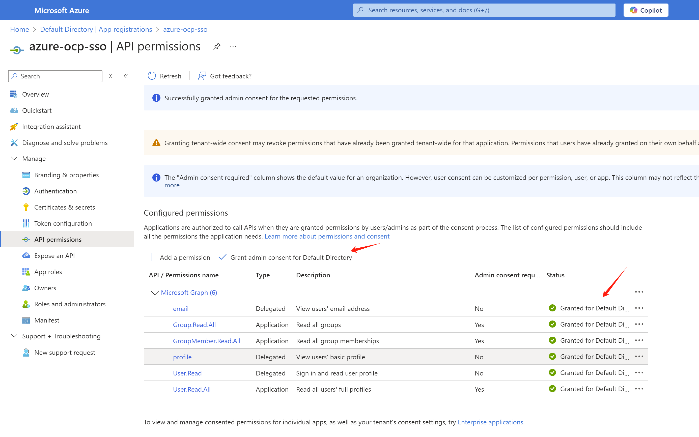 After the permissions are added, we need to grant admin consent for the permissions.