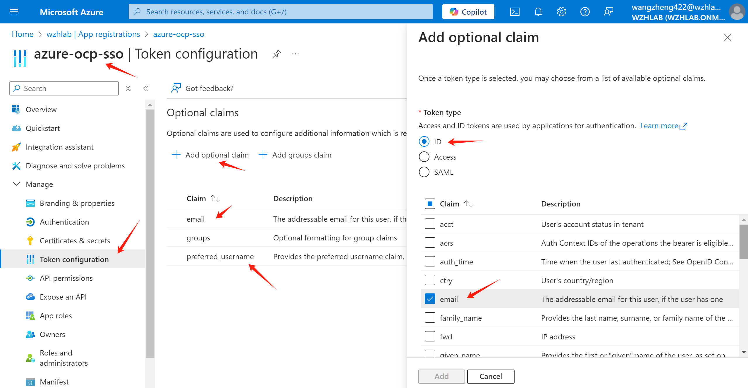 Add optional claim for email and preferred_username.