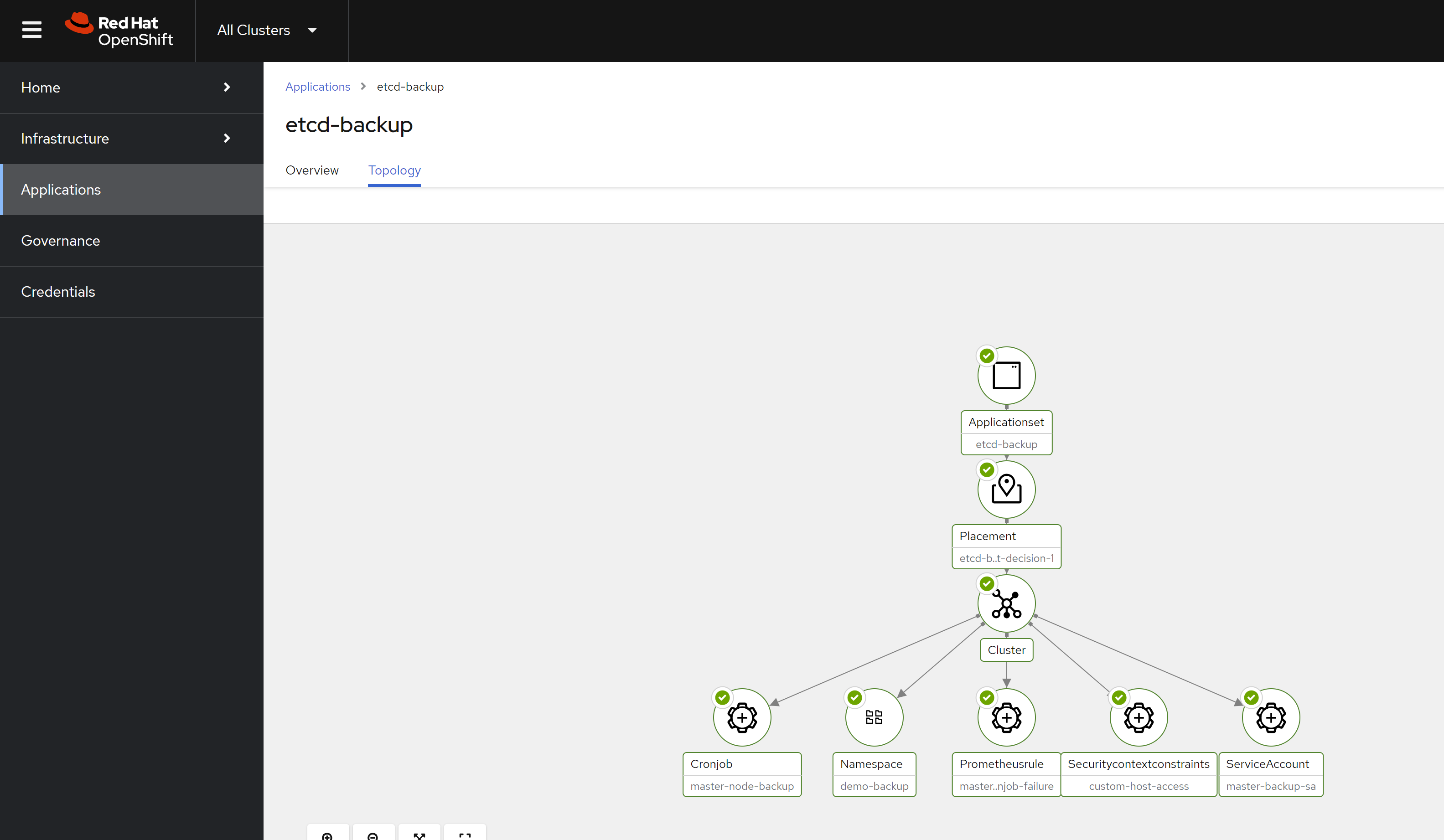 description: "CronJob 'master-node-backup' The last run failed. Please check the relevant logs and resources."deploy using acm