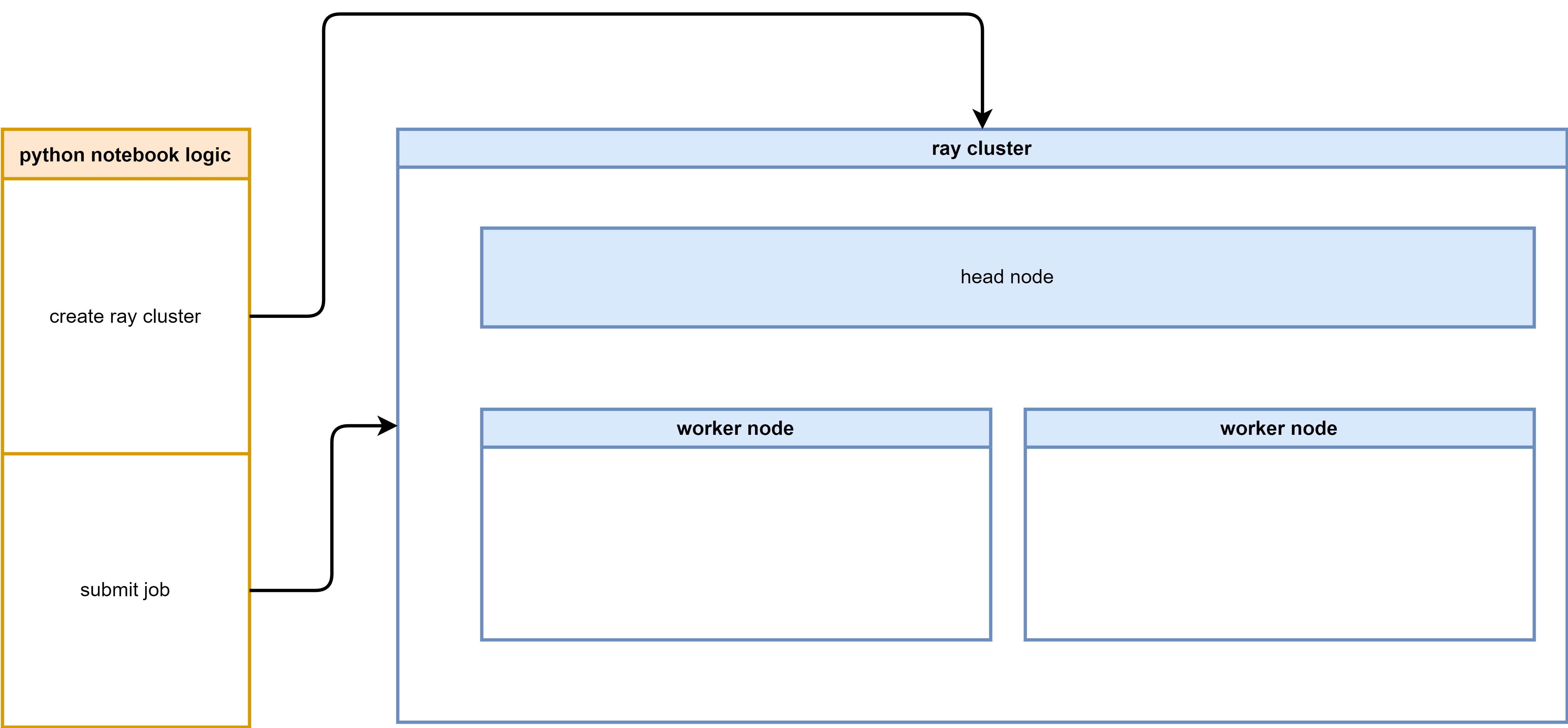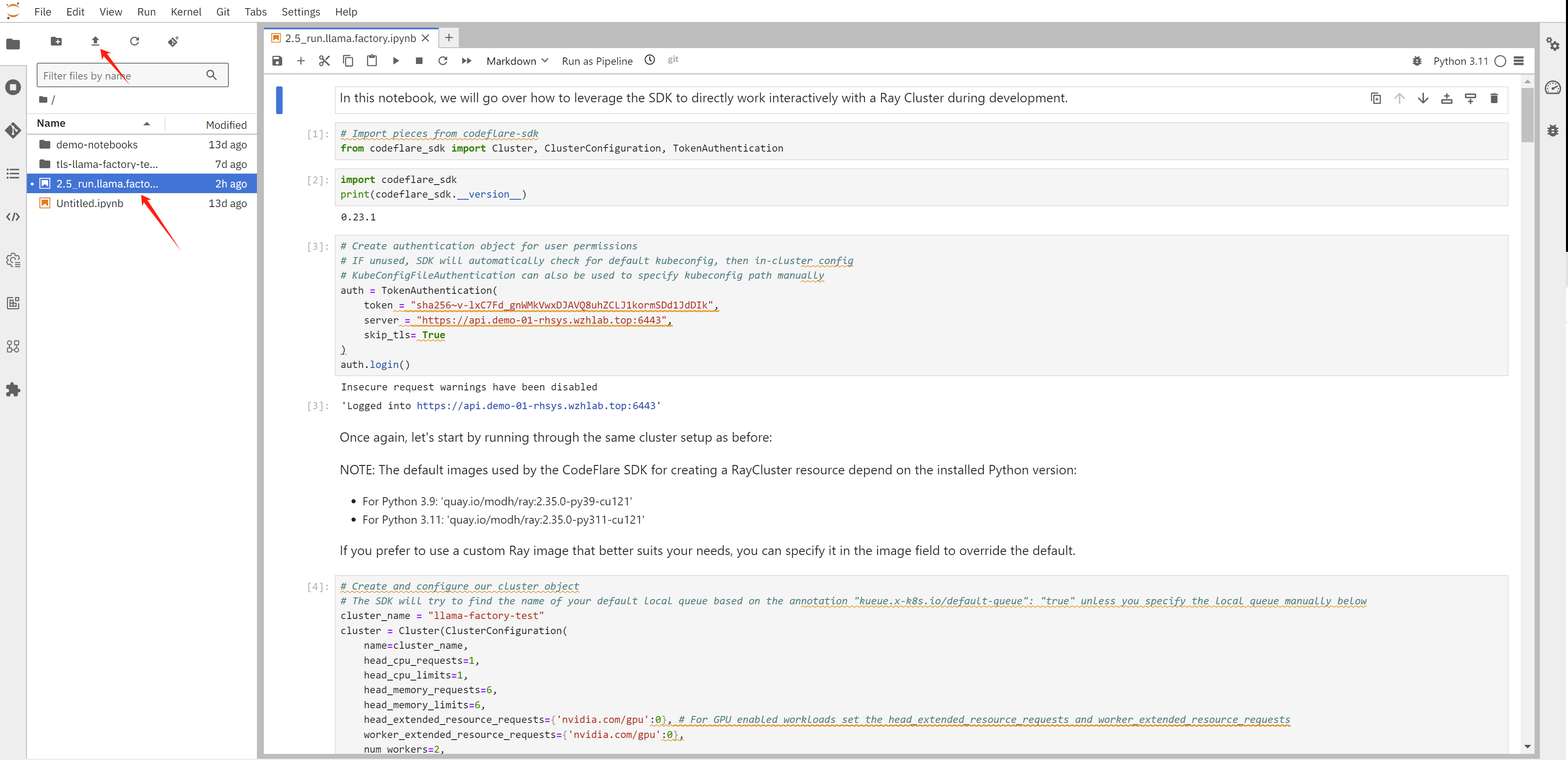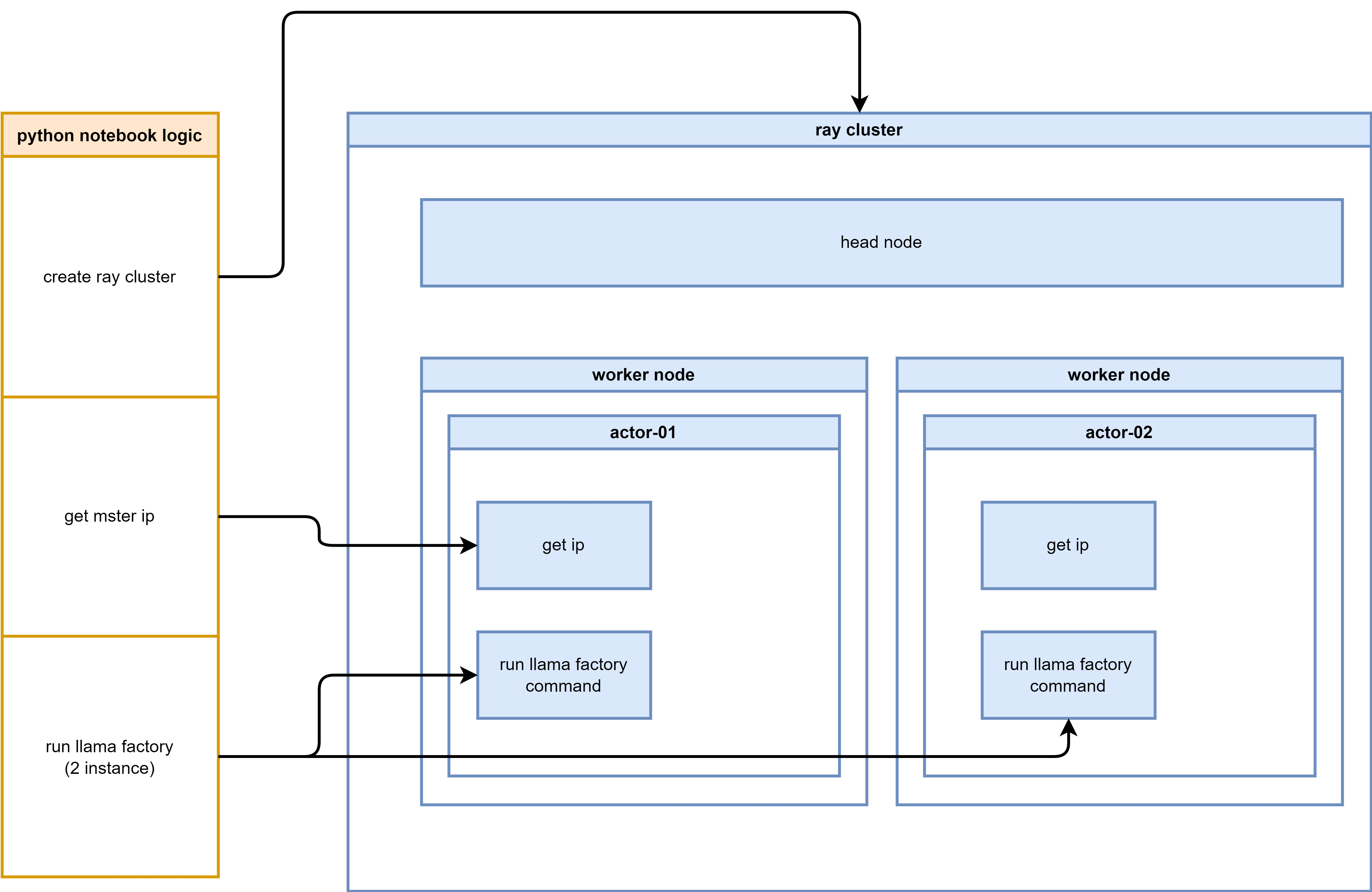 The notebook will create ray cluster, and create job in the ray cluster, it will create 2 actor, and collect ip address of the actors, then it will call actor’s function, to start llama factory command line, and then to start the training.