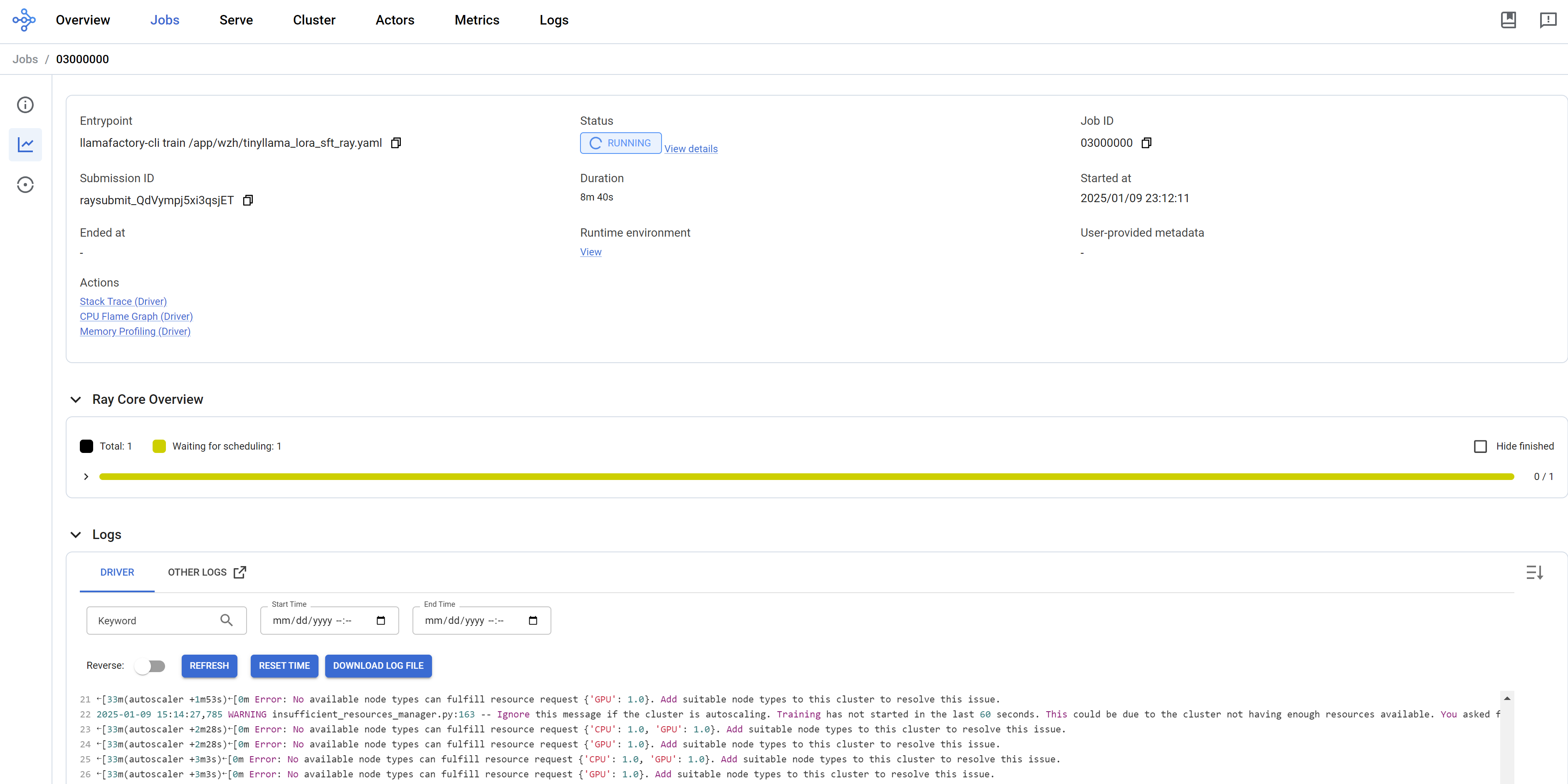 Llama factory DOSE support ray based on this issues, but it is just 2 days ago based on the time of this writing. So we first try to run llama factory using old cli. Later, we will try to run it in native ray way.