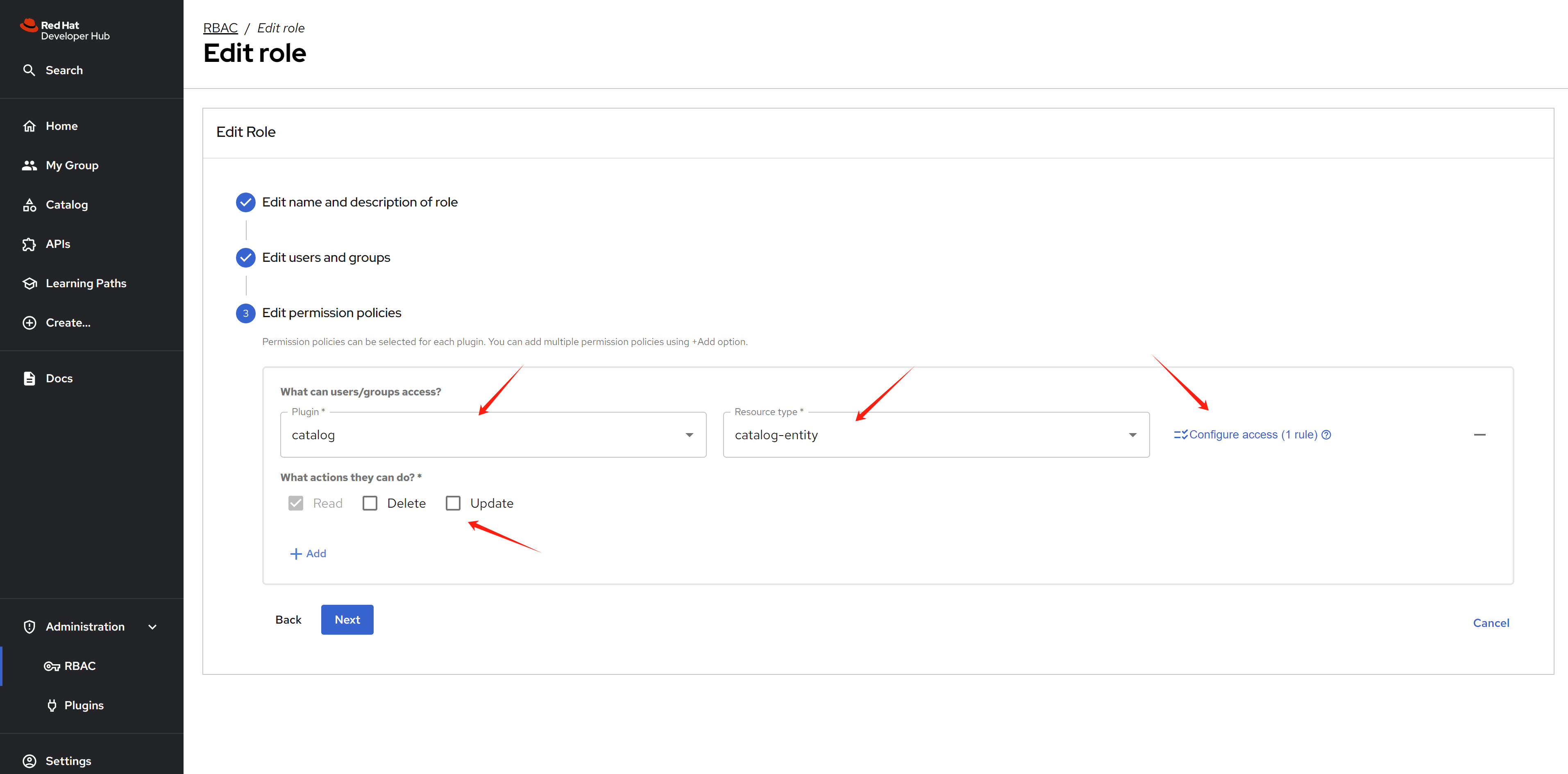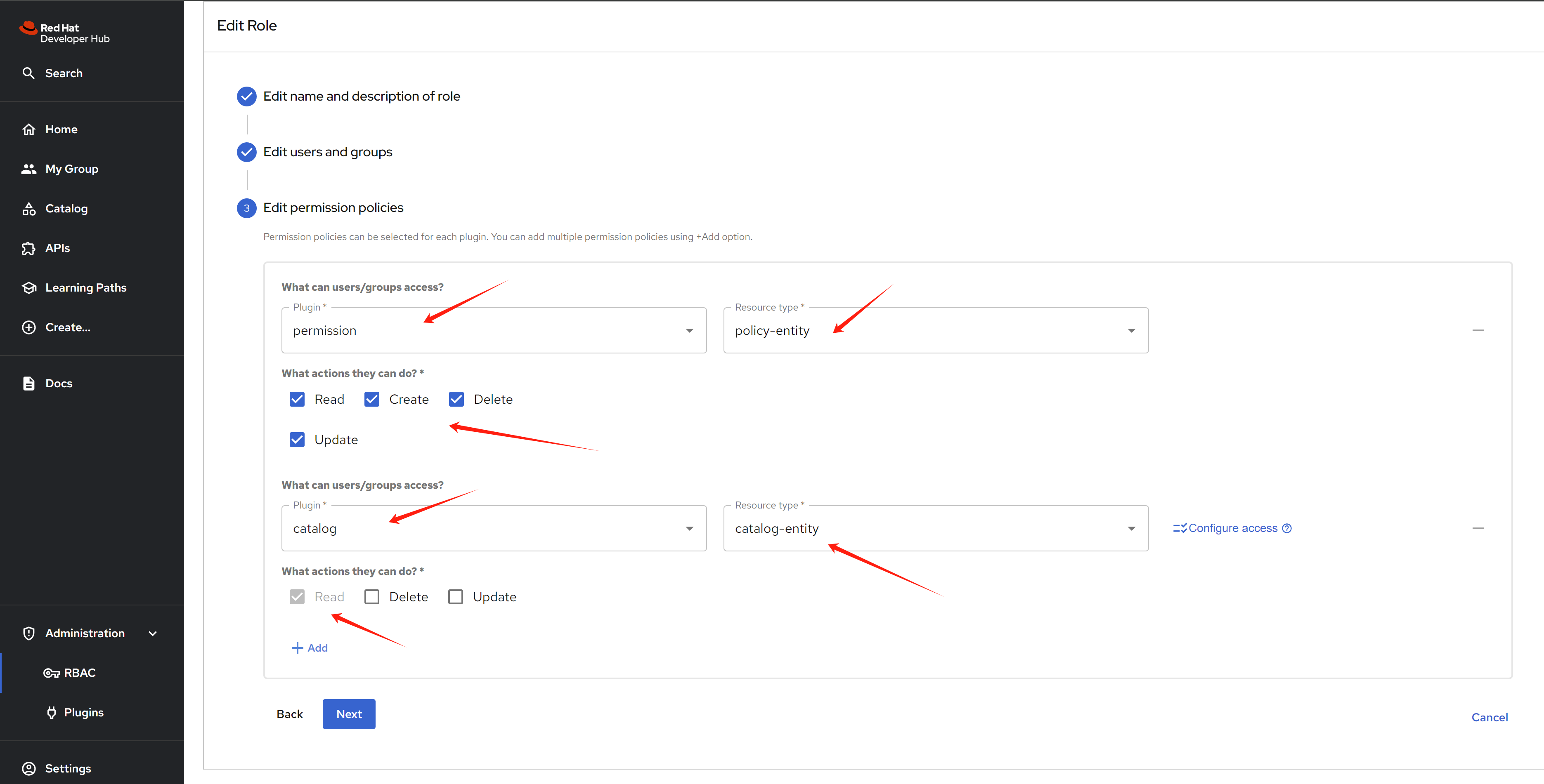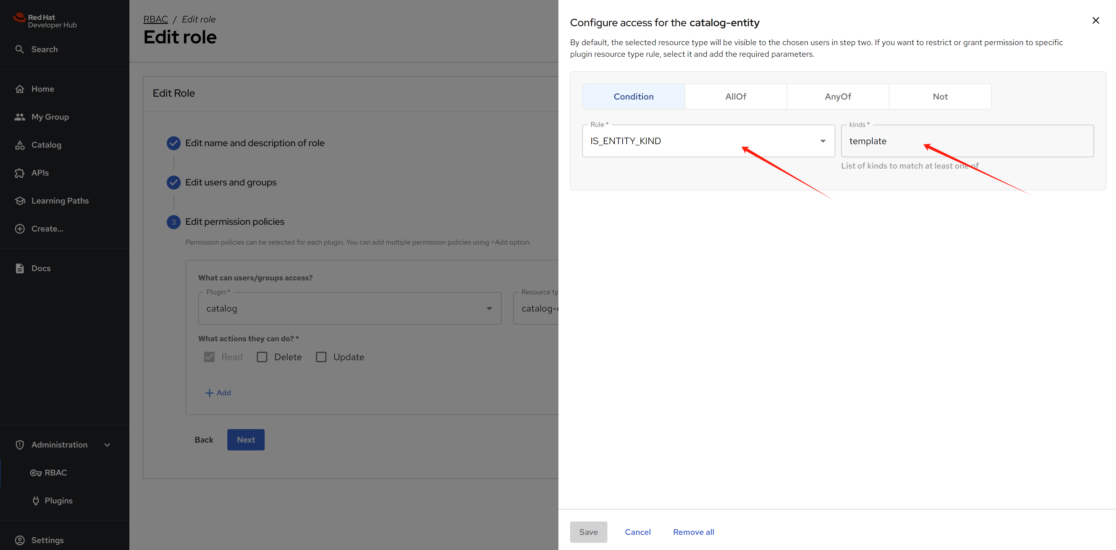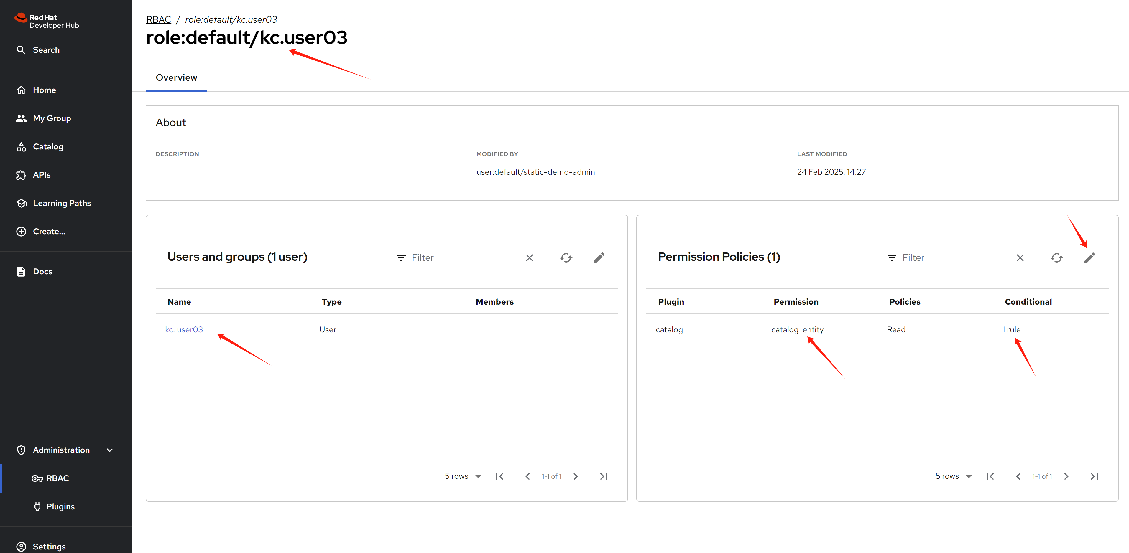 Currently, the newest RHDH version 1.4 has a GUI for permission management. It also supports conditional policy. However, it has some bugs. This document demonstrates how it works and provides a workaround to add conditional policy permission to RHDH 1.4.