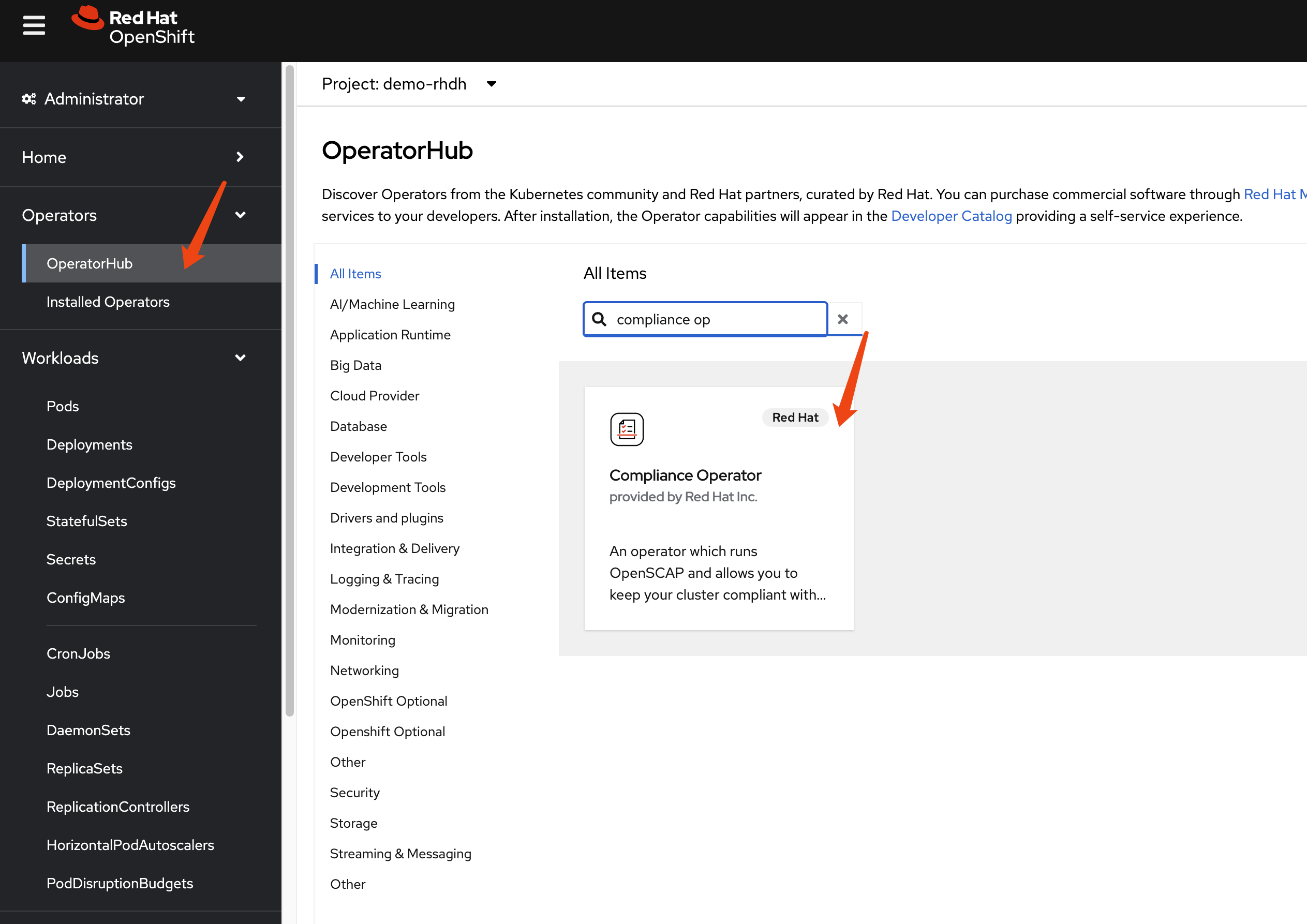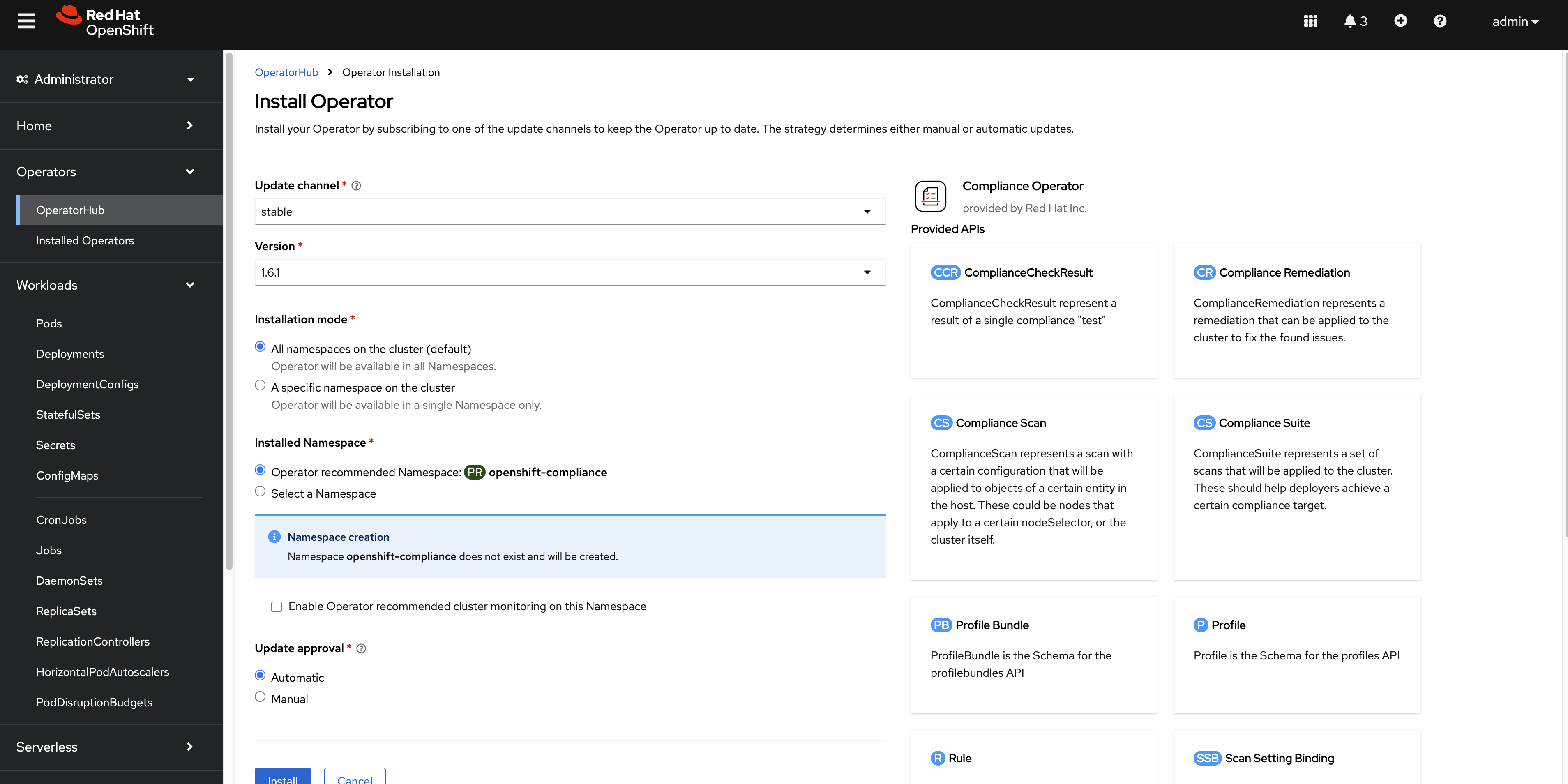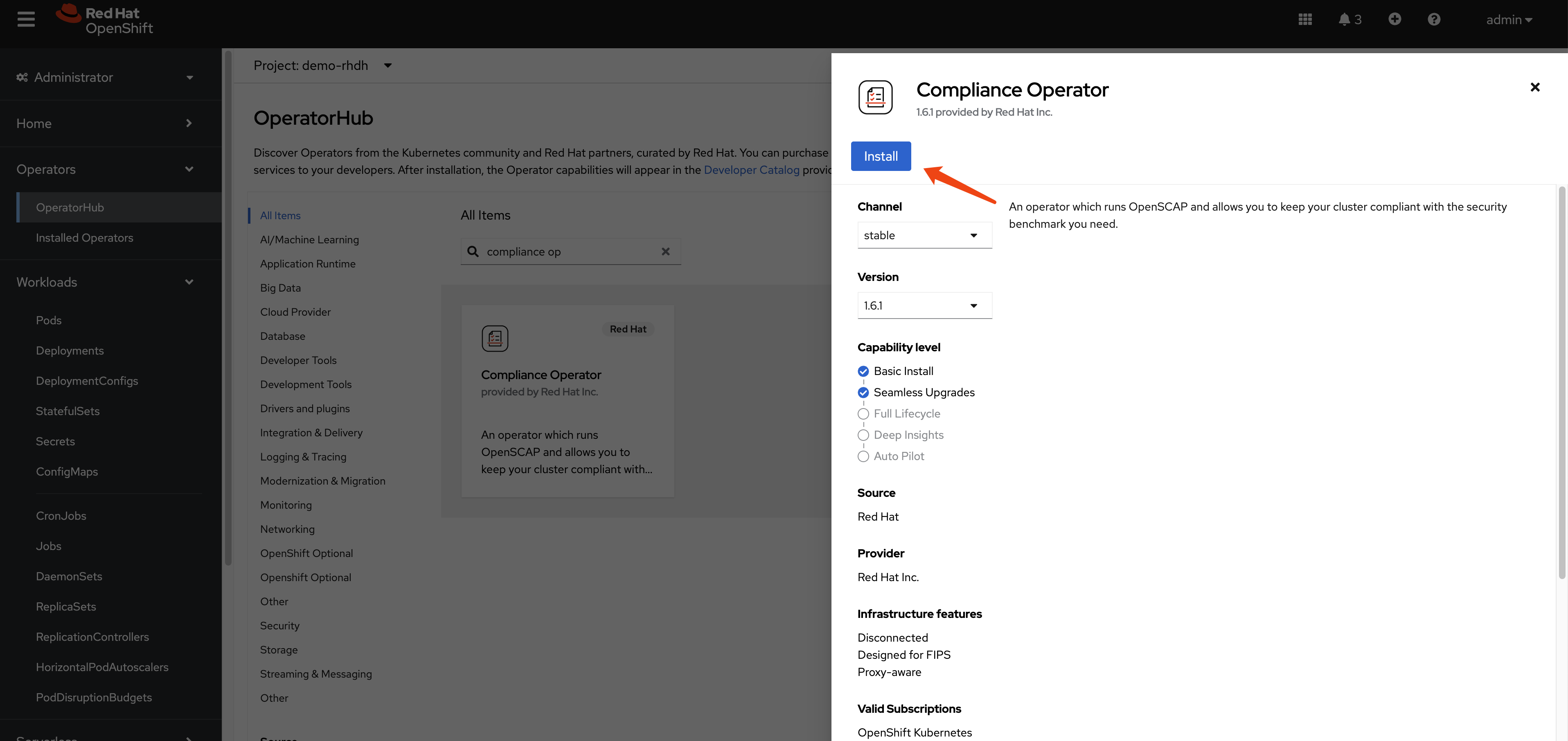 Select the compliance operator from the list of available operators and click on it to deploy it.