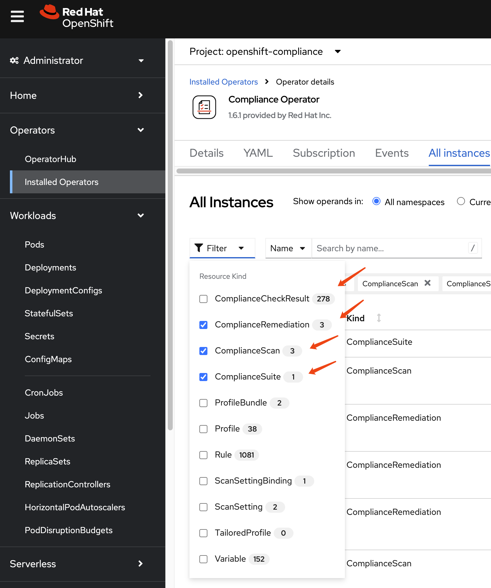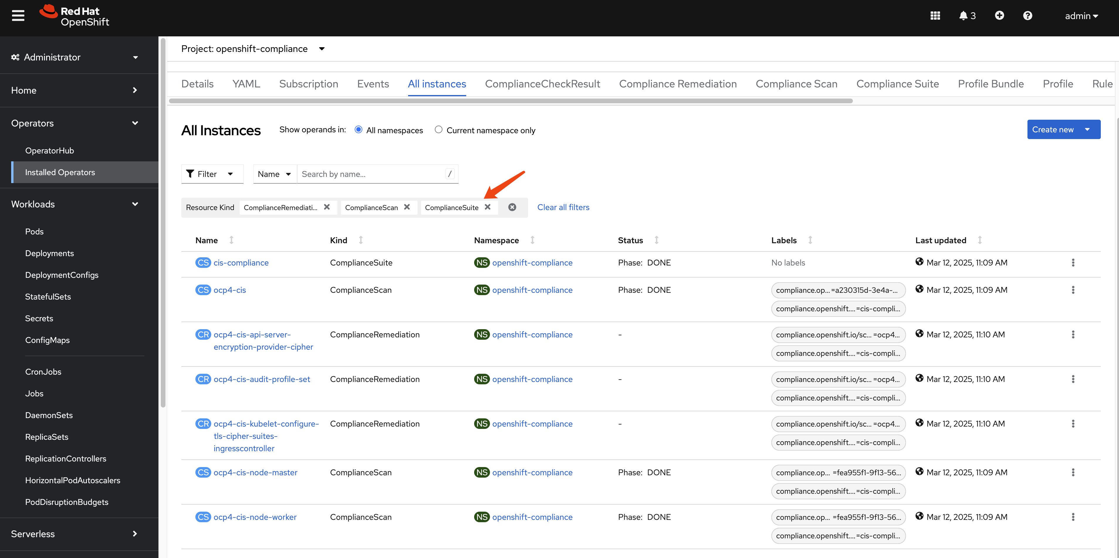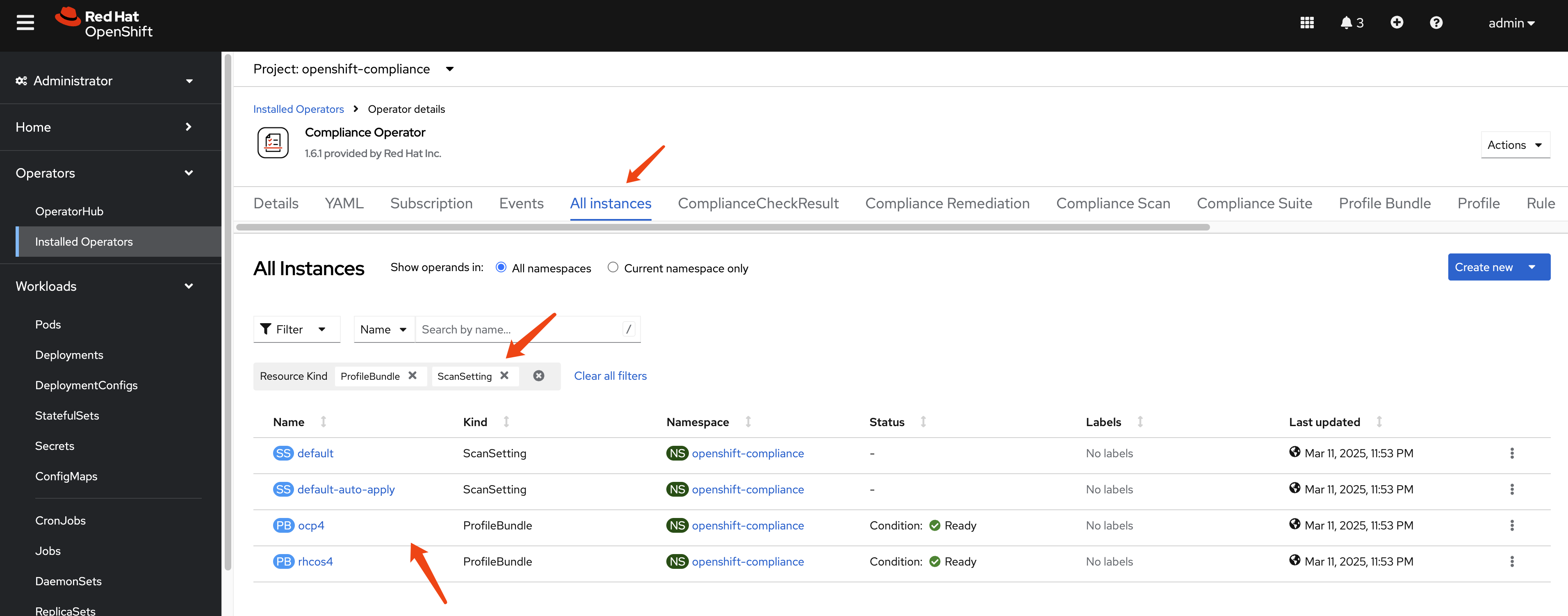 After the installation is complete, you can access the operator dashboard. In the all instances section, you can see a list of all the instances that have been deployed. We filter out profile bundle and scan setting, and we can see there are 2 instances each of them deployed.