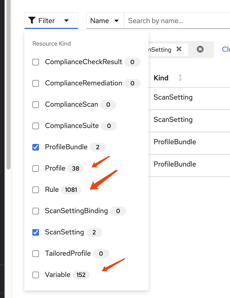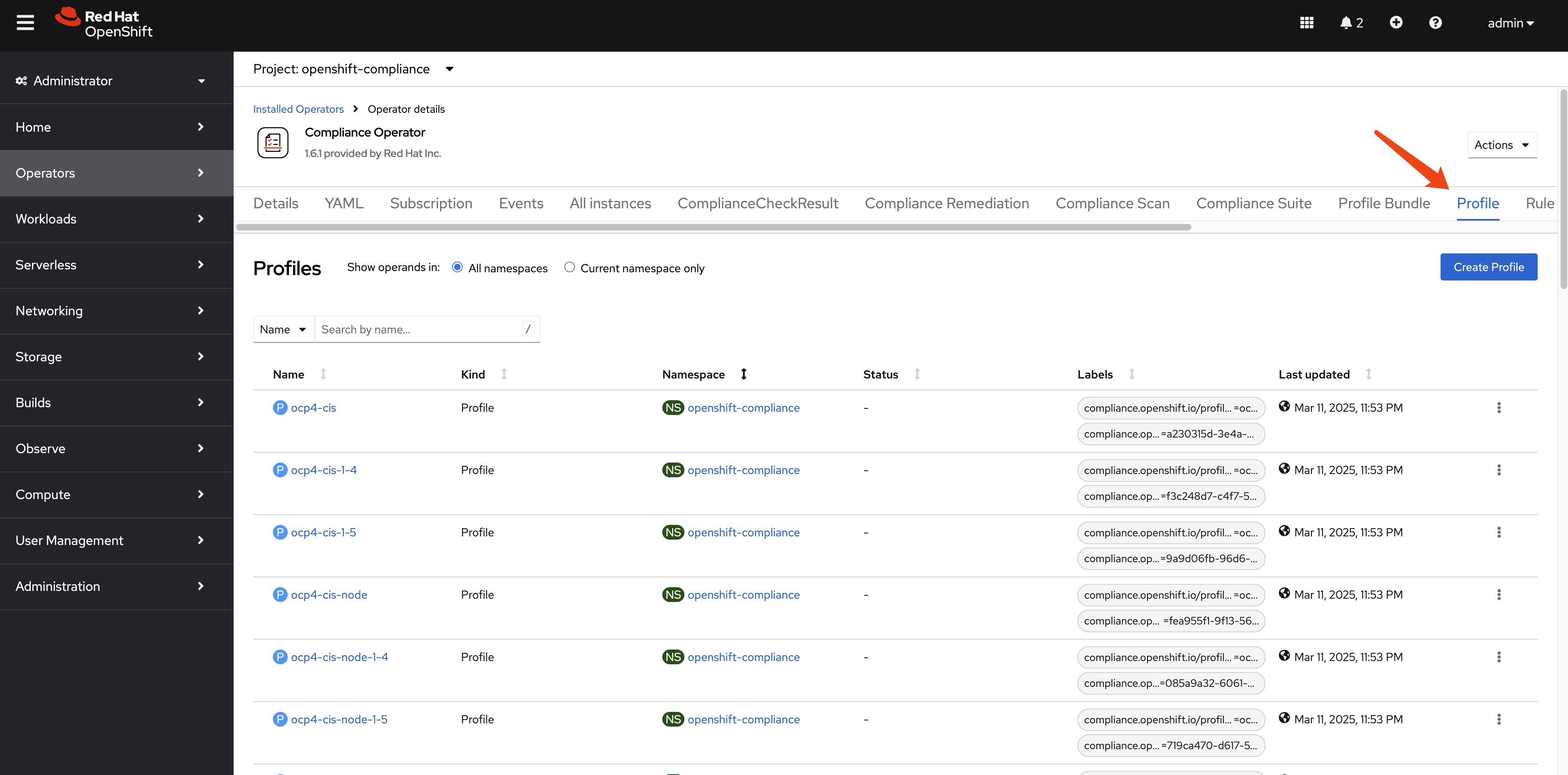 - Profile: Represents a specific security standard implementation (e.g., ocp4-cis)