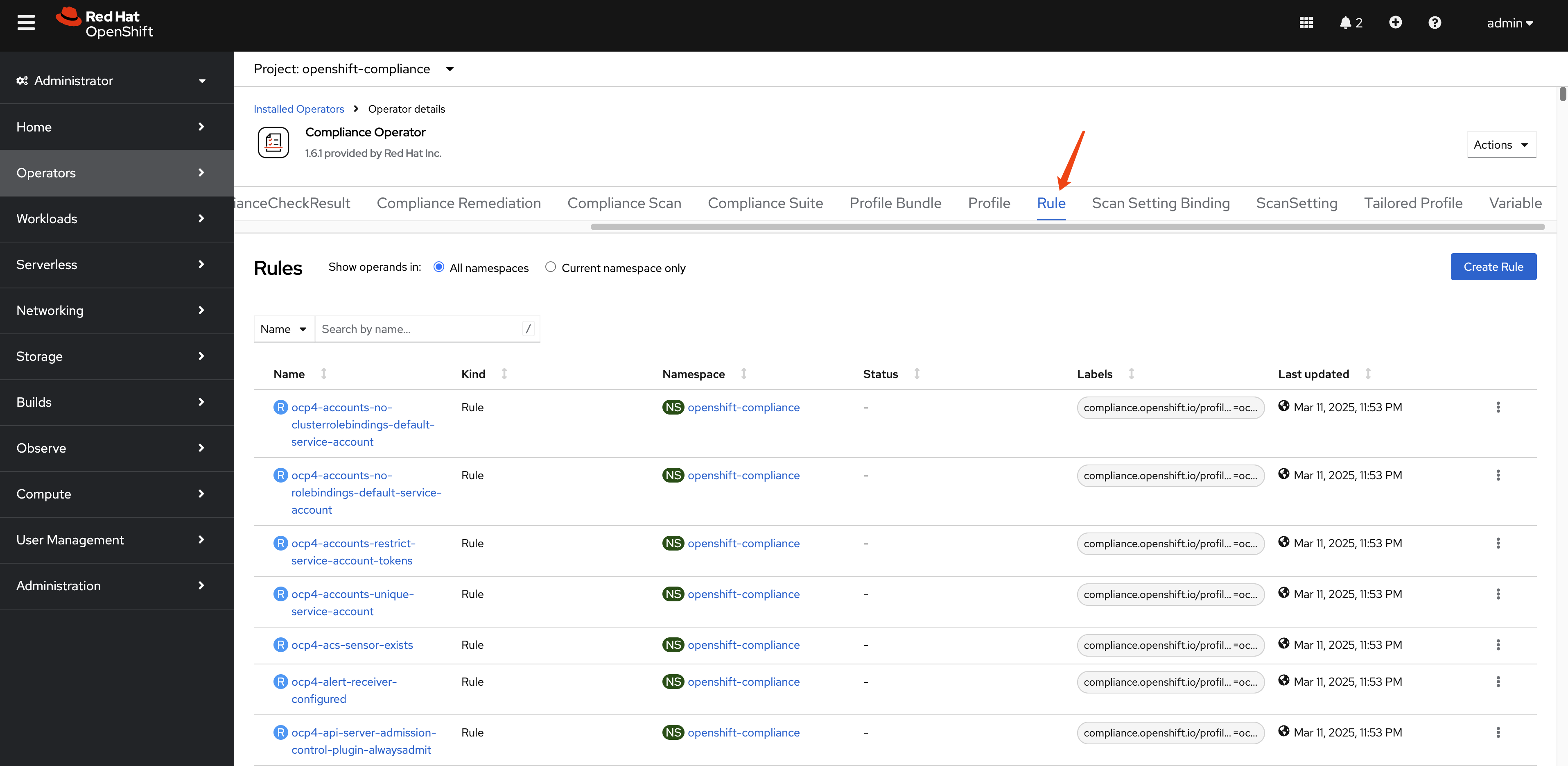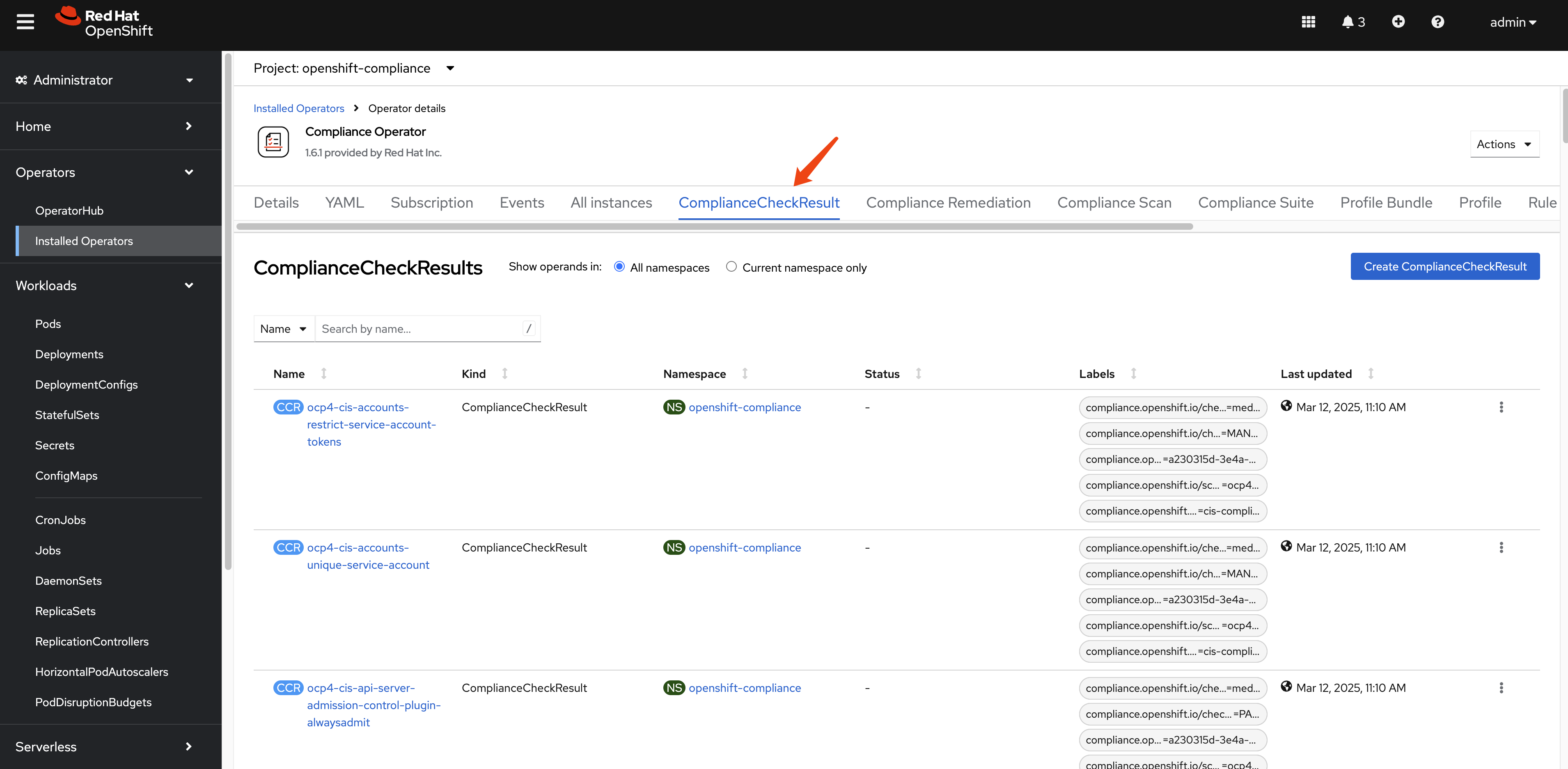 OpenShift 4 includes a powerful Compliance Operator that helps organizations monitor and enforce security compliance policies across the cluster. This operator implements industry-standard security benchmarks and provides mechanisms to assess your cluster’s compliance status and remediate issues.