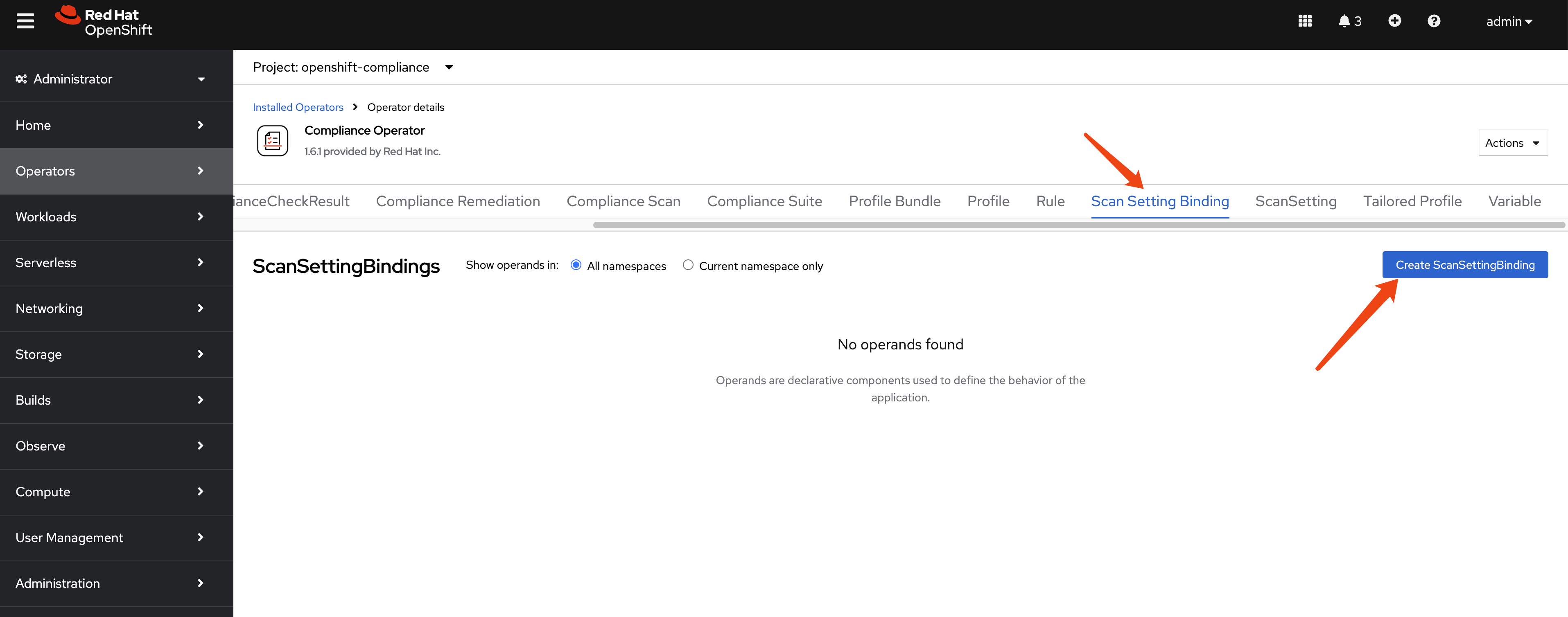 - ScanSettingBinding: Links profiles to scan settings to create a compliance suite