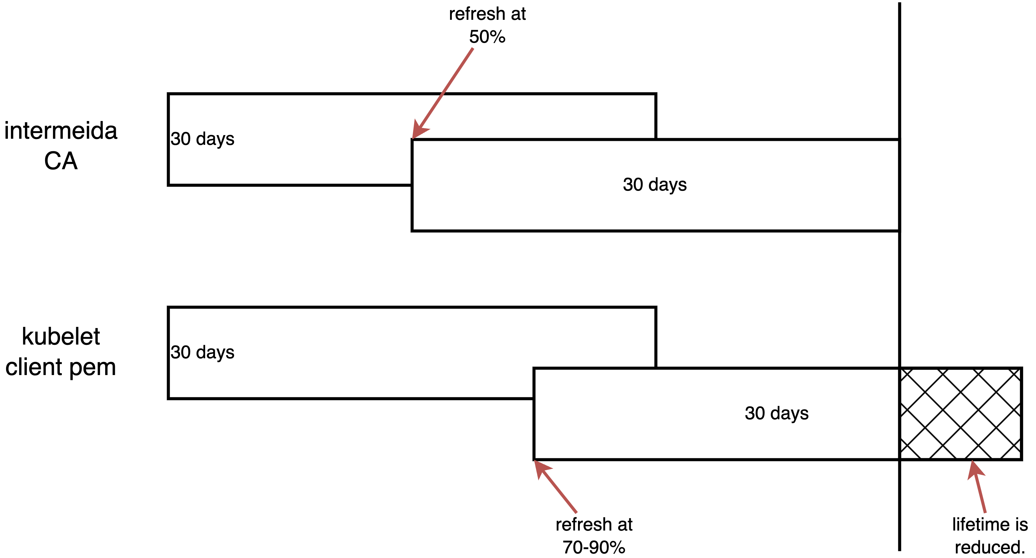 The intermediate CA has a 30-day lifetime and refreshes every 15 days. When Kubelet requests rotation of kubelet-client.pem at 70-90% of its 30-day lifetime, the intermediate CA may not have sufficient remaining validity to issue a new kubelet-client.pem for the full 30-day period. In such cases, it will issue a certificate valid only until the intermediate CA’s own notAfter time.