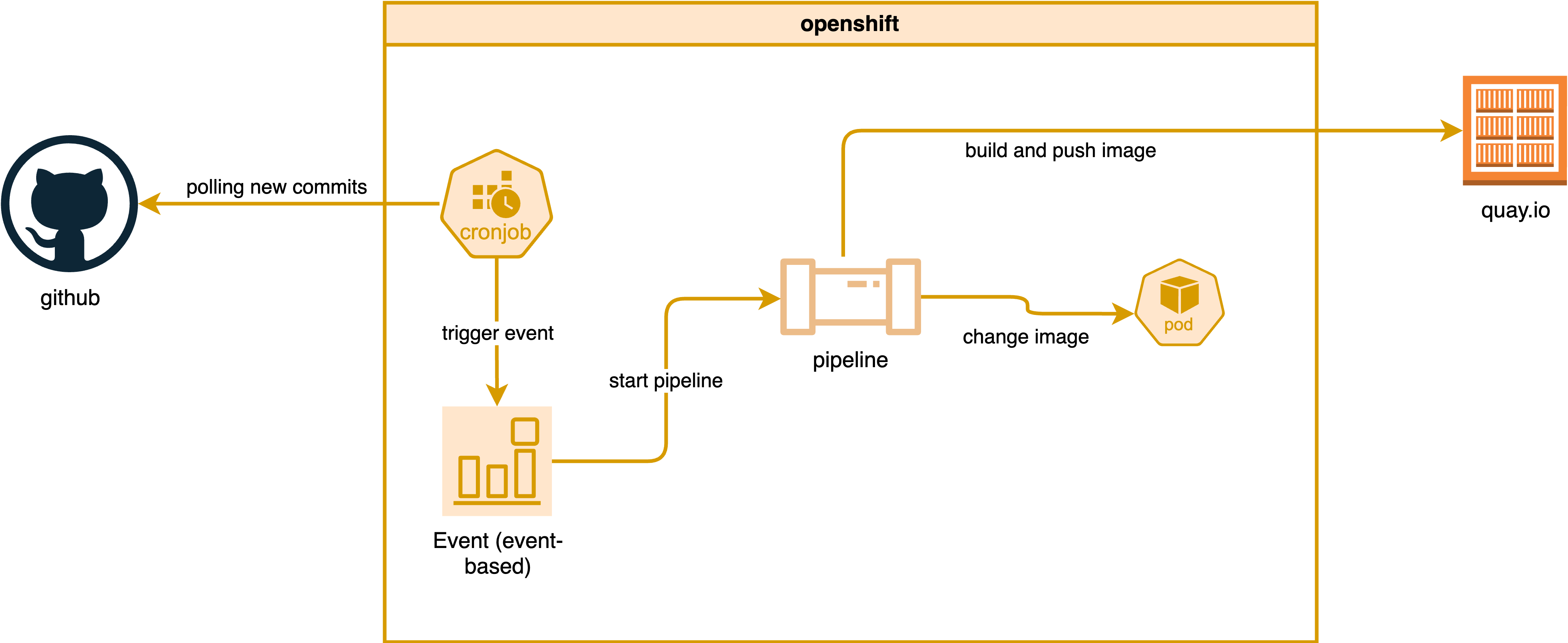 It also includes a cronjob that will repeatedly poll the repository every 5 minutes, fetch the latest commit hash, update the state ConfigMap, and curl the event listener if a new commit is detected.