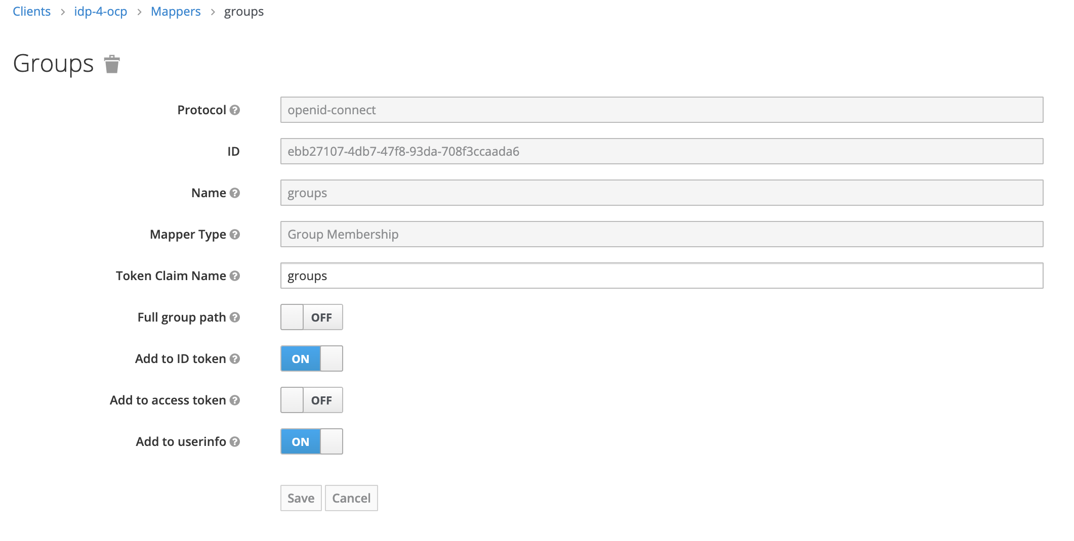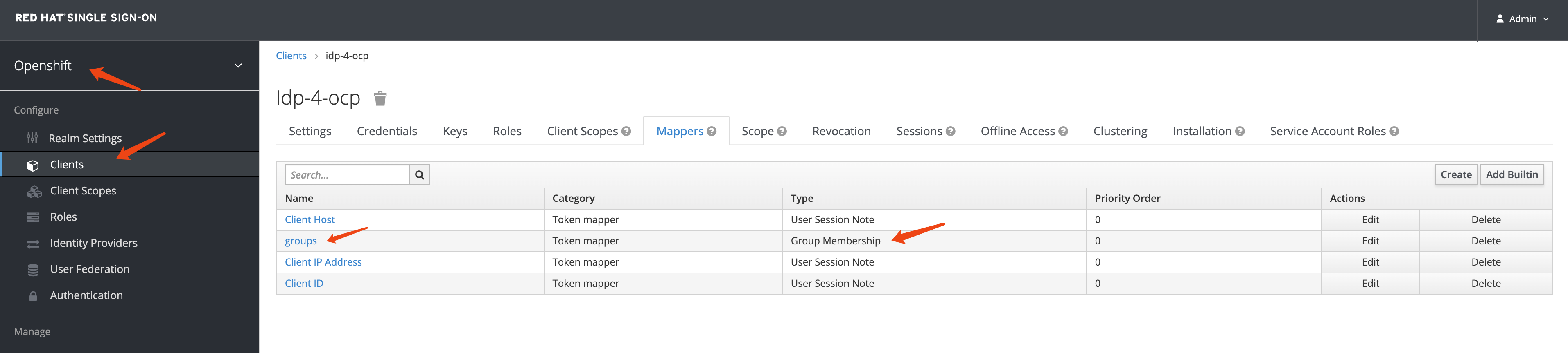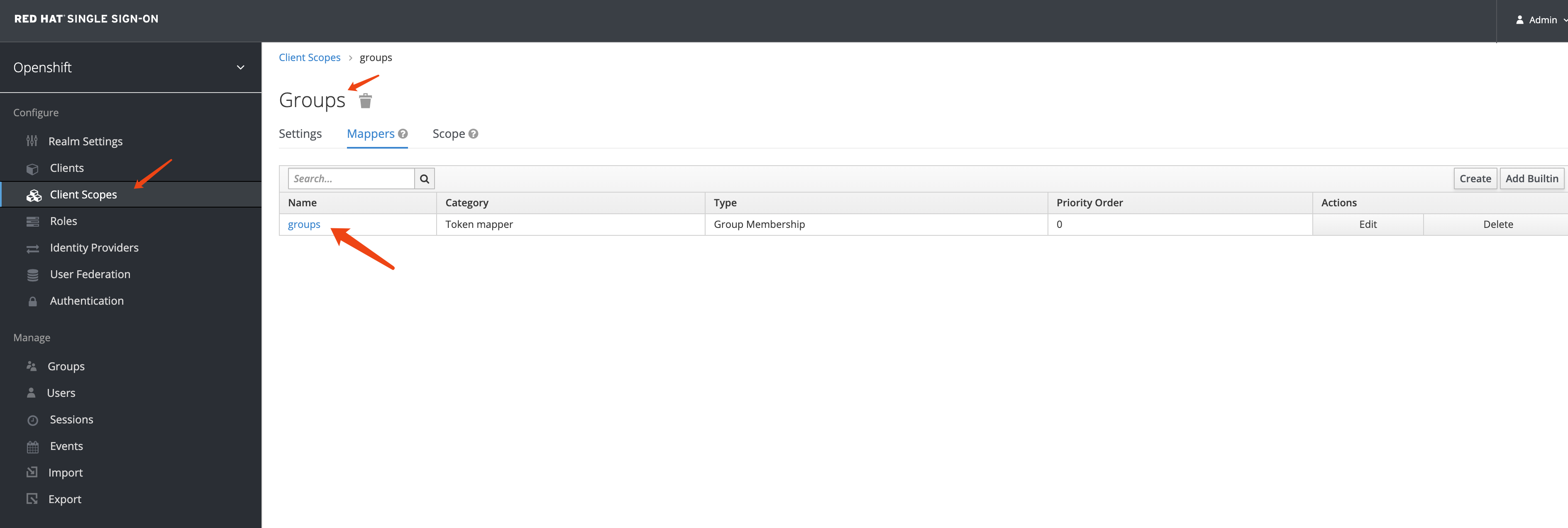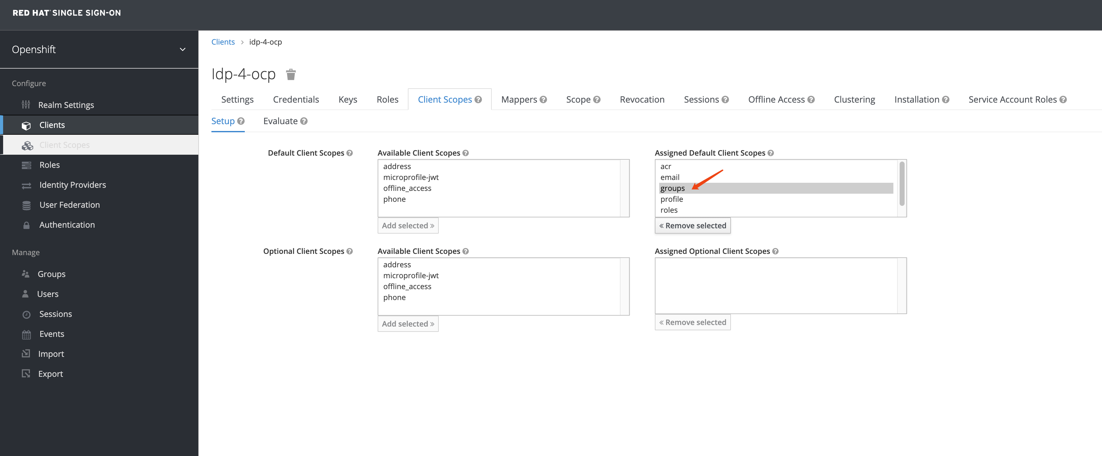 If you cannot see the groups created in OCP, you can add a client scope in RH-SSO.