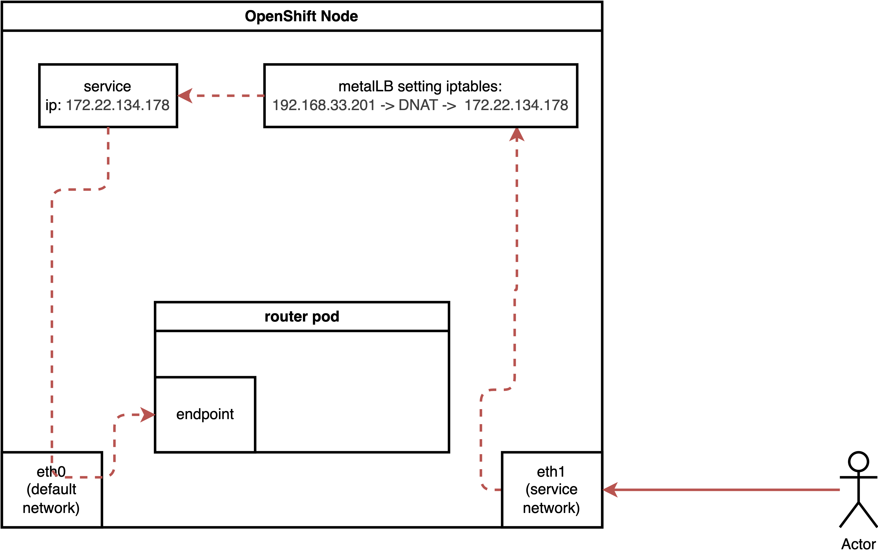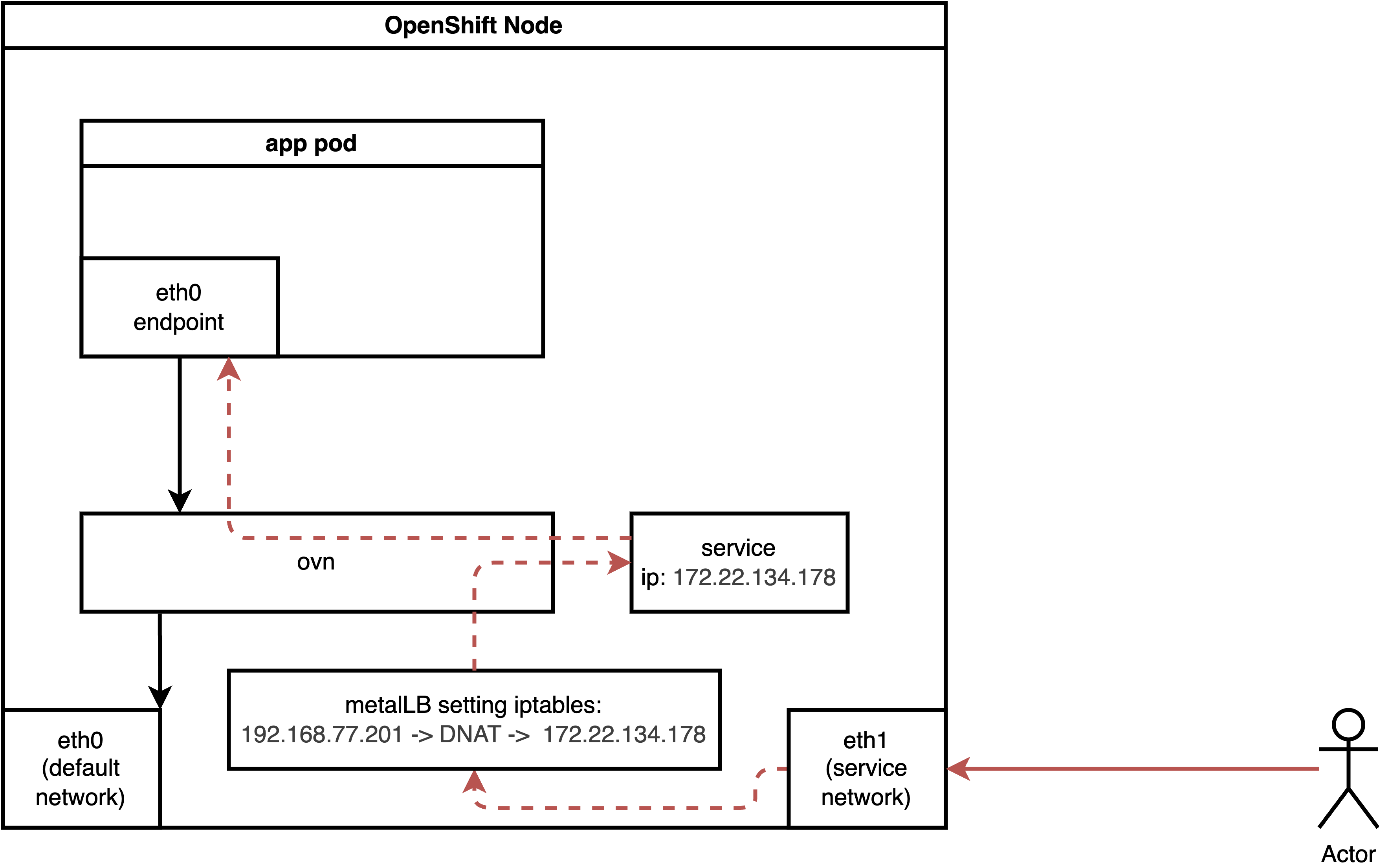 Ingress traffic will first encounter an iptables NAT rule, which redirects it via DNAT to the service IP. The traffic then enters the OVN network, where another DNAT rule (within the OVN network/kmod) directs it to the actual endpoint.
