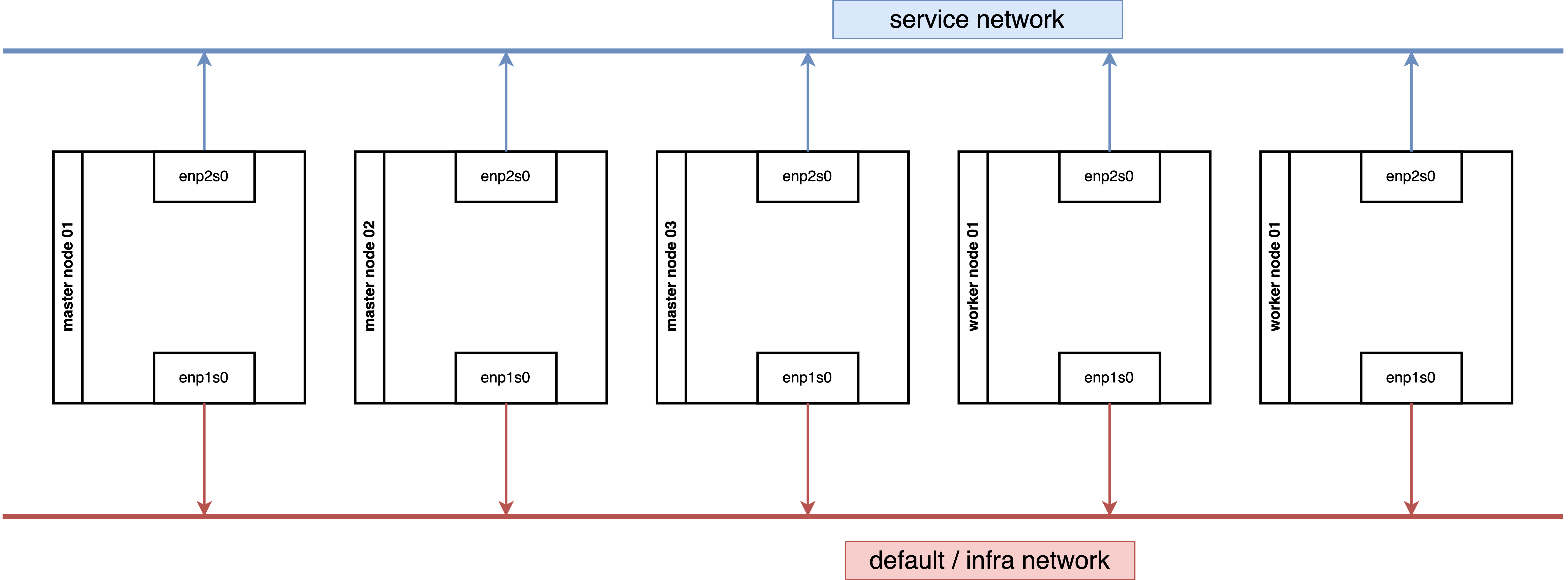 We tested a configuration where both 3 master nodes and 2 worker nodes are connected to two networks.