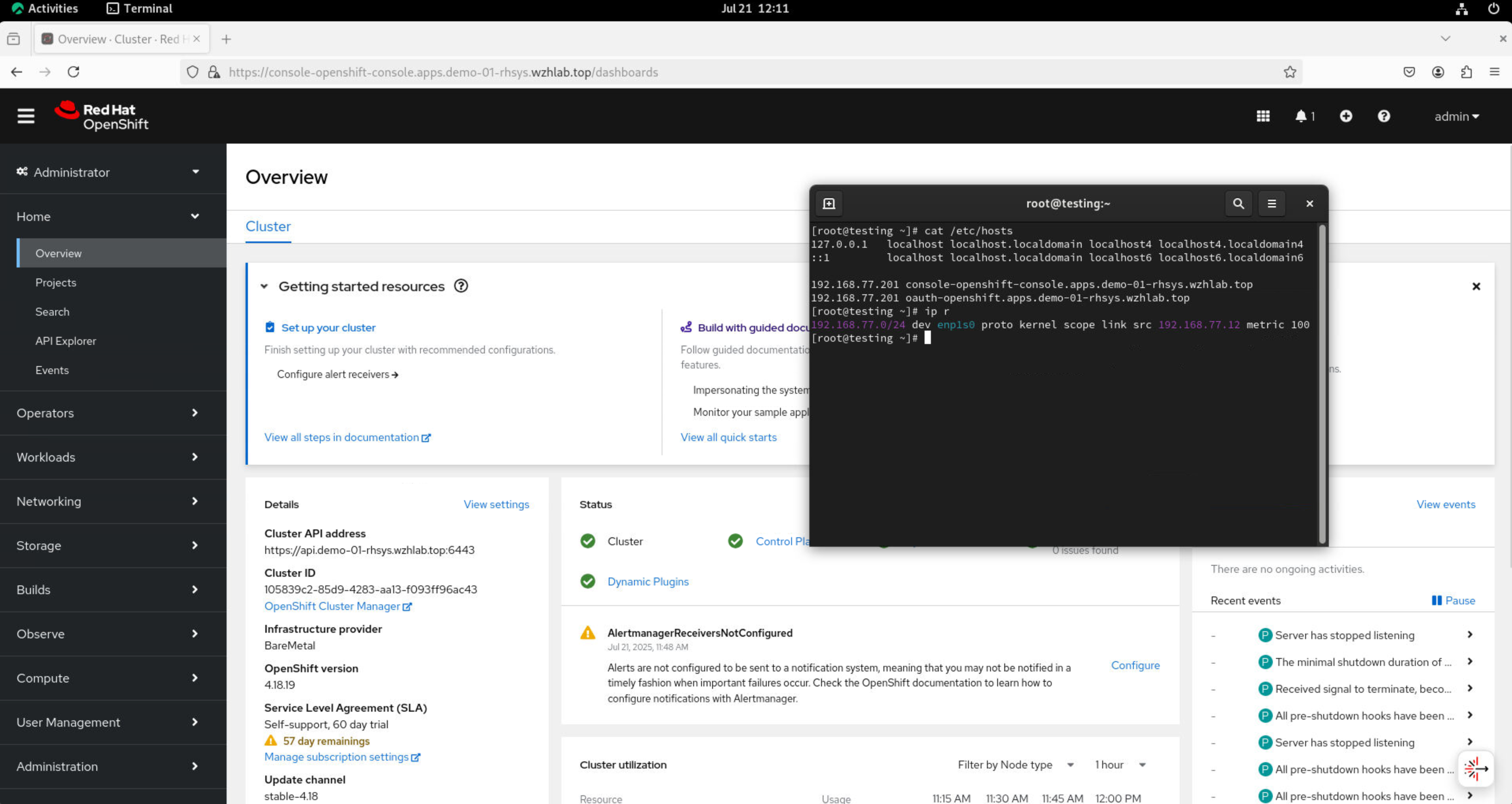 curl -v --insecure --resolve console-openshift-console.apps.demo-01-rhsys.wzhlab.top:443:192.168.77.201 https://console-openshift-console.apps.demo-01-rhsys.wzhlab.topOn the testing node’s console, you can open a browser and access the console. Additionally, you can examine the host and IP route settings to confirm that traffic is confined to the 192.168.77.* network segment.