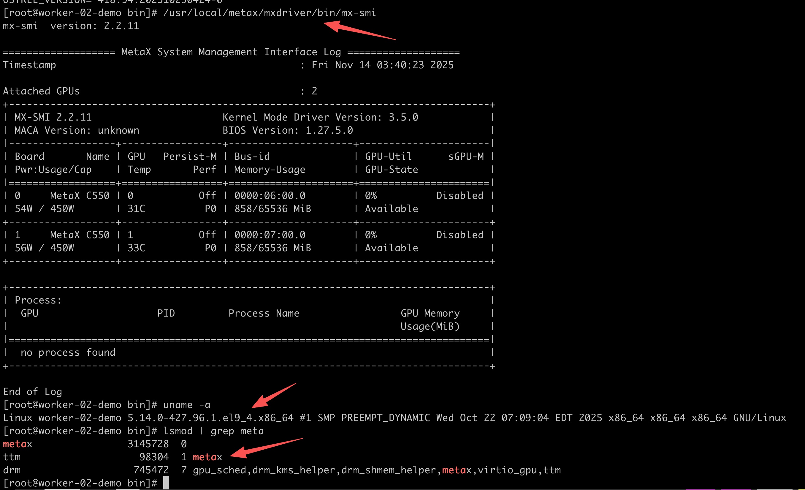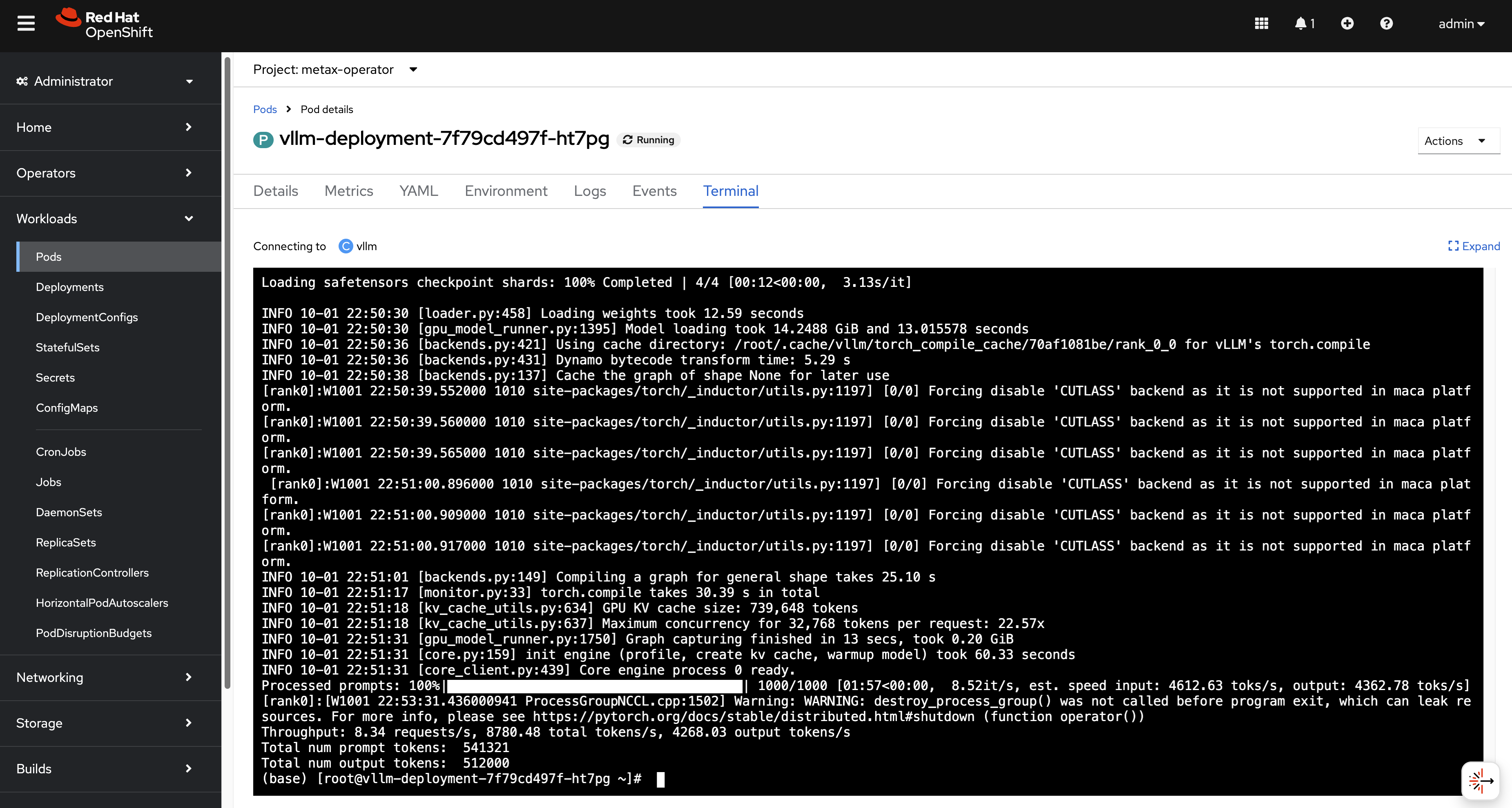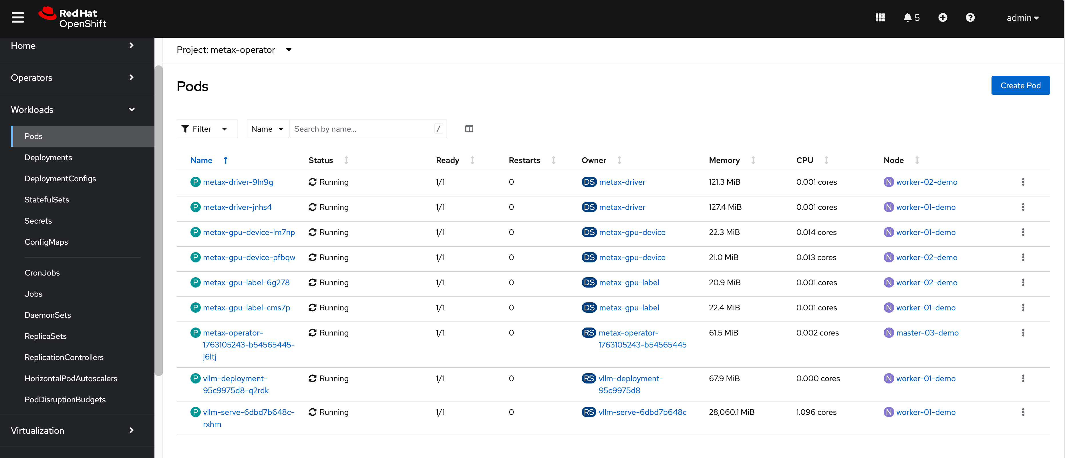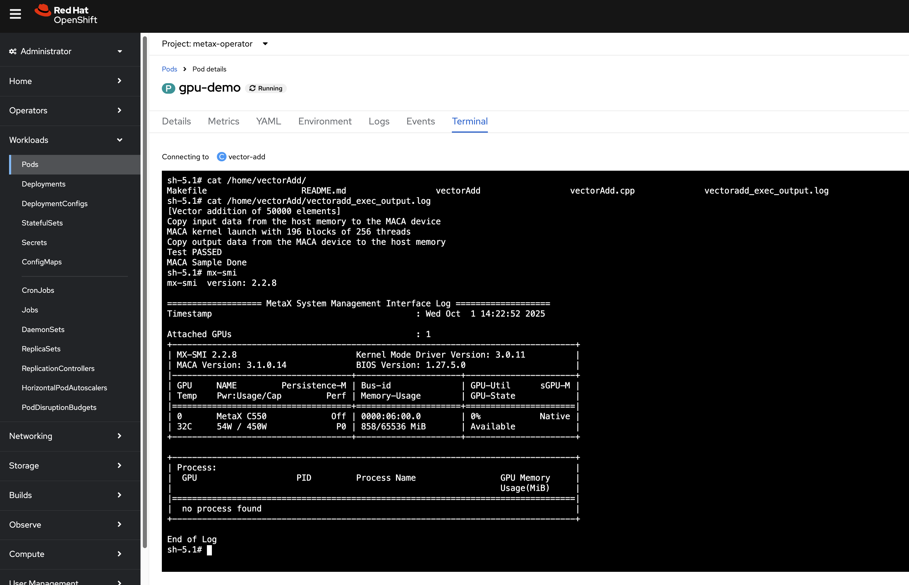 This document provides a comprehensive guide for integrating Metax GPUs with an OpenShift Container Platform 4.18 cluster. Metax, a GPU vendor similar to NVIDIA, offers hardware that performs well on standard RHEL environments. However, enabling Metax GPUs on OpenShift requires specific configurations and a custom Red Hat Enterprise Linux CoreOS (RHCOS) image.