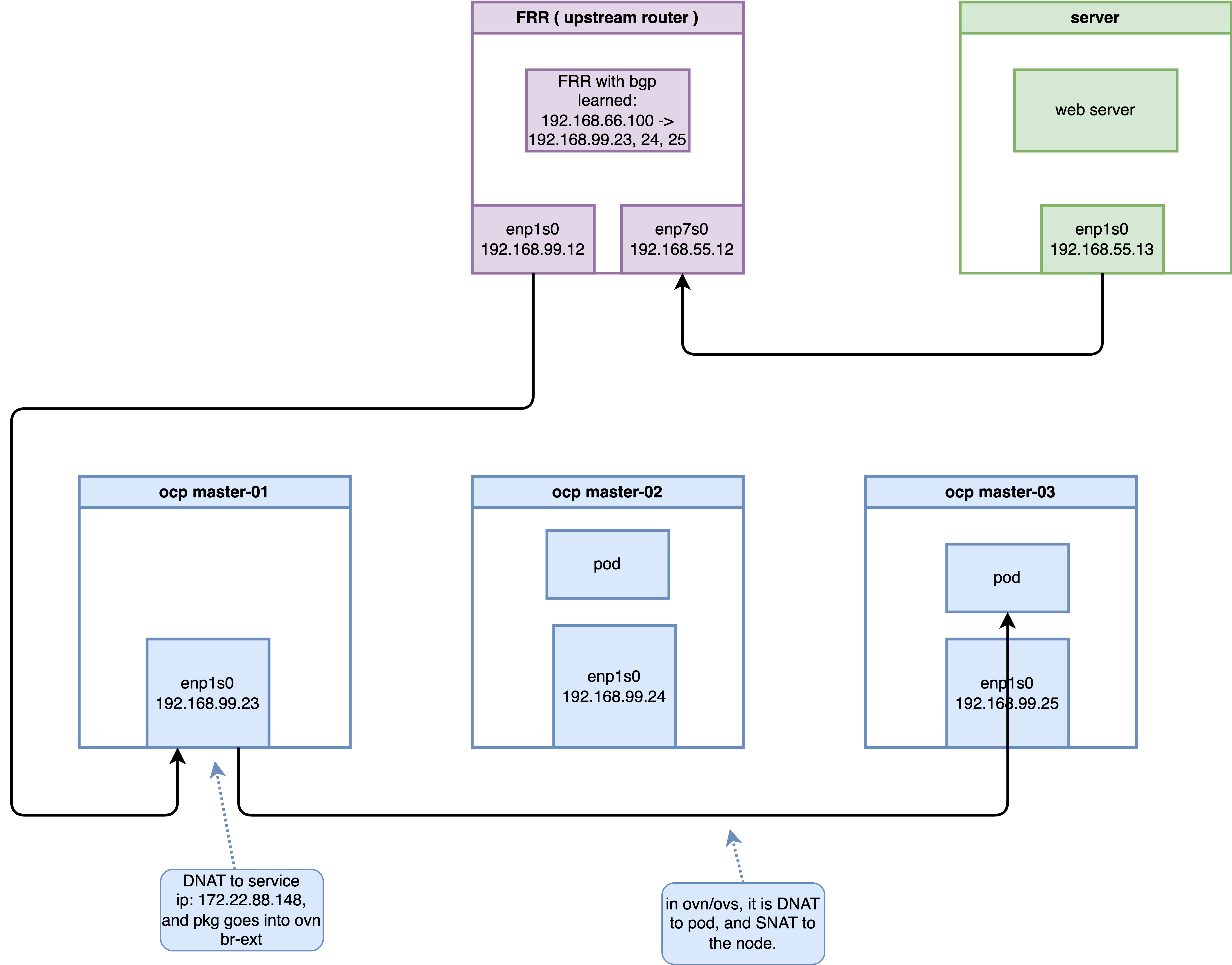 After DNAT, traffic enters GR_master-01-demo via br-ex. The GR is responsible for performing a second DNAT on the ClusterIP and performing SNAT on the source IP (masquerading it as the Join IP).