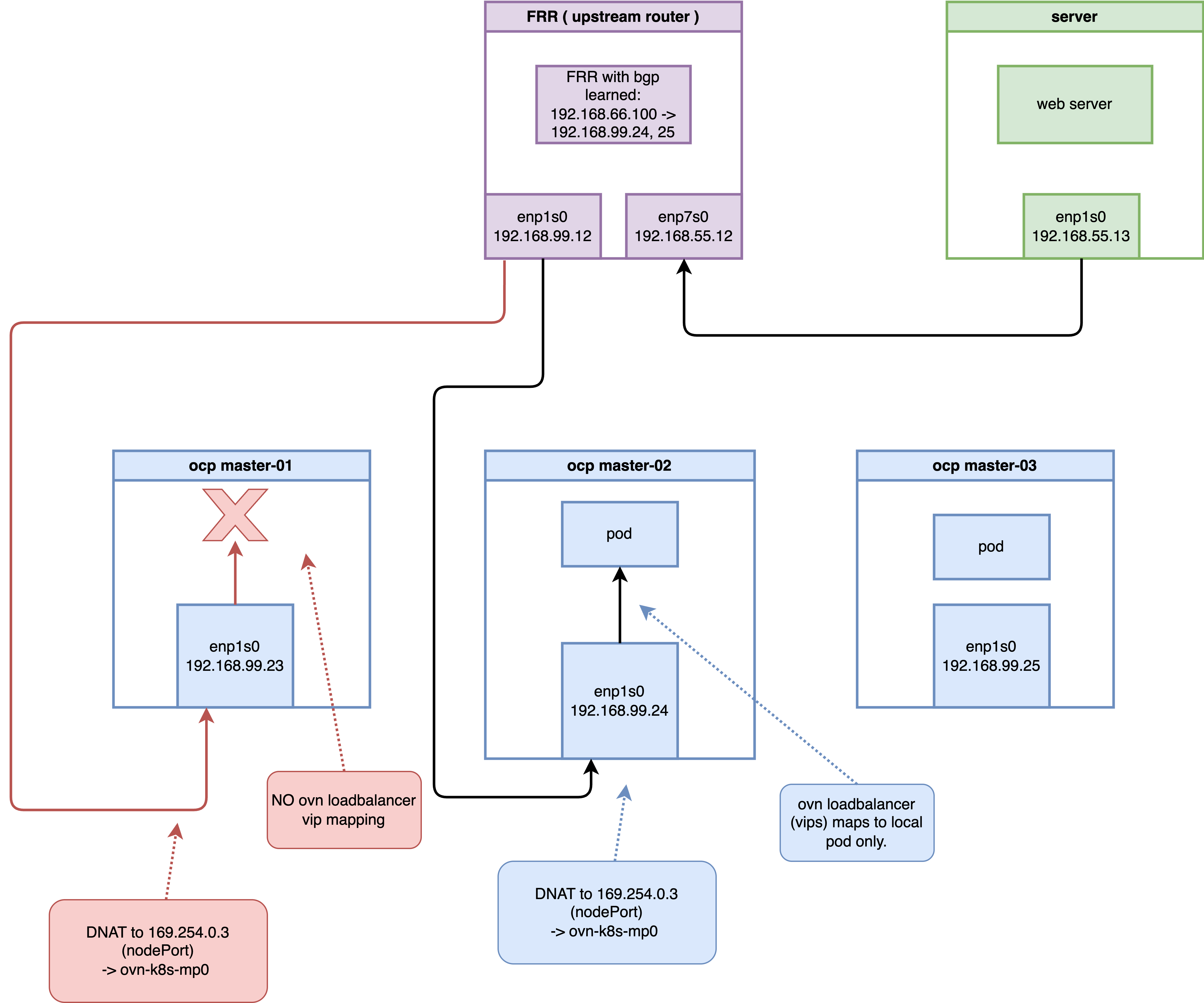 Force traffic to master-01 (no local Pods) via static route: