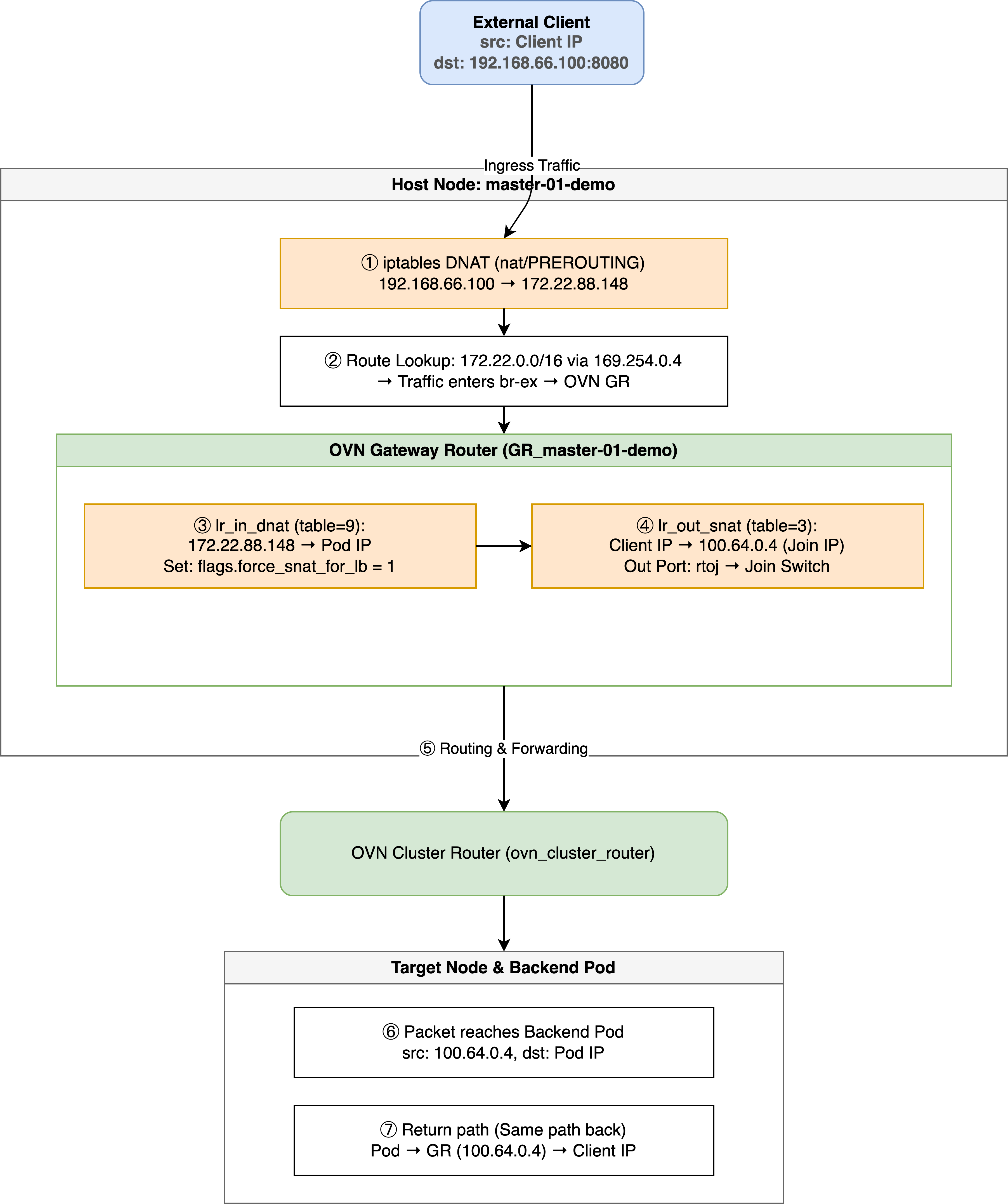 This document reveals the complete processing chain through empirical analysis, from BGP route advertisement, to host-level Iptables interception, and finally to OVN/OVS logical flow forwarding, covering both Cluster and Local traffic policies.
