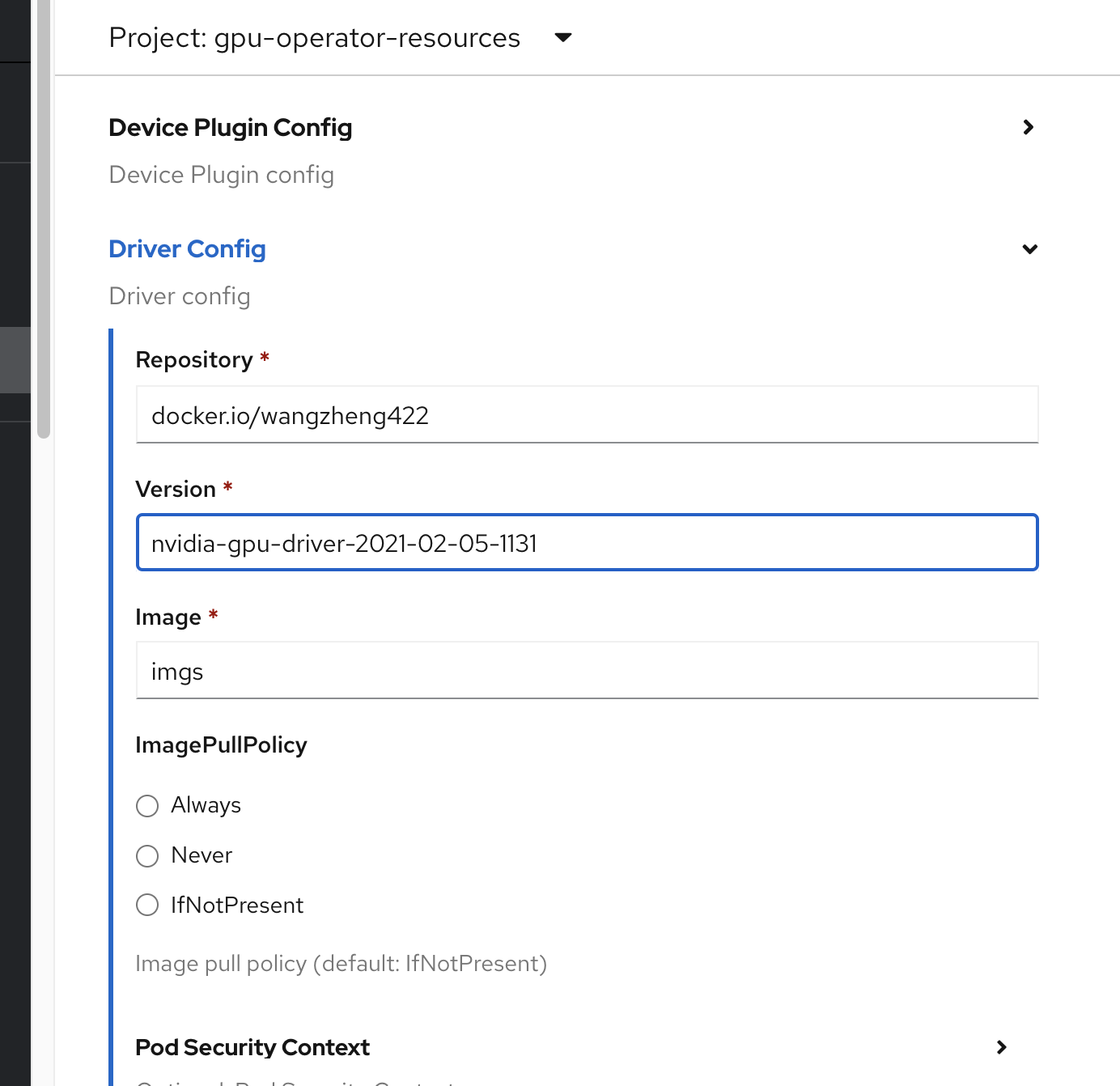 # docker.io/wangzheng422/imgs:nvidia-gpu-driver-2021-02-05-1131-rhcos4.6好了,我们最后制作好的镜像,使用tag的实话,注意要省略到后面的 rhcos4.6, 因为operator UI 会自动补全。