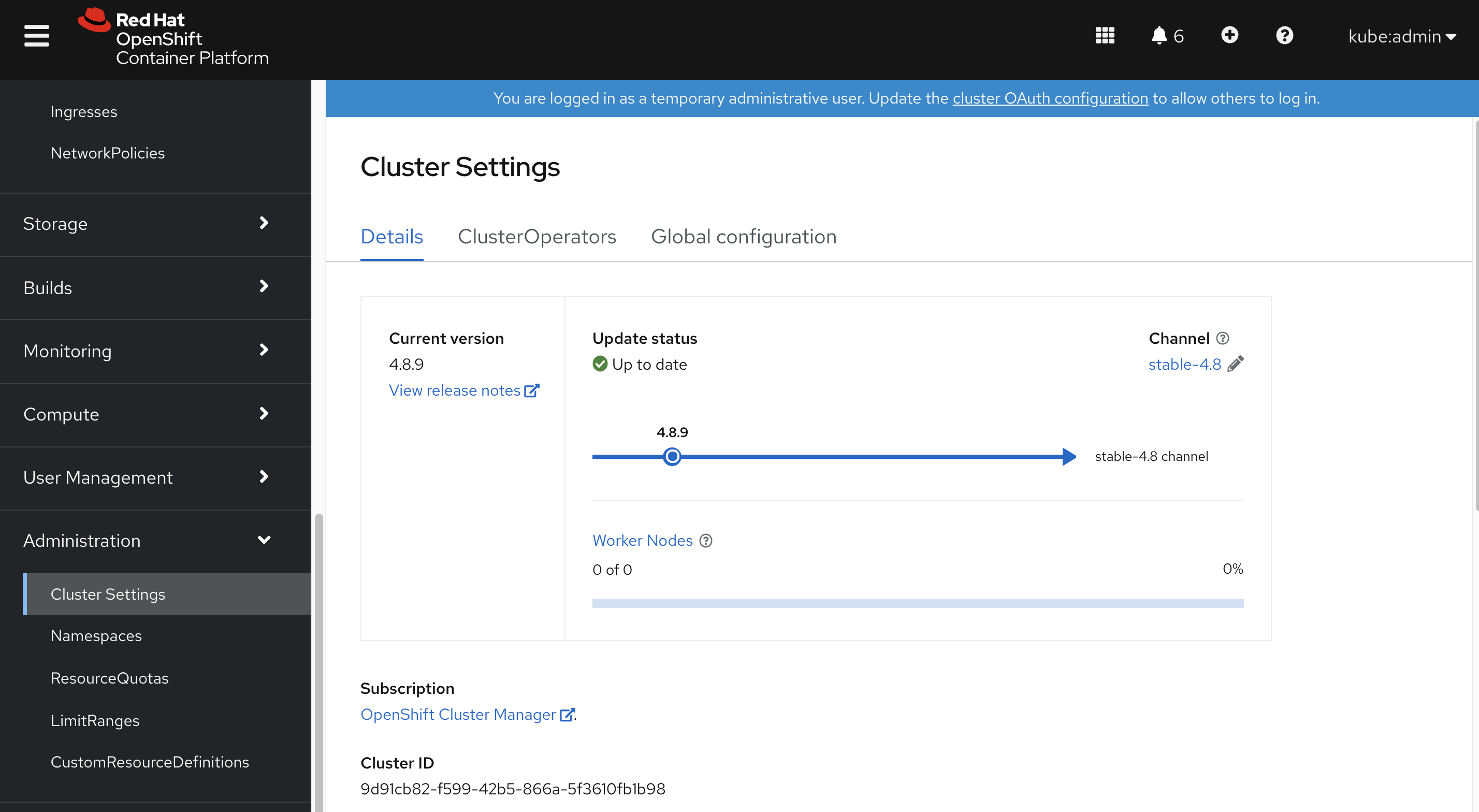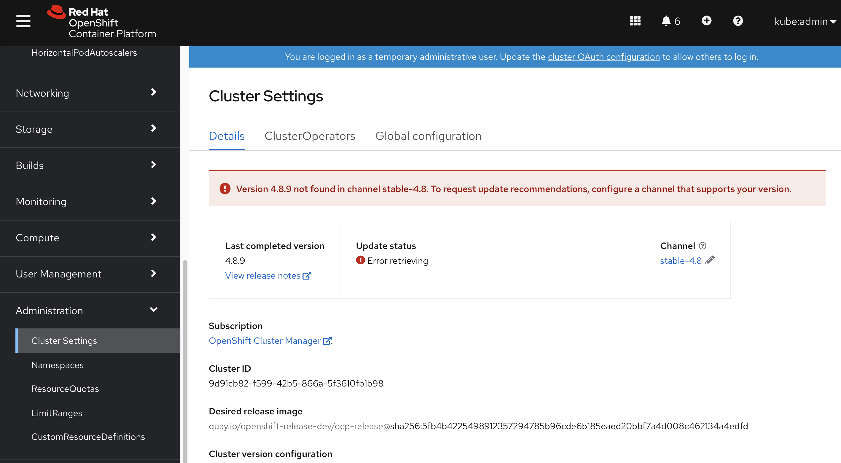 openshift4默认的集群管理界面,会向公网的升级服务请求升级信息,如果在离线安装的情况,这个升级信息是拿不到的,于是集群的管理界面就会一堆报错,很难看。现在openshift4有一个update server operator,这个可以在集群内部创建一个离线的update server,提供升级信息,这样集群的管理界面就不会那么难看啦。