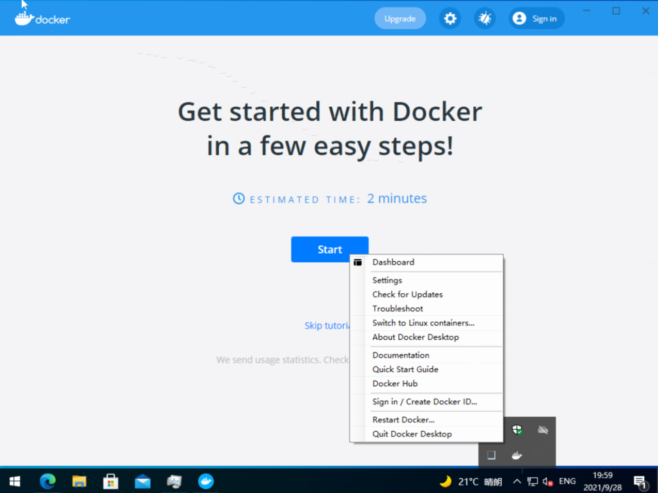 第一次启动docker,会说什么wsl2 linux kernel要更新,可以用我提供的文件,直接更新,也可以直接切换windows container,不用理会那个报警。
